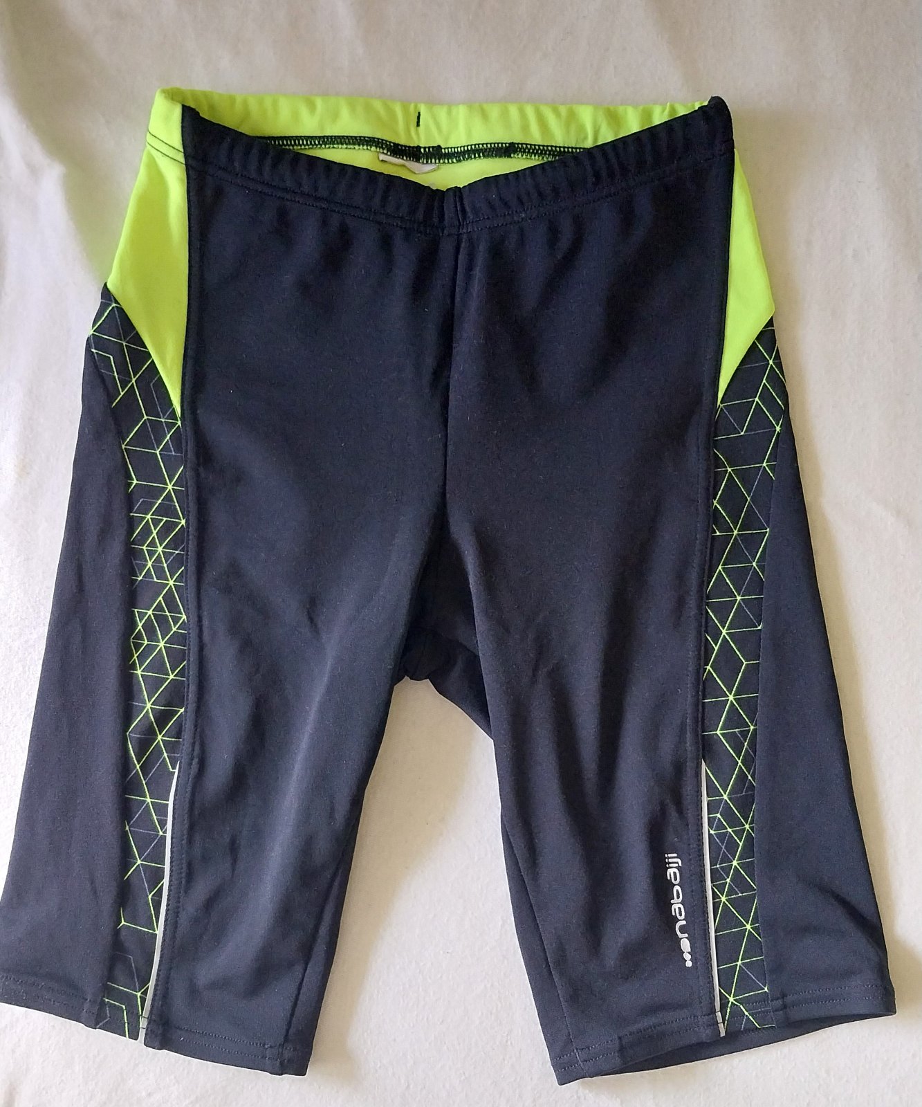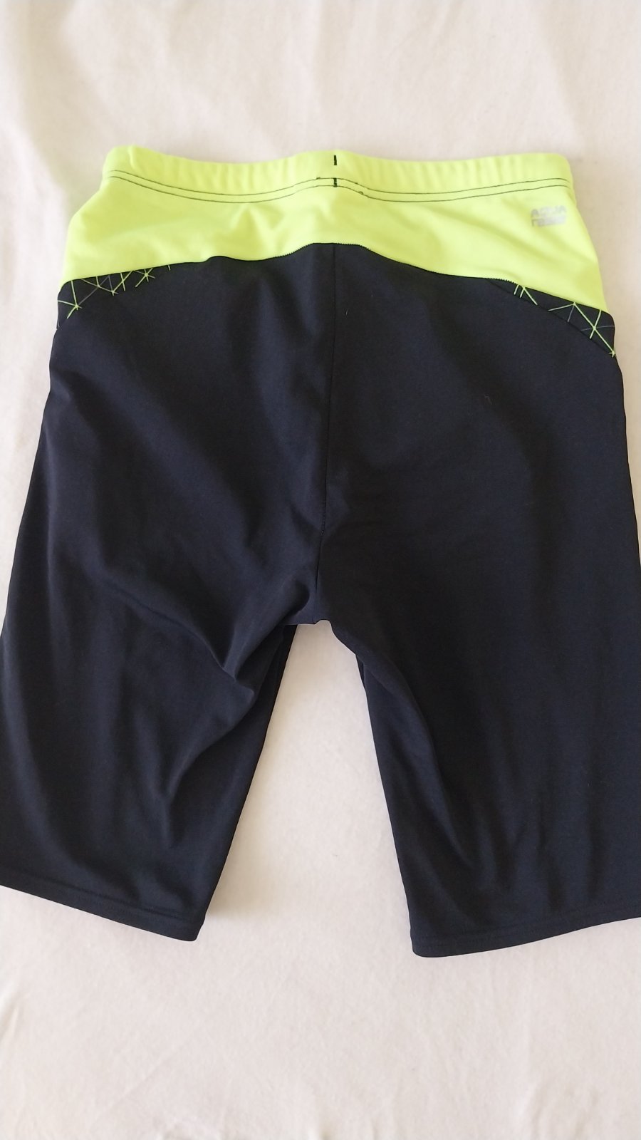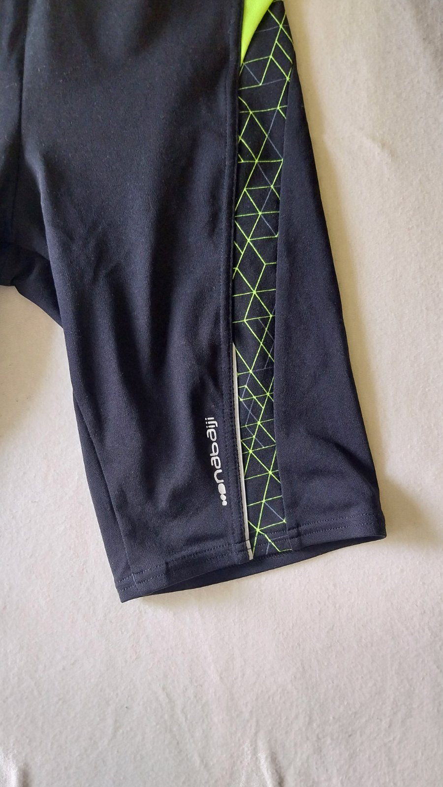 Dlhé plavky na plávanie, plavecké tréningy. Používané, ale v dobrom stave. Sú odolné vode a chlóru. Kvalitnejší materiál ako bežné plavky. Čierna farba s krikľavou žltou