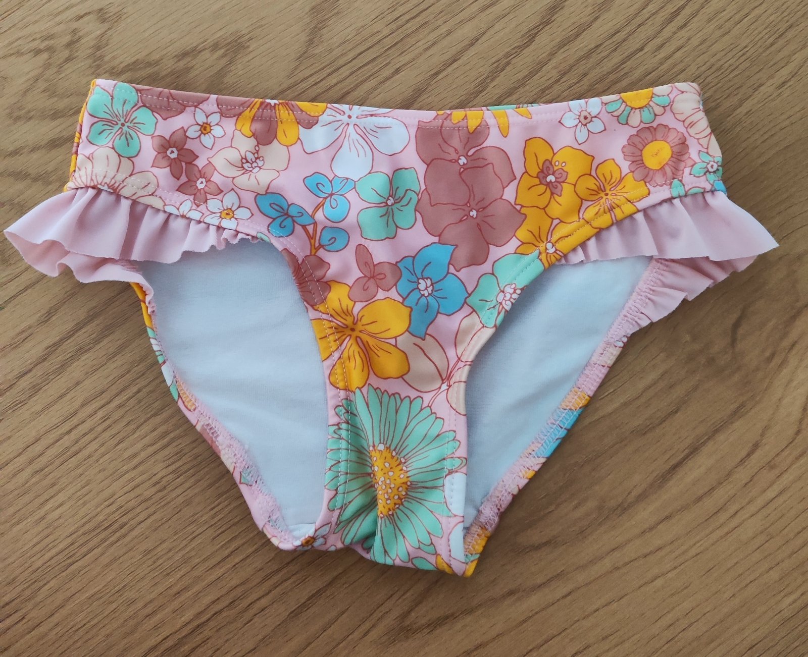 Nosený stav, vrch bez poškodení, nohavičky zozadu majú vyšuchanú látku zo šmykľavky v bazéne, poškodenie zohľadnené v cene, poškodenie odfotené na fotke č. 3 Veľkosť 110/116