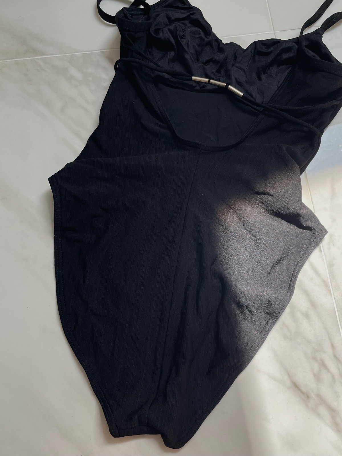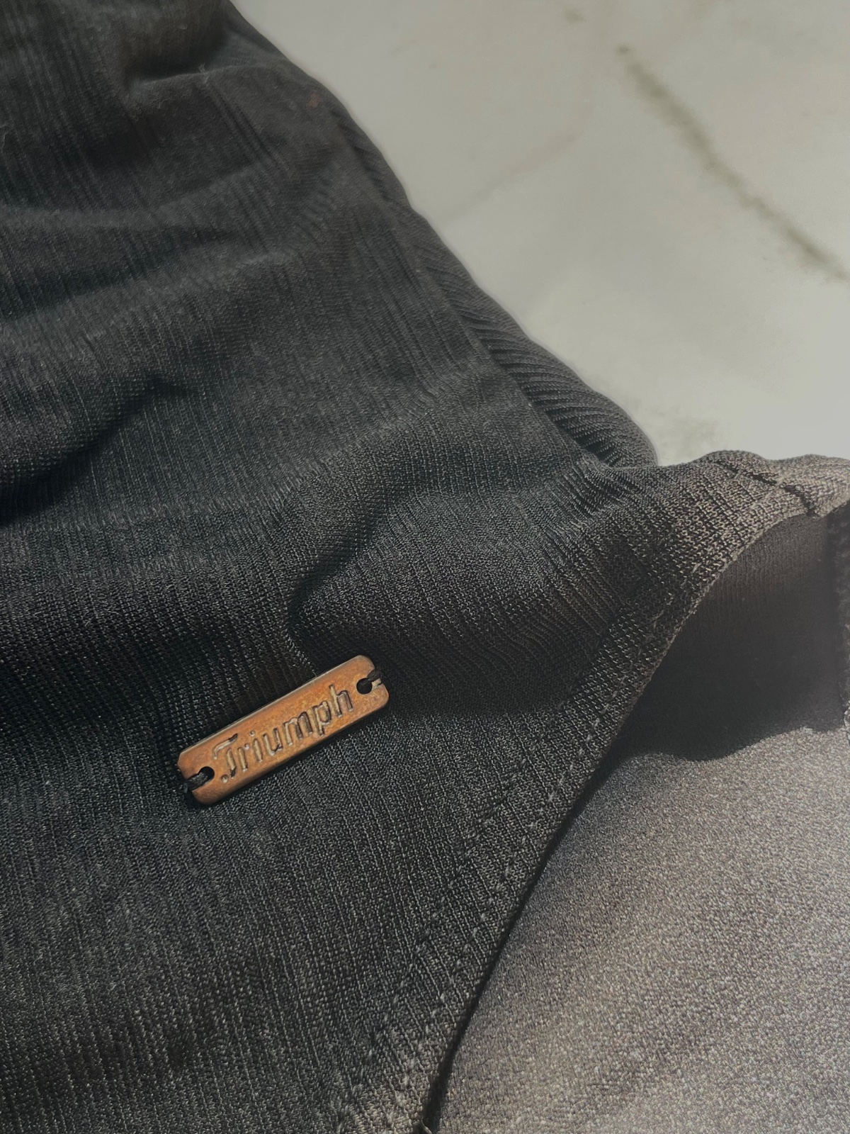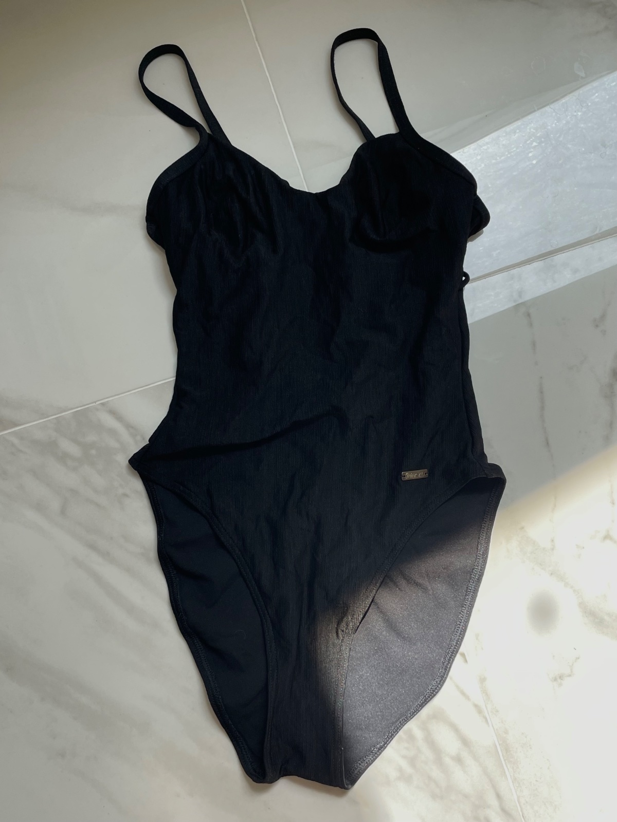 Elegantné čierne jednodielne plavky od značky Triumph v nadčasovom strihu. Materiál má jemnú rebrovanú štruktúru, ktorá pôsobí veľmi kvalitne a moderne. Plavky majú tenké ramienka a na boku decentný kovový detail s logom značky. Zadná časť je vykrojená a doplnená o zaväzovanie, ktoré umožňuje lepšie prispôsobenie postave. Sú minimálne nosené a vo výbornom stave, vhodné pre veľkosť S až menšie M. pekne formujú postavu.
