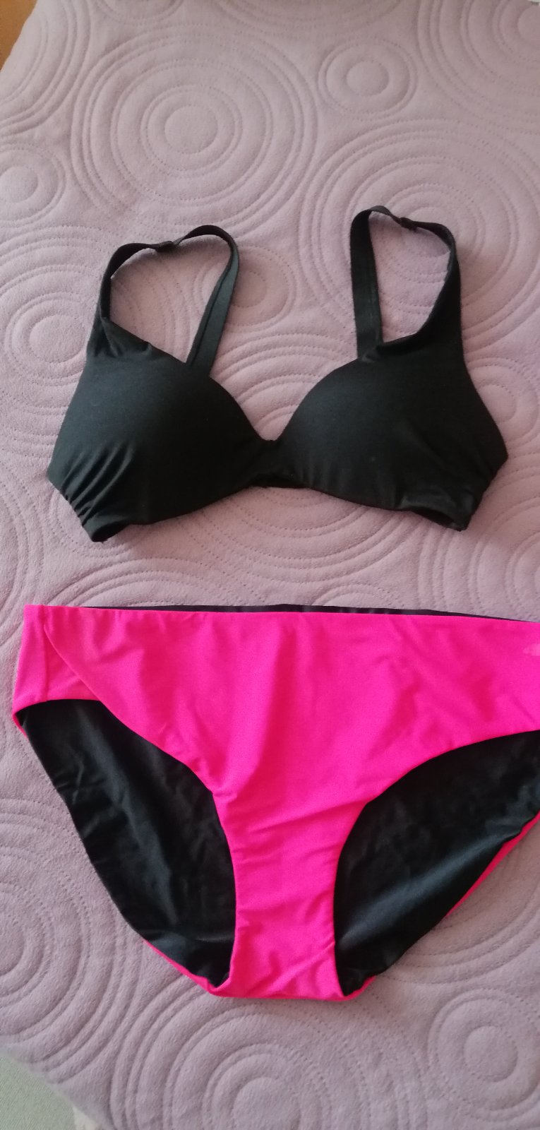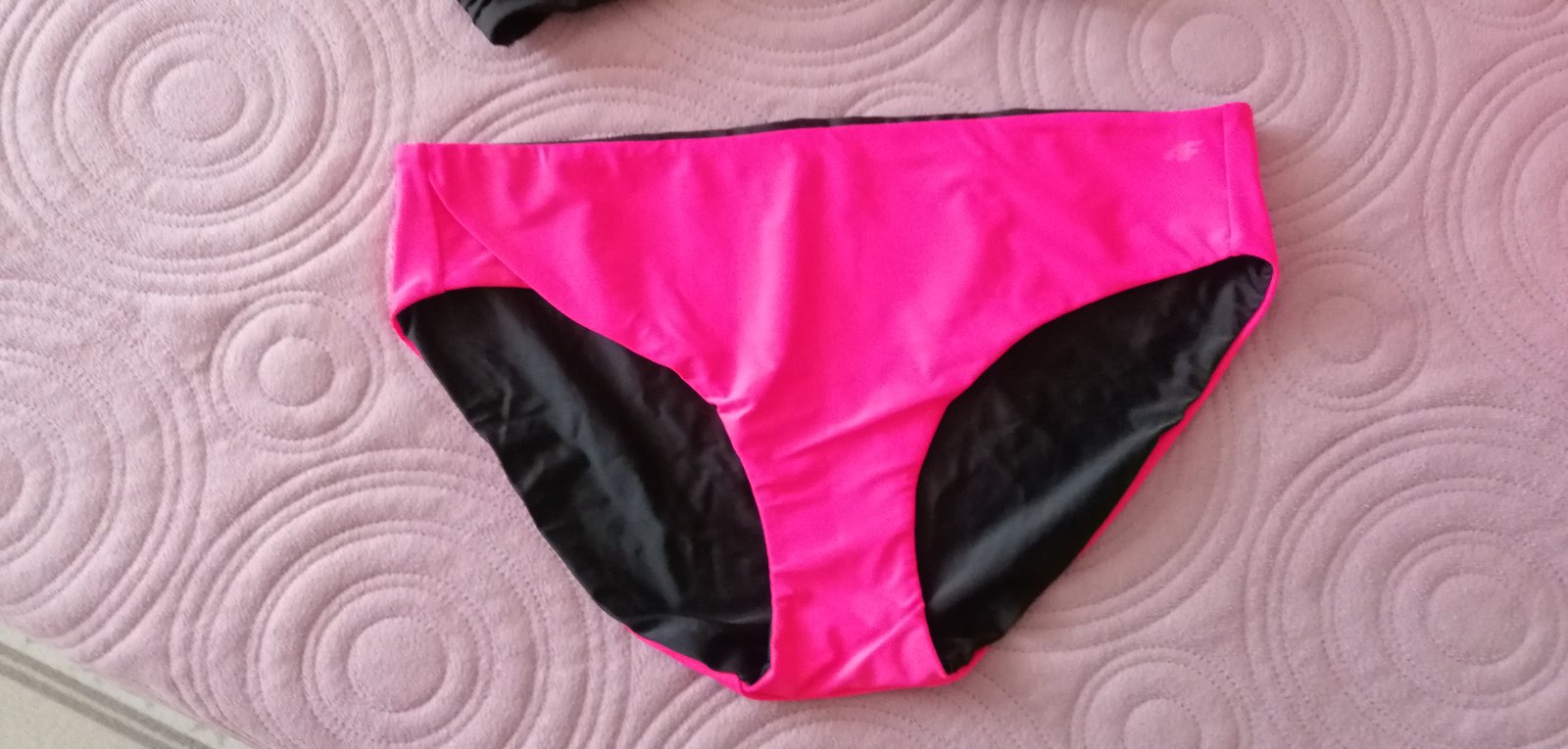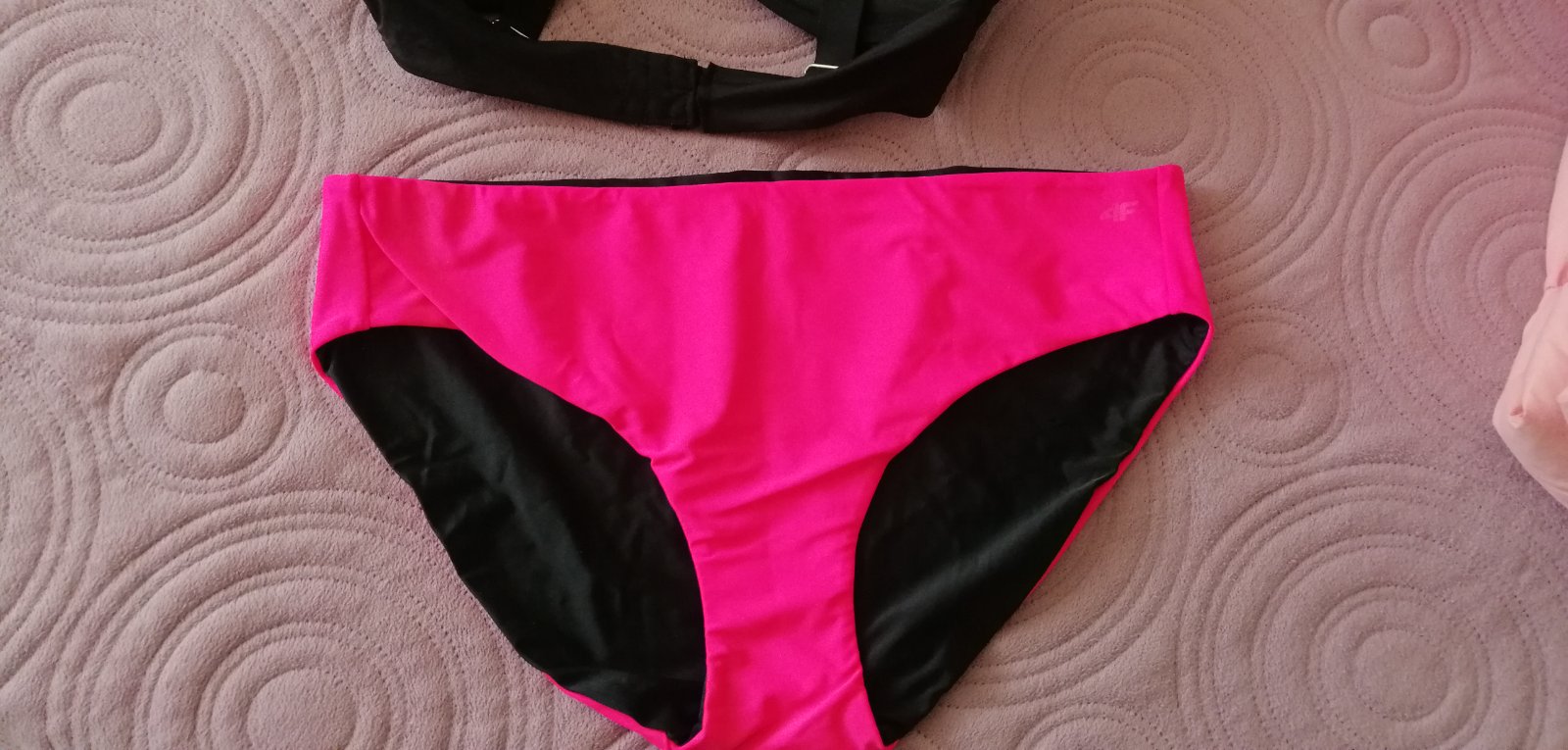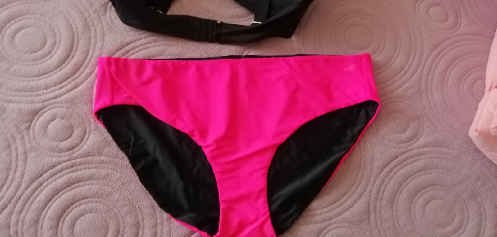 spodok obrovský pre mňa, na široké boky, väčší zadok tak 46/48, tak XXL, aj 3XL menšie, vrch je pevný, pohodlný, širšie pruhy, príjemná látka jemná, spodok 4F značka, krásne žiarivé, mne strašne veľké, aj keď mam širšie boky aj zadok, aj tak veľké. Vrch, podprsenka je šitá na pevno vzadu.