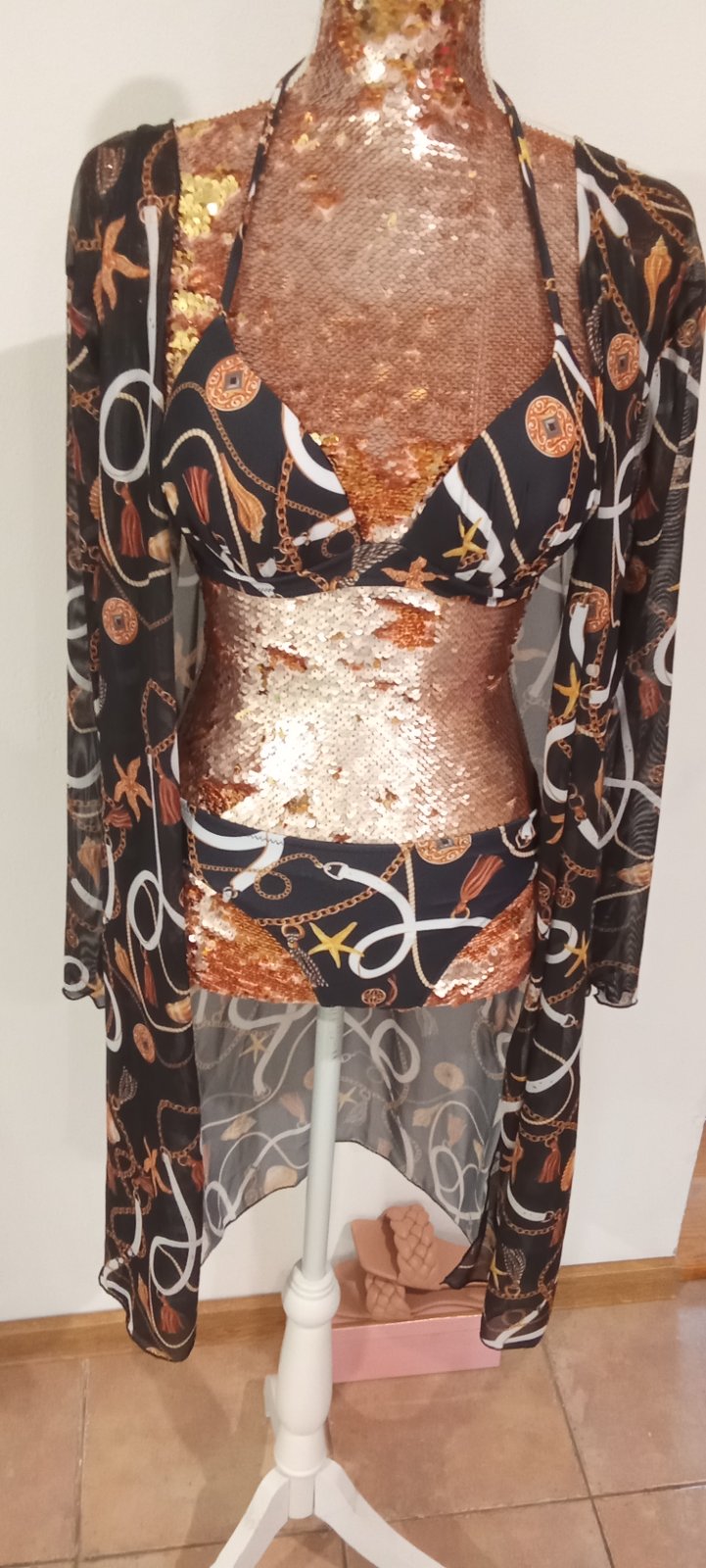 predám krásne plavky s dvoma vrchnými dielmi,su pošité čiernymi lesklými flitrami.Podprsenka č.3,spodok S.Pov.cena asi 65 EUR.V top stave,málo nosené.