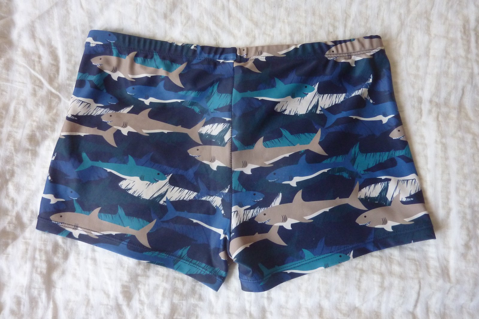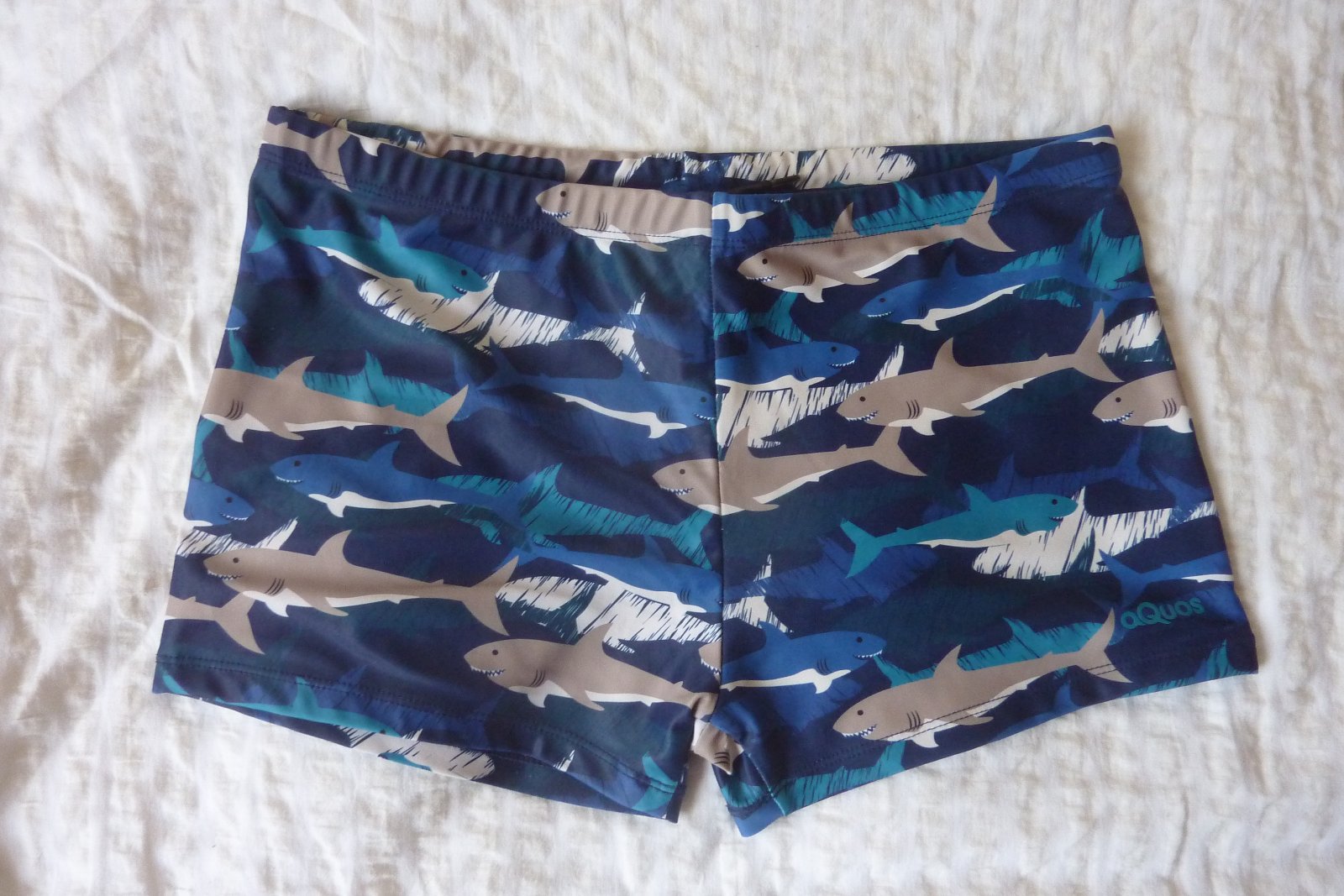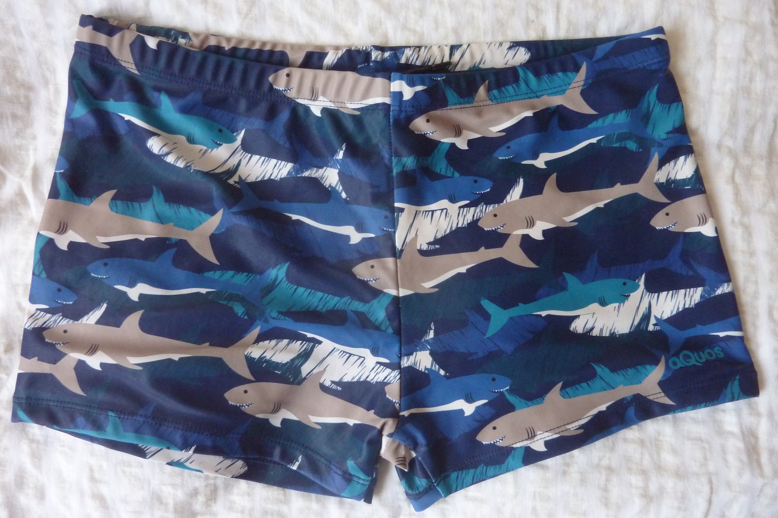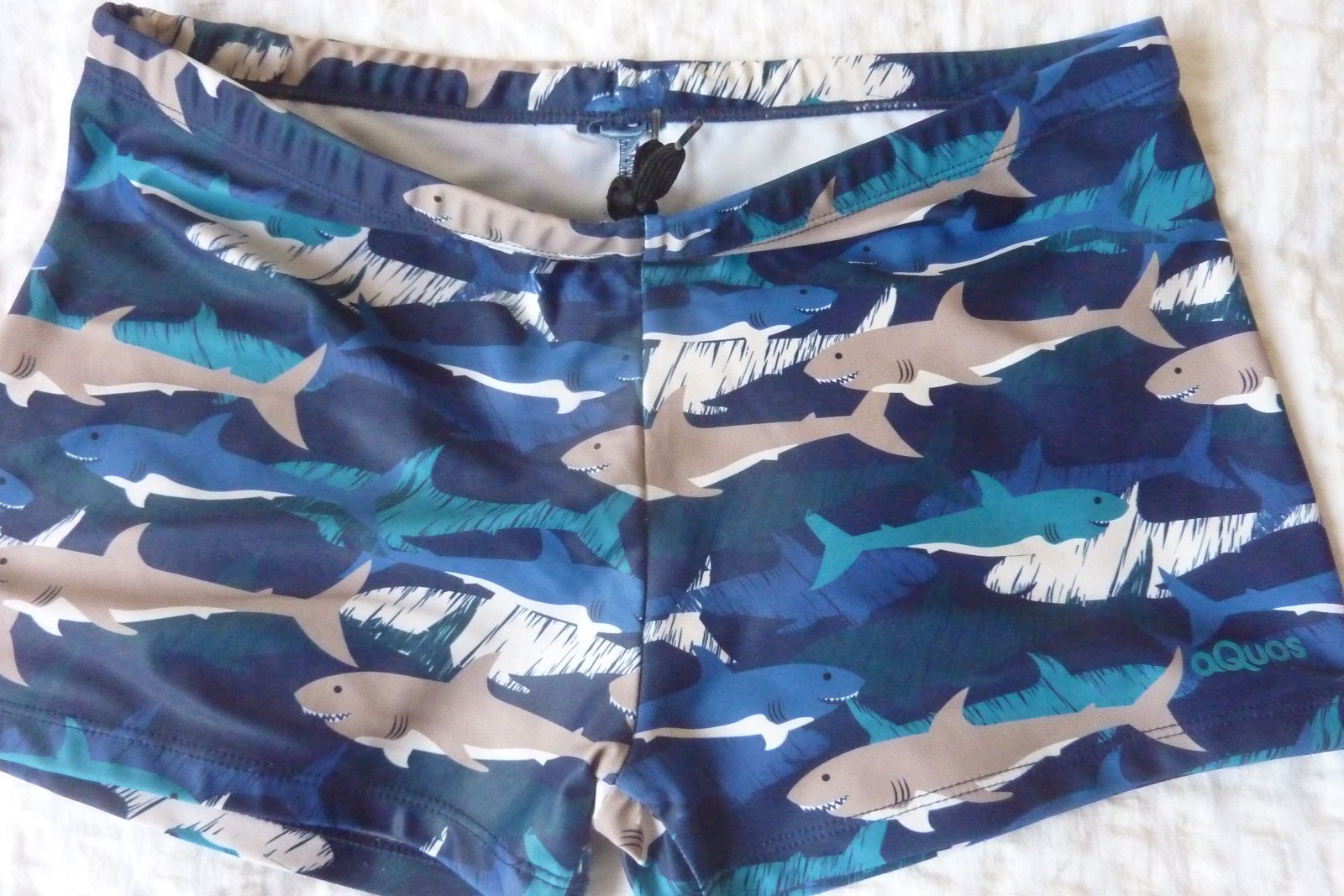 Veľmi pekné, modré plavky so žralokmi. Sú značkové: Aquos. Veľmi dobrá kvalita.