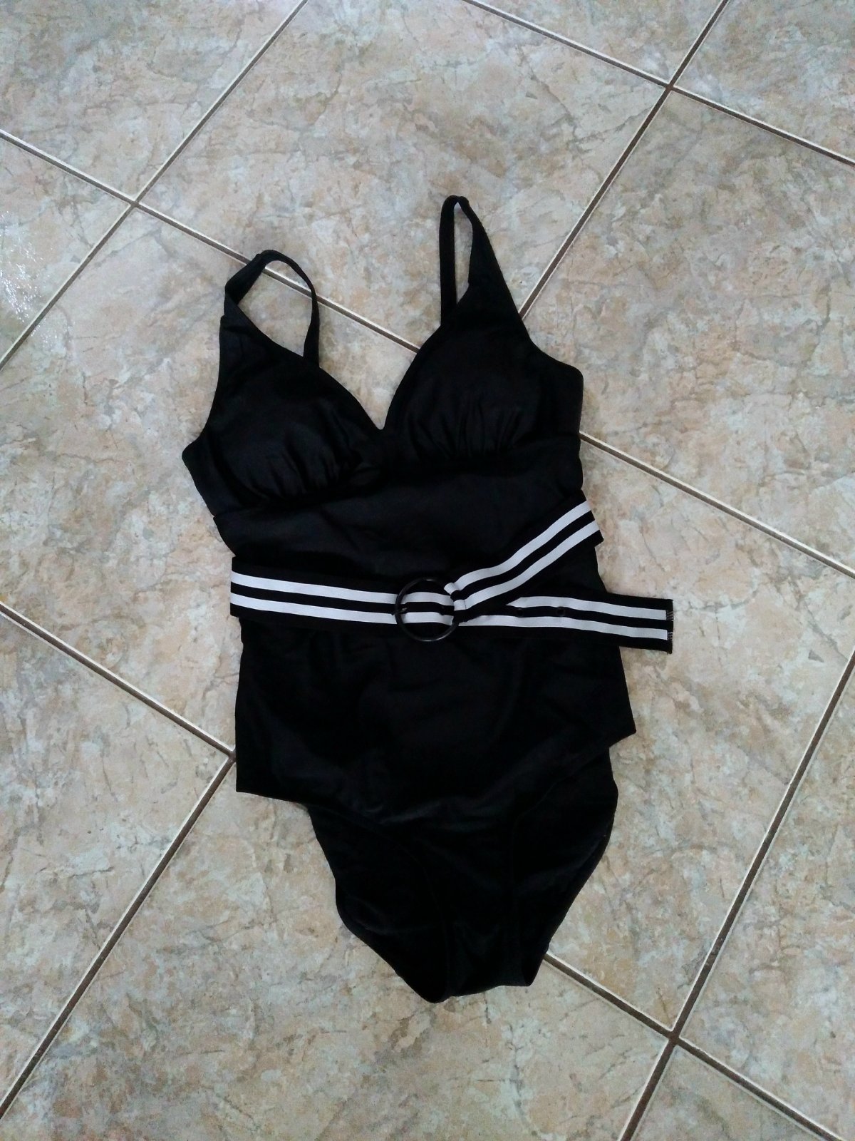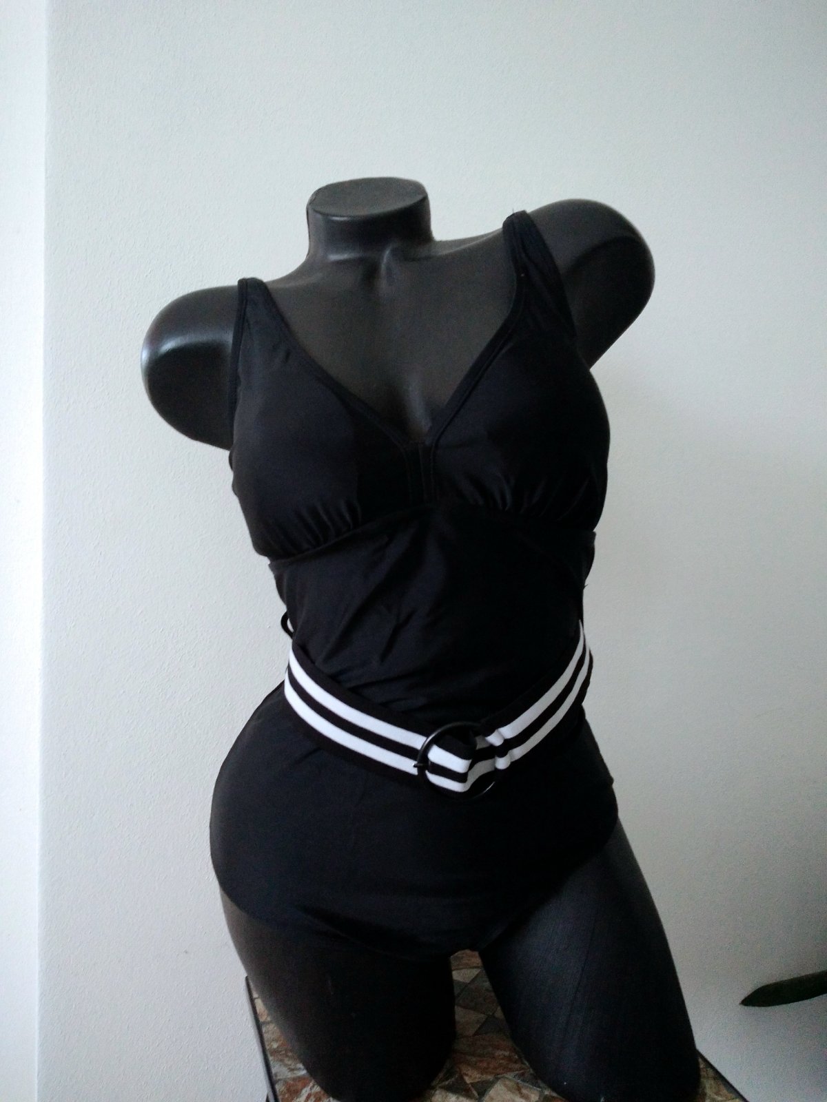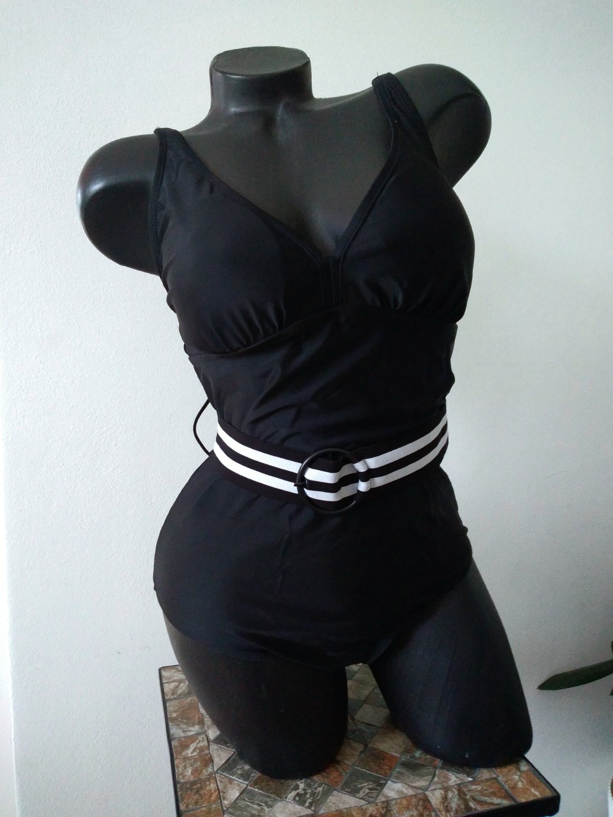 Plavky velk. 40. Košíčky C. Krásne čierne plavky s veľkosťou košíkov C, vystužené s kosticami. Dolná časť je kraťasová. Veľmi pekné. S ozdobným opaskom.