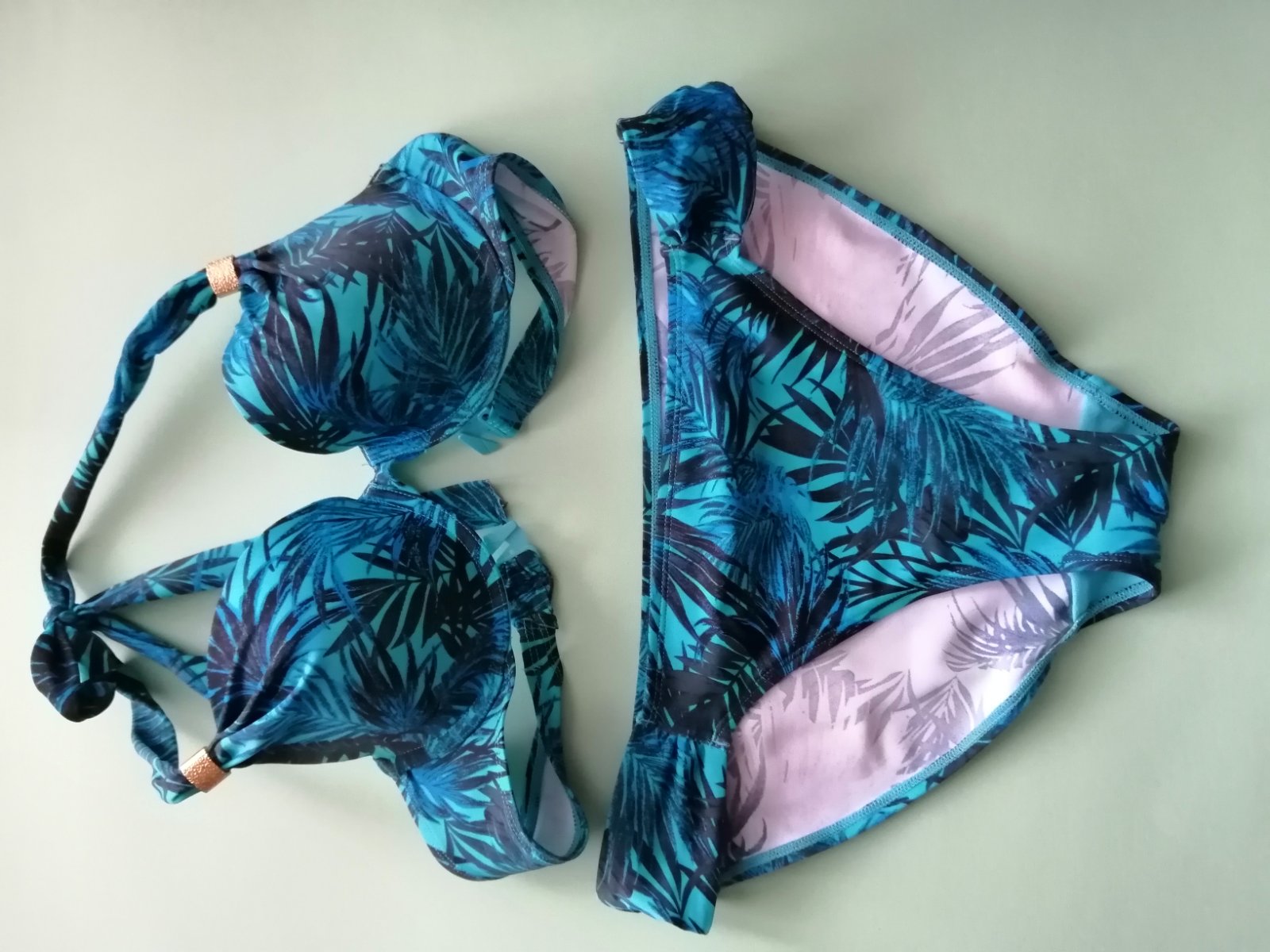 Dámske plavky tmavej tyrkysovej farby so zlatým zdobením na ramienkach podprsenky, podprsenka vystužená v. A, plavky použité vo veľmi dobrom stave. veľkosť 38/40.