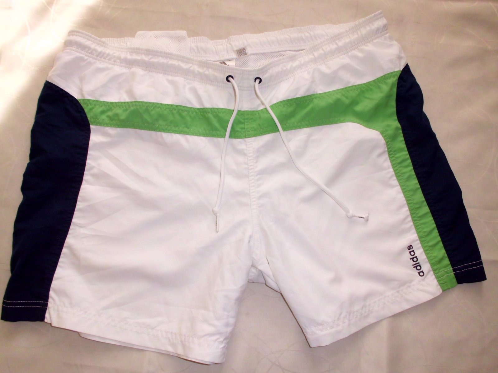 Predám pánske plavky Adidas v.L , vnútri sieťka, 1 zadné vrecko+malé vnútorné , pás 48 cm + šnúrky , dĺžka 40 cm, šírka nohavice 31 cm, predný sed 27 cm, biela+zelená+modrá farba ako na foto , super stav