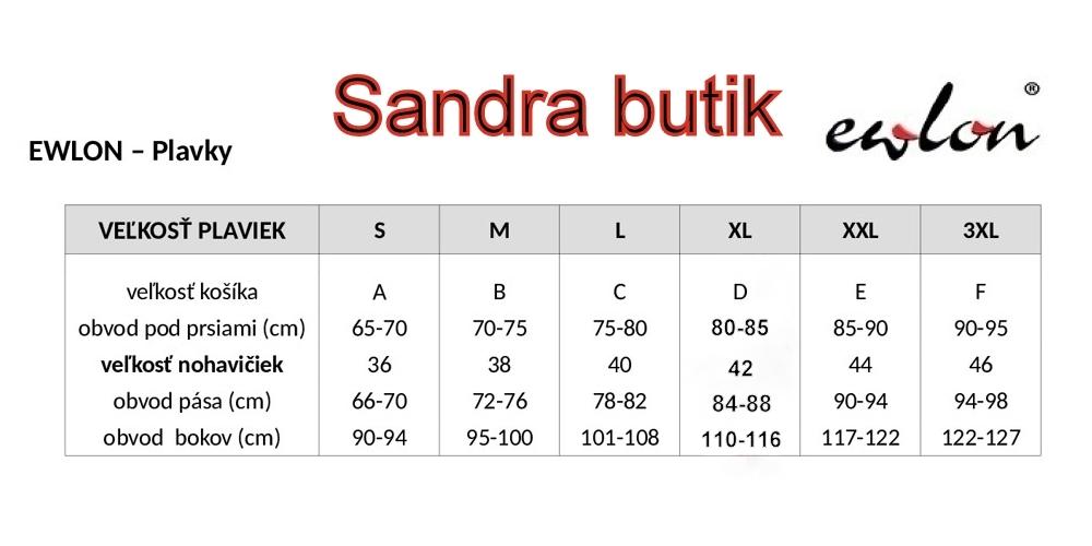 Obvod bokov: S: 90-94, M: 95-100, L: 101-108, XL: 110-116, XXL: 117-122, 122-127.