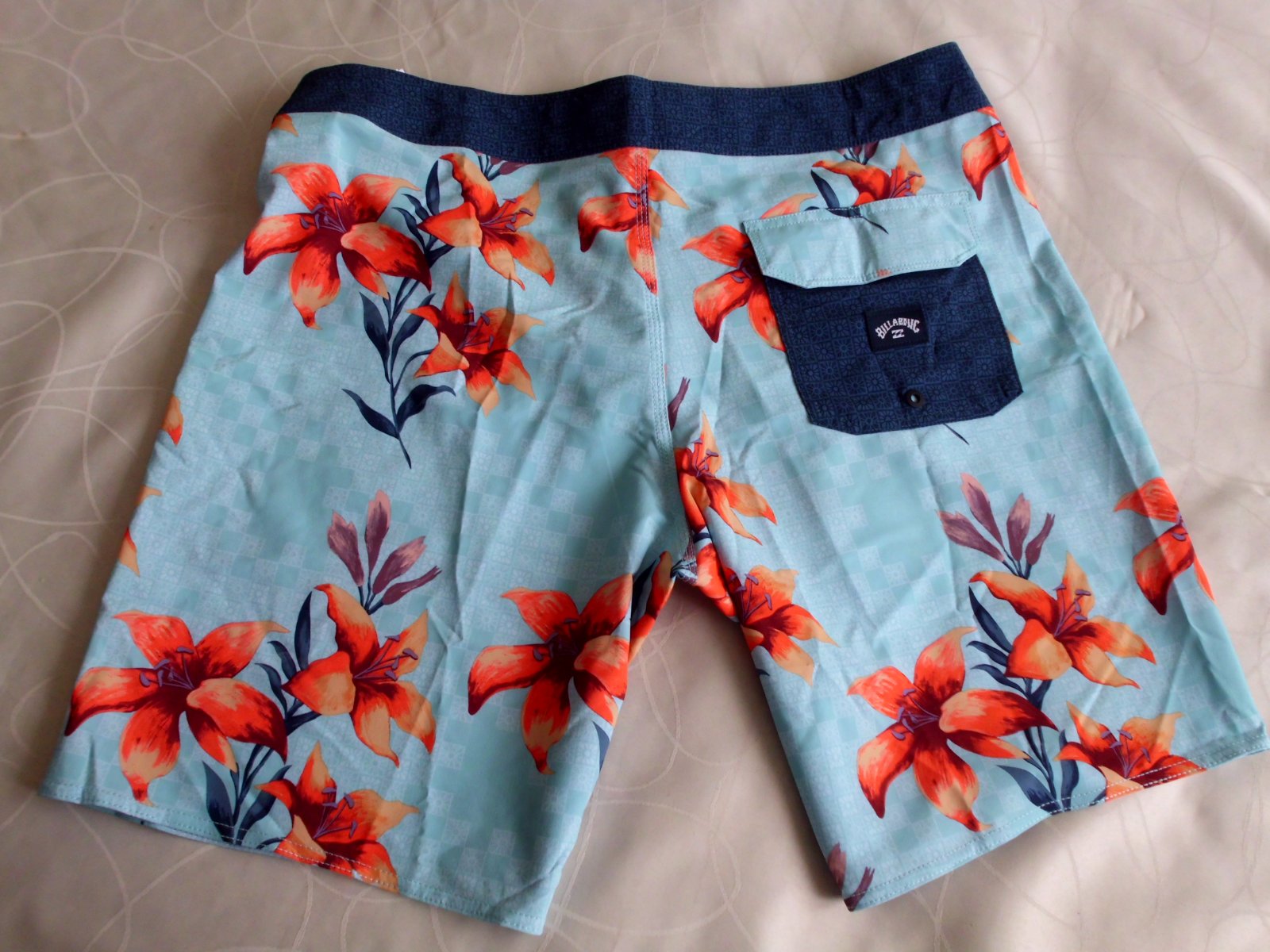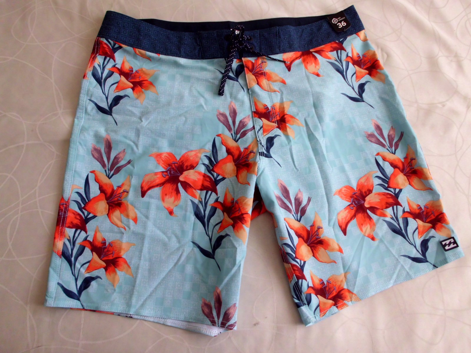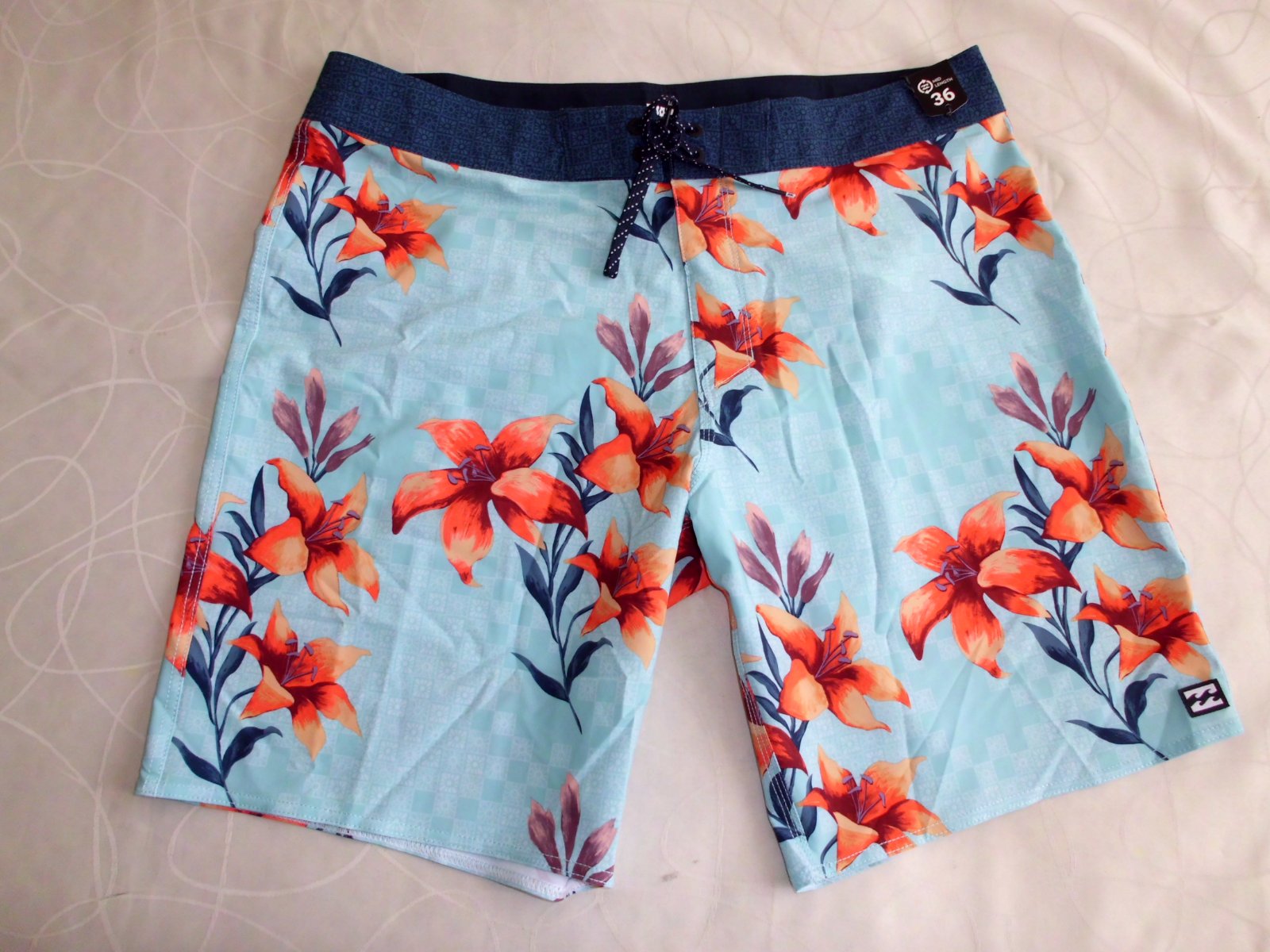Predám pánske plavky Billabong v.L (36) , 1 zadné vrecko , pás 47,5 cm + šnúrky , dĺžka 48,5 cm, šírka nohavice 30 cm, predný sed 29 cm, farba ako na foto mätovo modrá + kvety, 100% stav