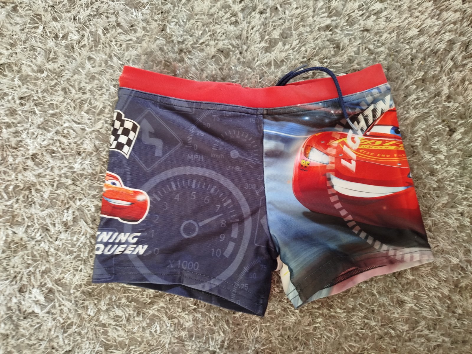 Červené plavky so vzorom, úplne nové, nenosené. Vnút sieťka, v páse guma. Vhodné pre 6-8r. R: pás š: 27/max 36/, dl: 30cm.