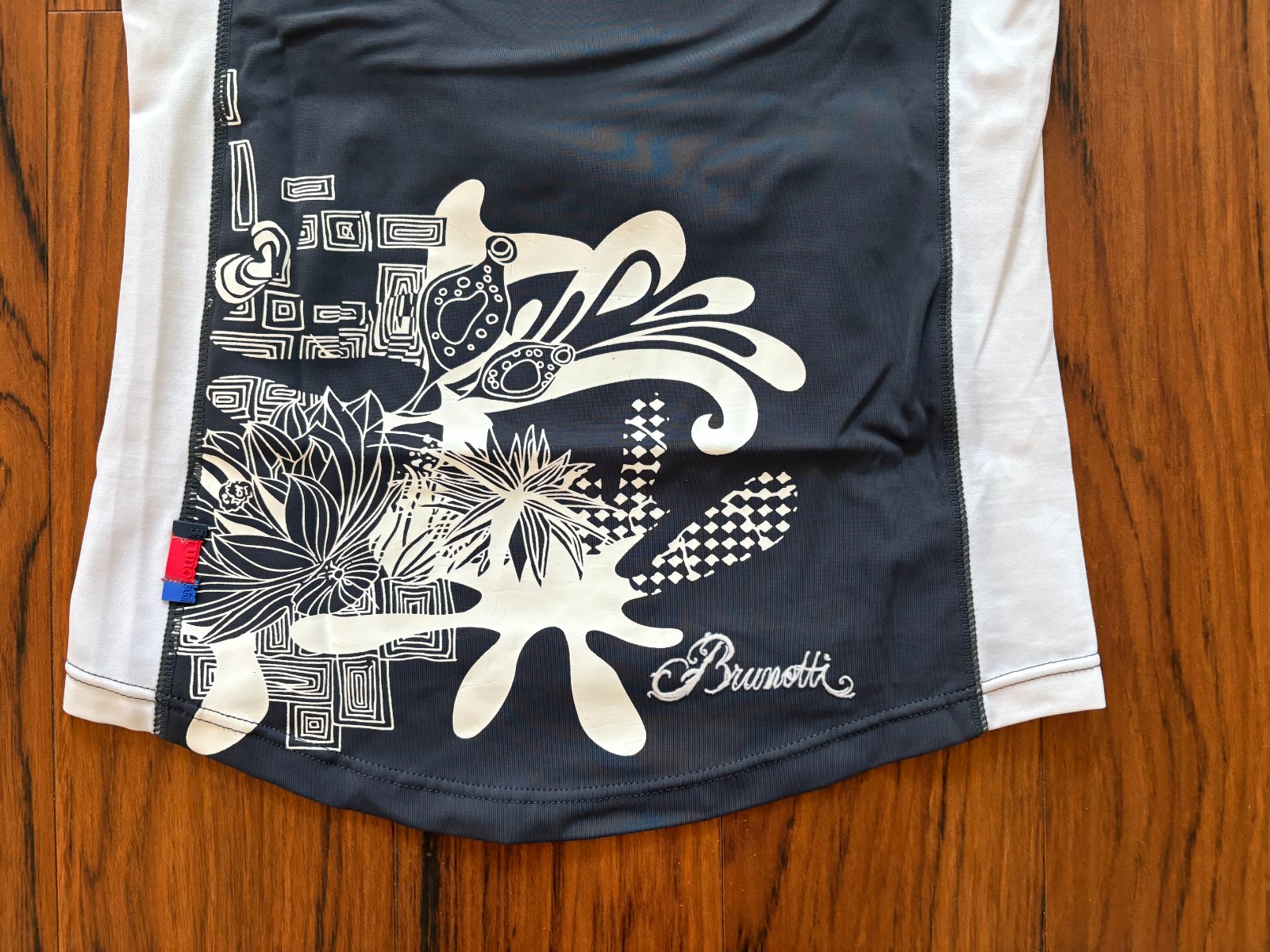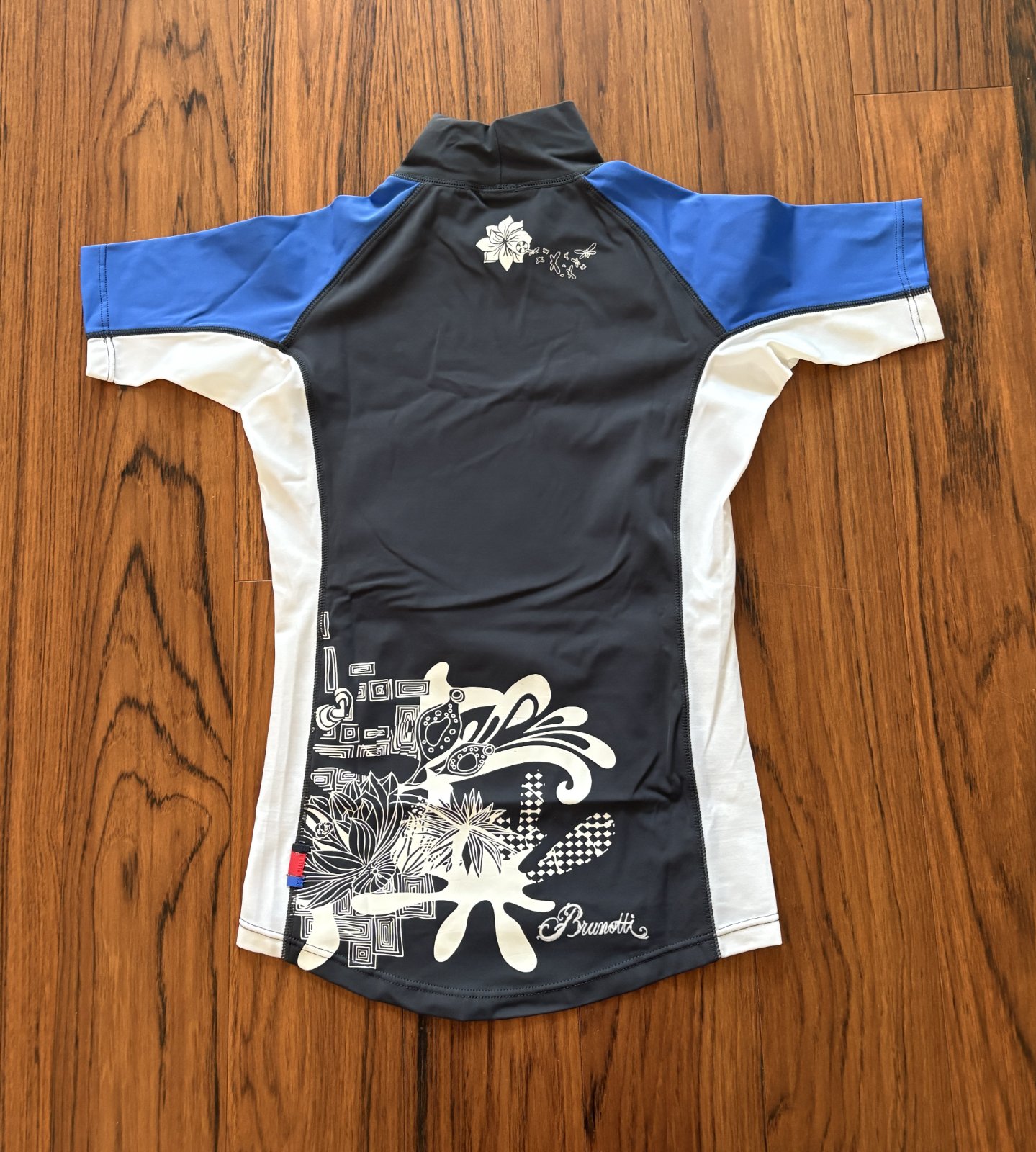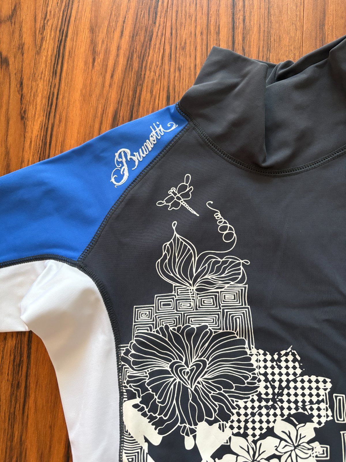 Brunotti tričko do vody vo farbách sivá/modrá/biela s potlačou. Veľkosť S. Celková dĺžka predný diel 55cm, zadný 59cm, šírka v podpazuší 39cm, šírka spodného lemu 37cm. Mierne elestické.