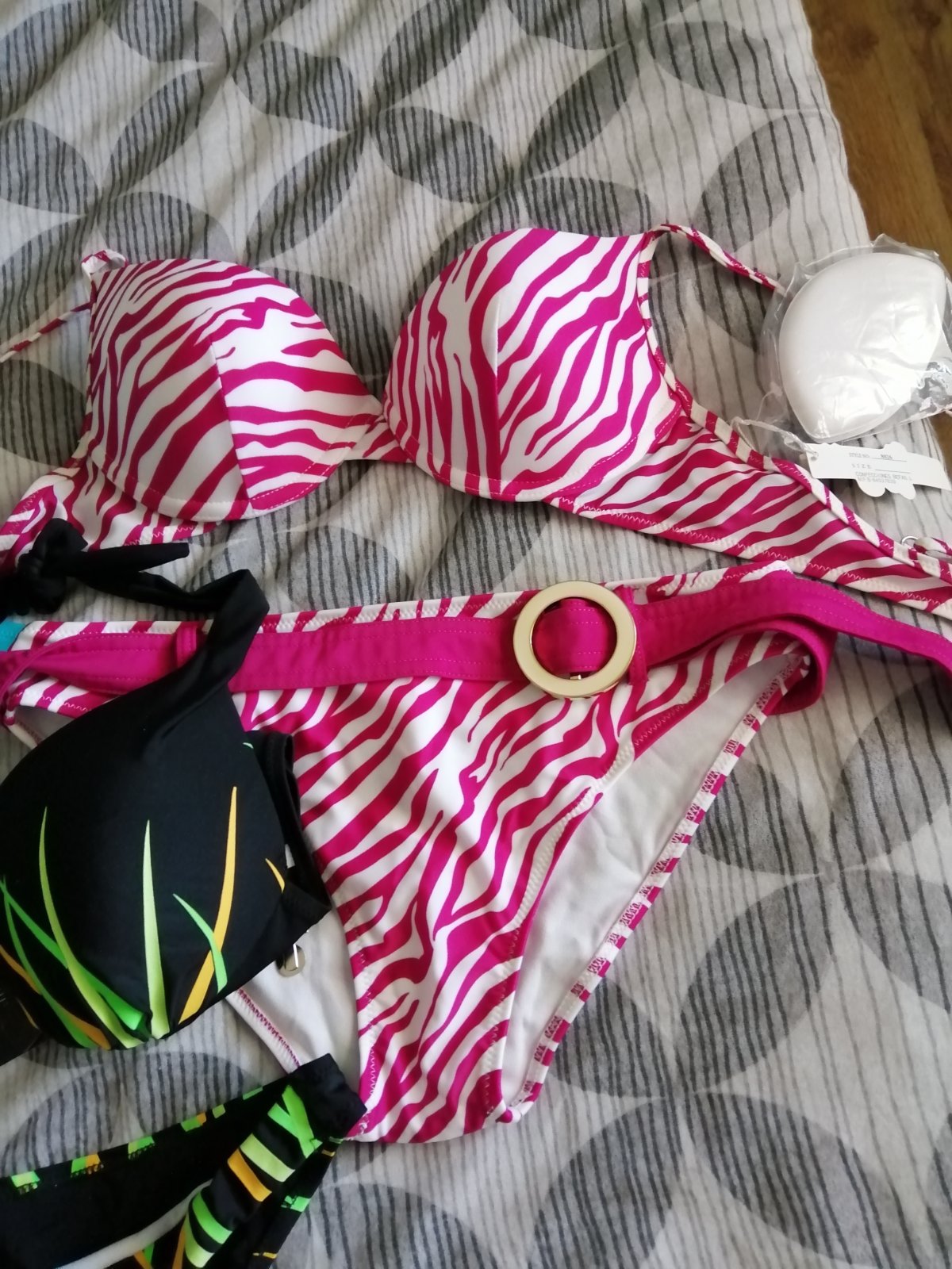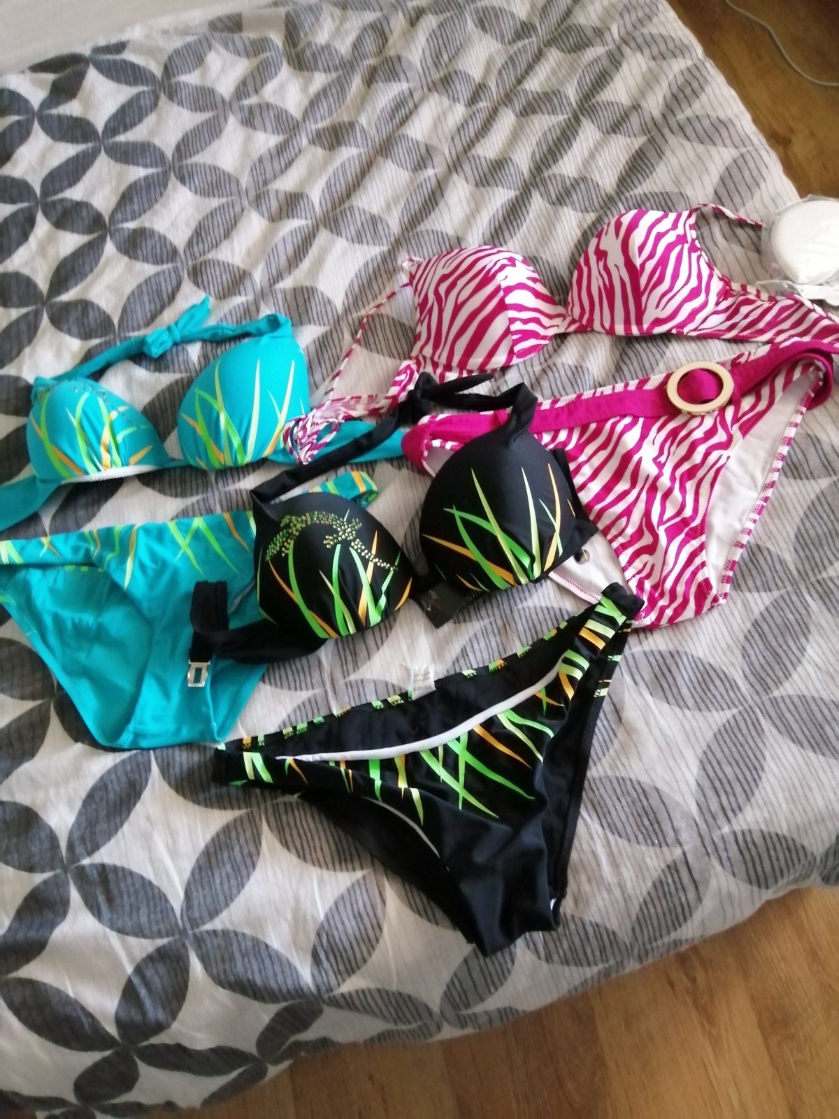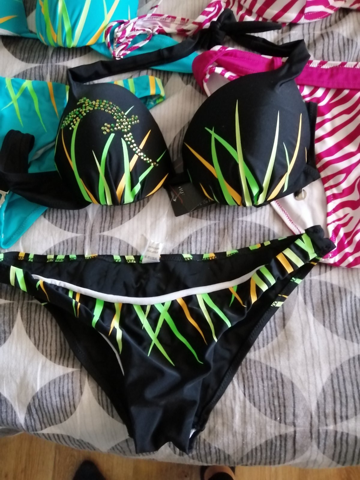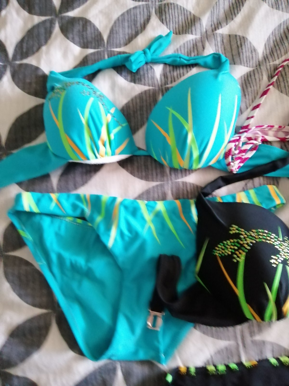 Bikiny na zavazovanie sú nové vo veľkosti M sadnú na veľkosť S aj M a velkost L Prsia : vycpávky, košíky A,B Materiál: 82% polyamid a 18% elastán