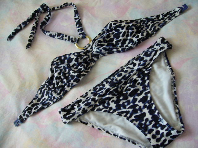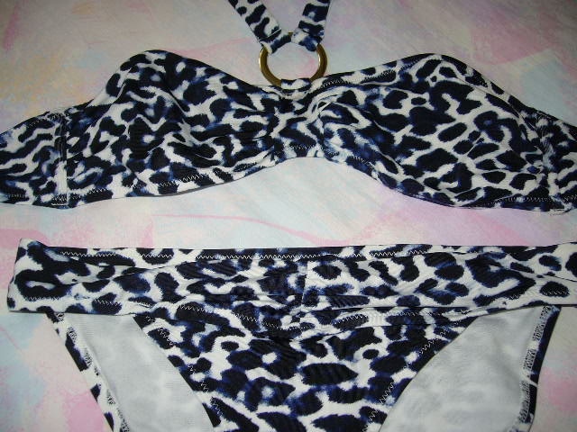 Modro-biele leo plavky,su uplne zachovale, boli asi 2x oblecene.Vrchny diel je zaujimavo sity, ,skombinovany so zlatym kruźkom,pasik okolo krku na zavezovanie.Stitky su odstrihnute,tak pisem miery. Obvod v klude 62cm, napne sa na 72cm.Vyska kosicka 14cm- bez vystuze,iba kostica na boku. Nohavicky v pase v klude 34x2,vyska sedu 21x2.