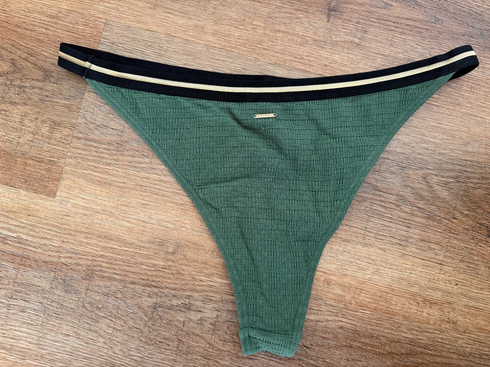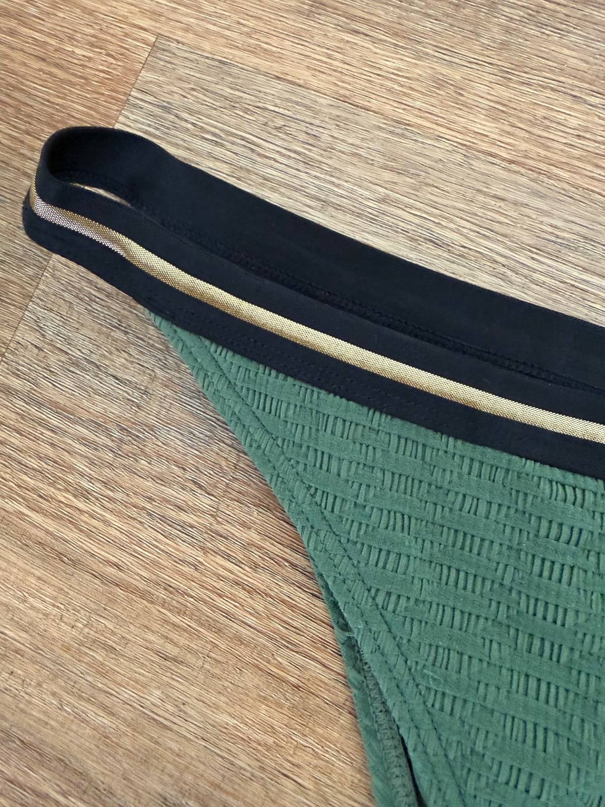 Len oprané, kombinácia khaki zelenej a zlatej, strih brazilian
