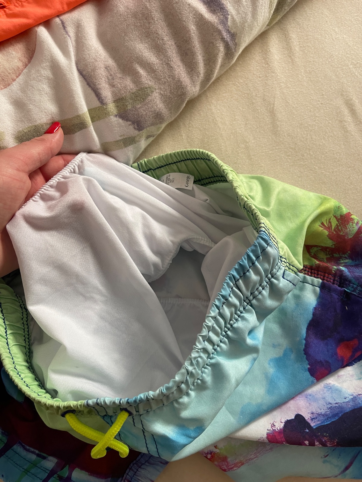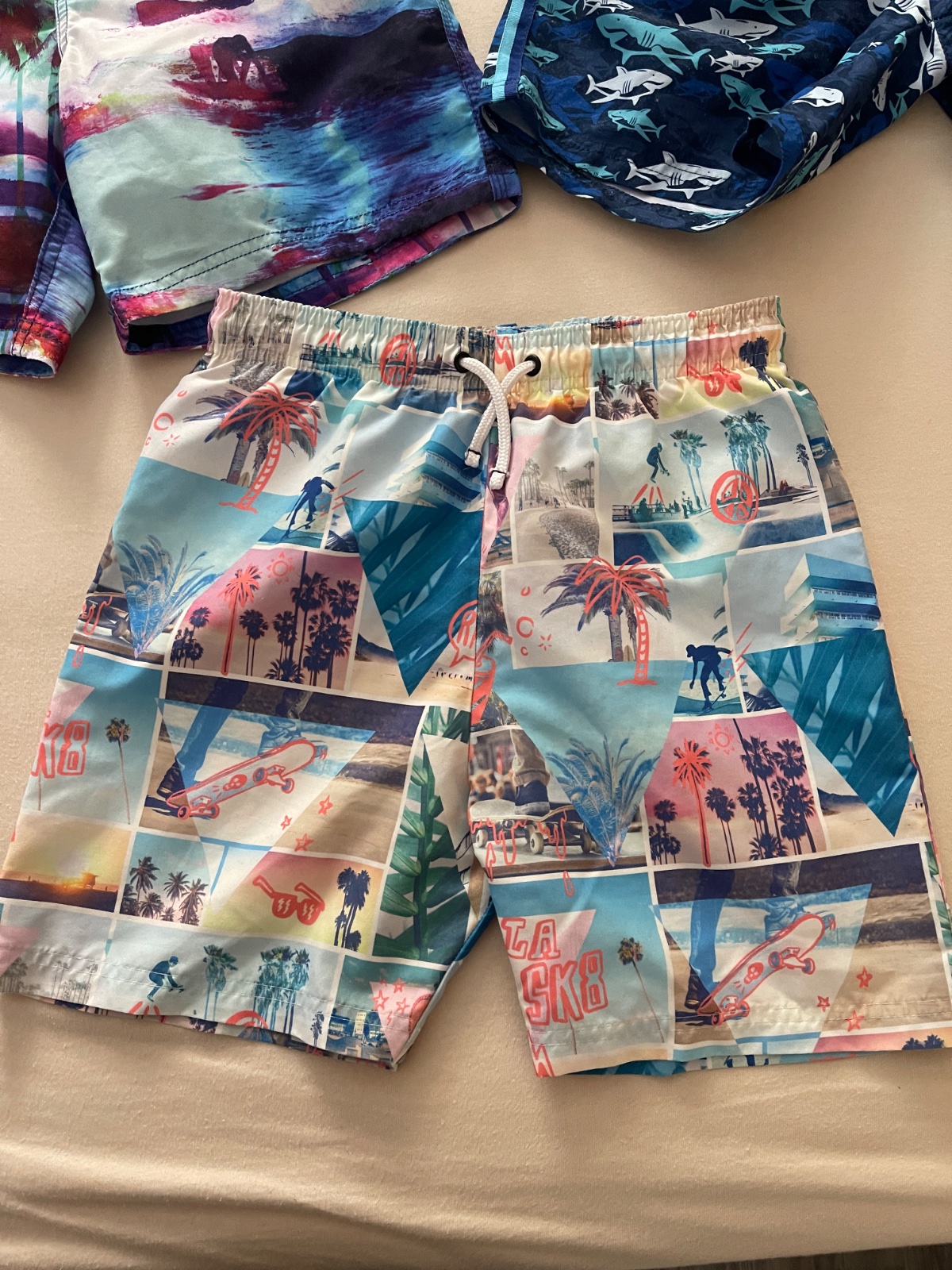 Plavky su v top stave bez nejakych dier a poskodeni. Z tych modrych zralokovych a z tych palmlvych je vystrihnuta ta sietka zvnutra pretoze to syna v mori dralo v slabinach. Cena za vsetky 15€