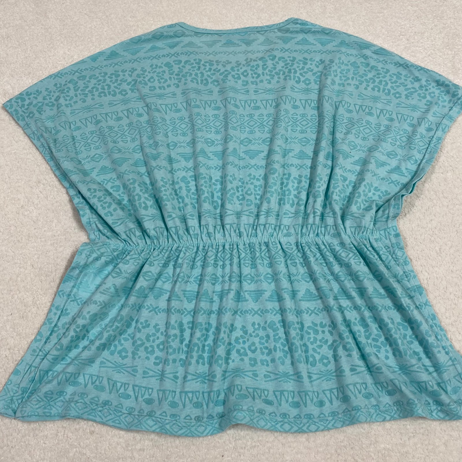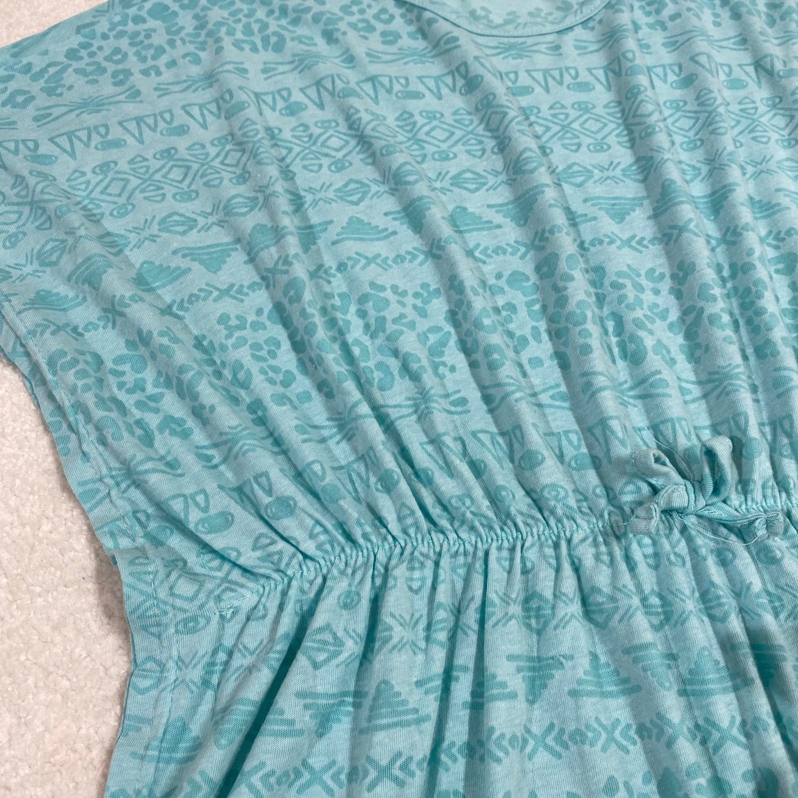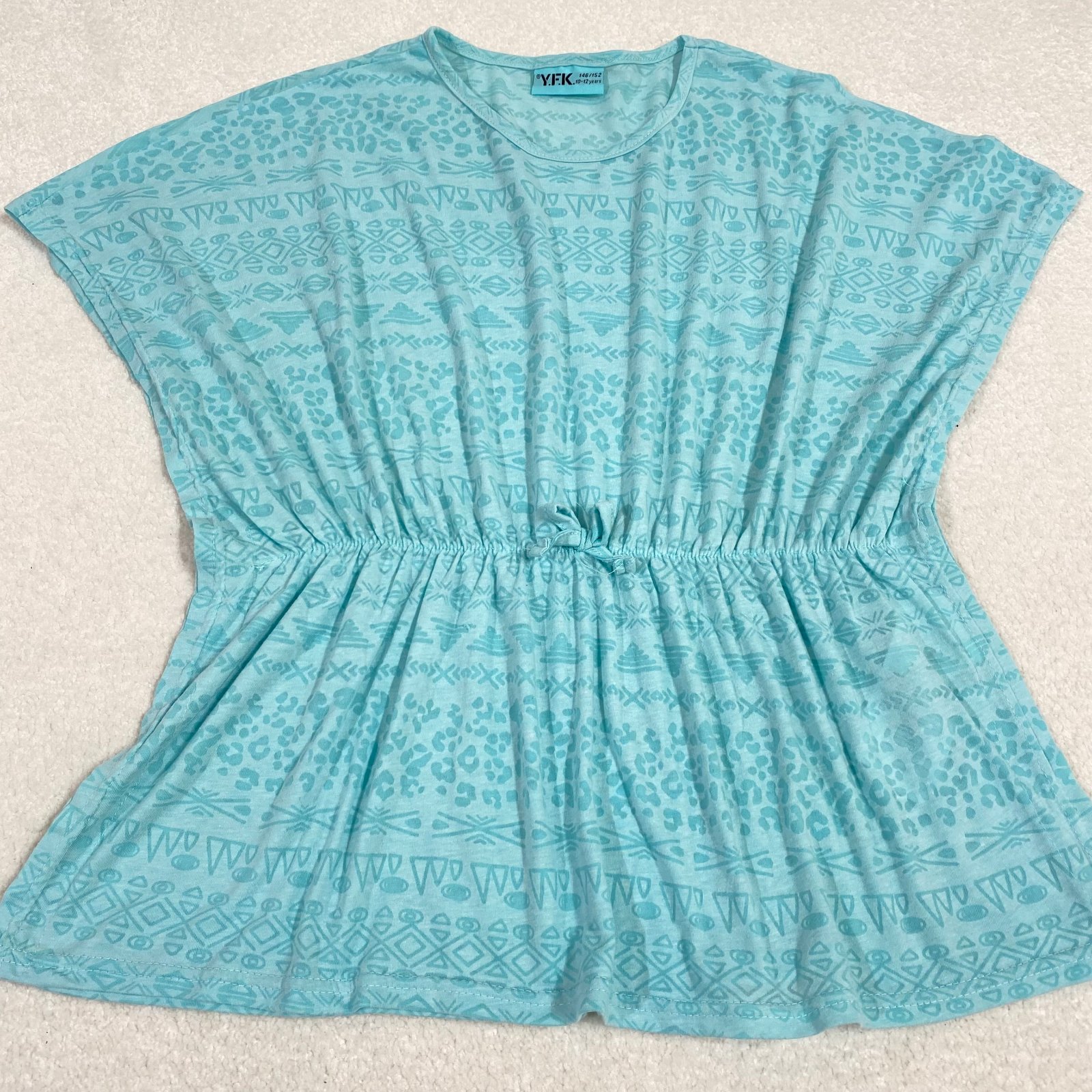 Bledunko tyrkysové pončo ku kraťasom, alebo na plavky. Dĺžka je 60cm, šírka tam kde je gumička je 40cm v nenatiahnutom stave. Ako nové. Veľkosť 146/152