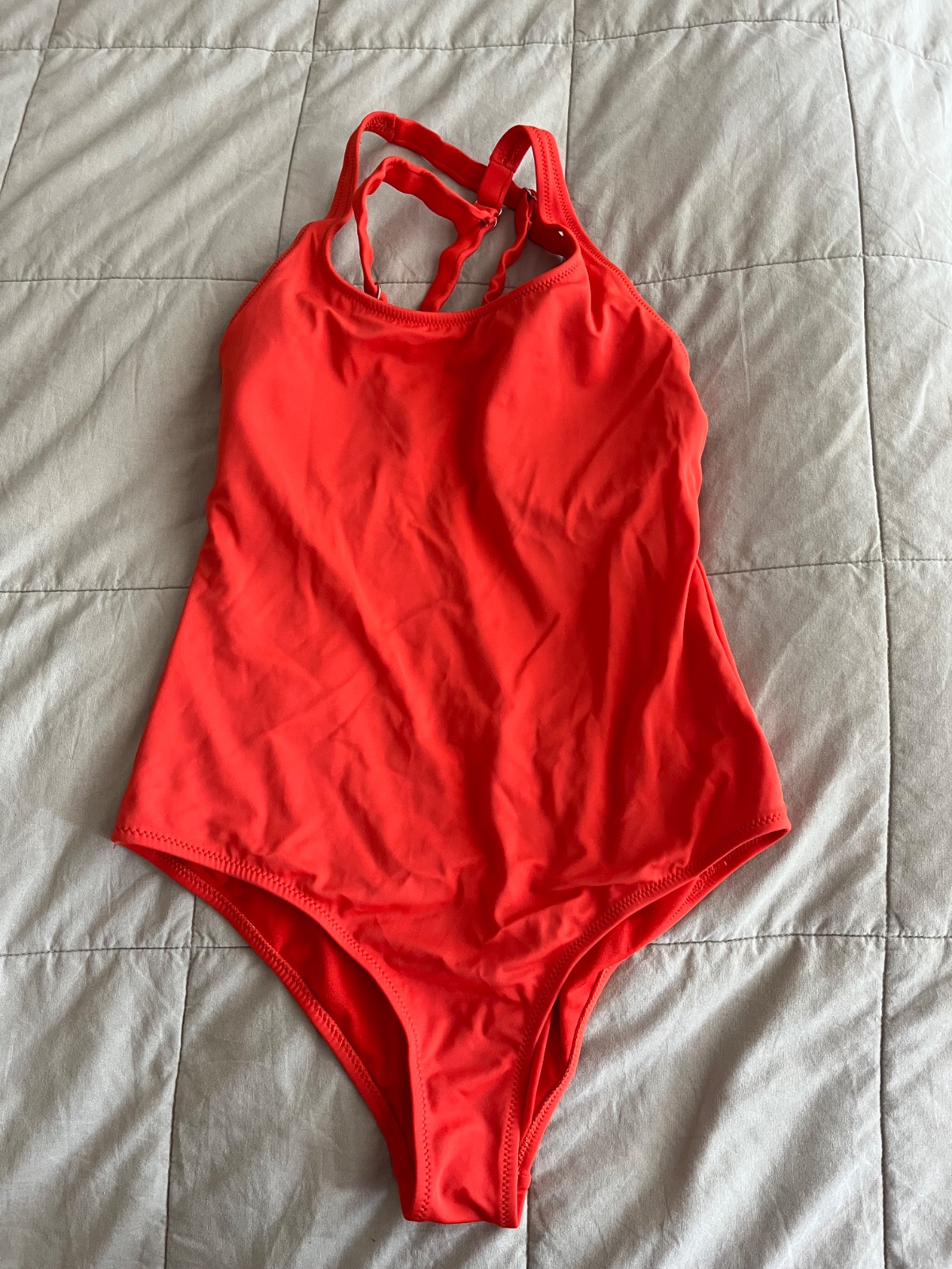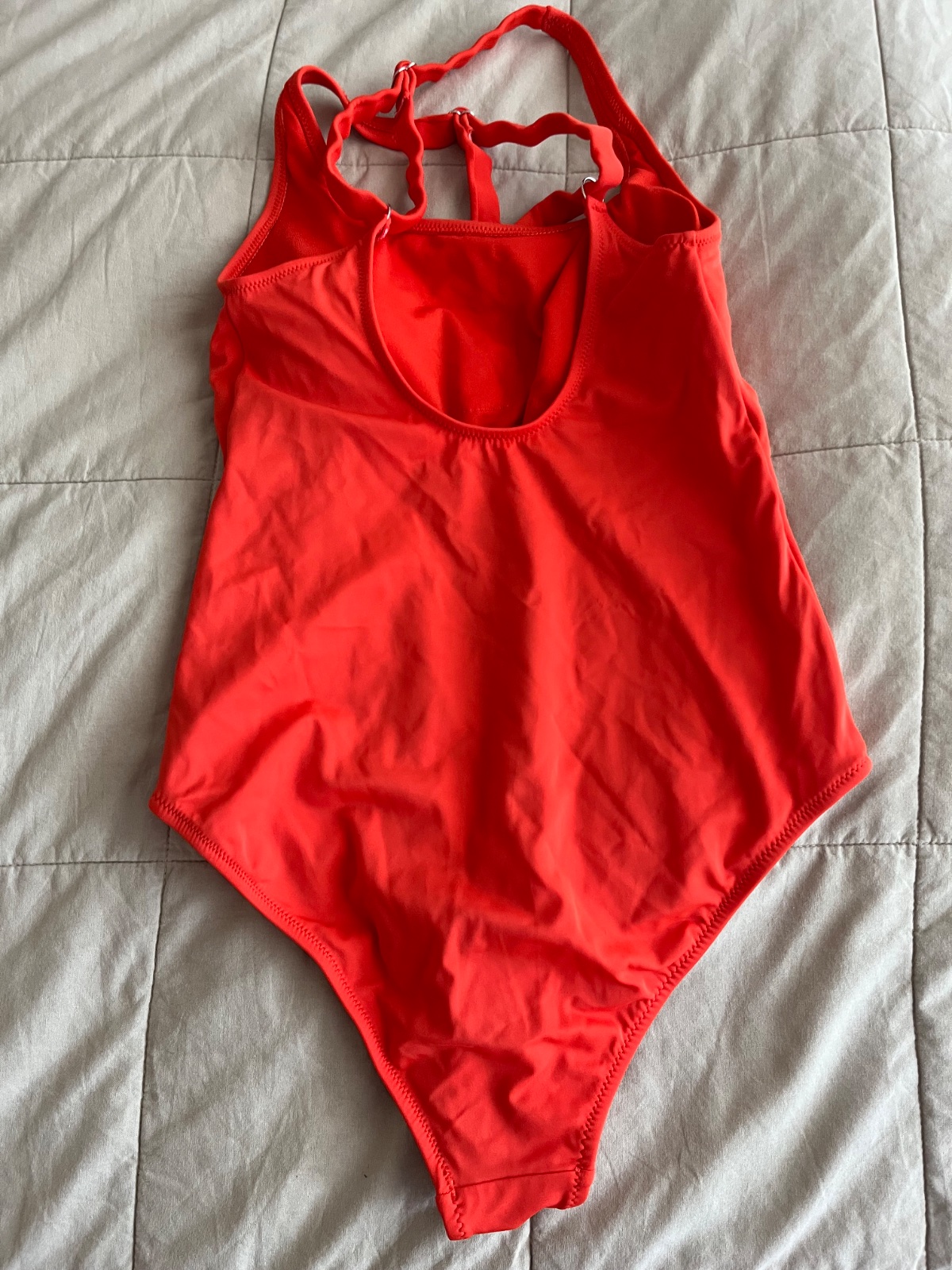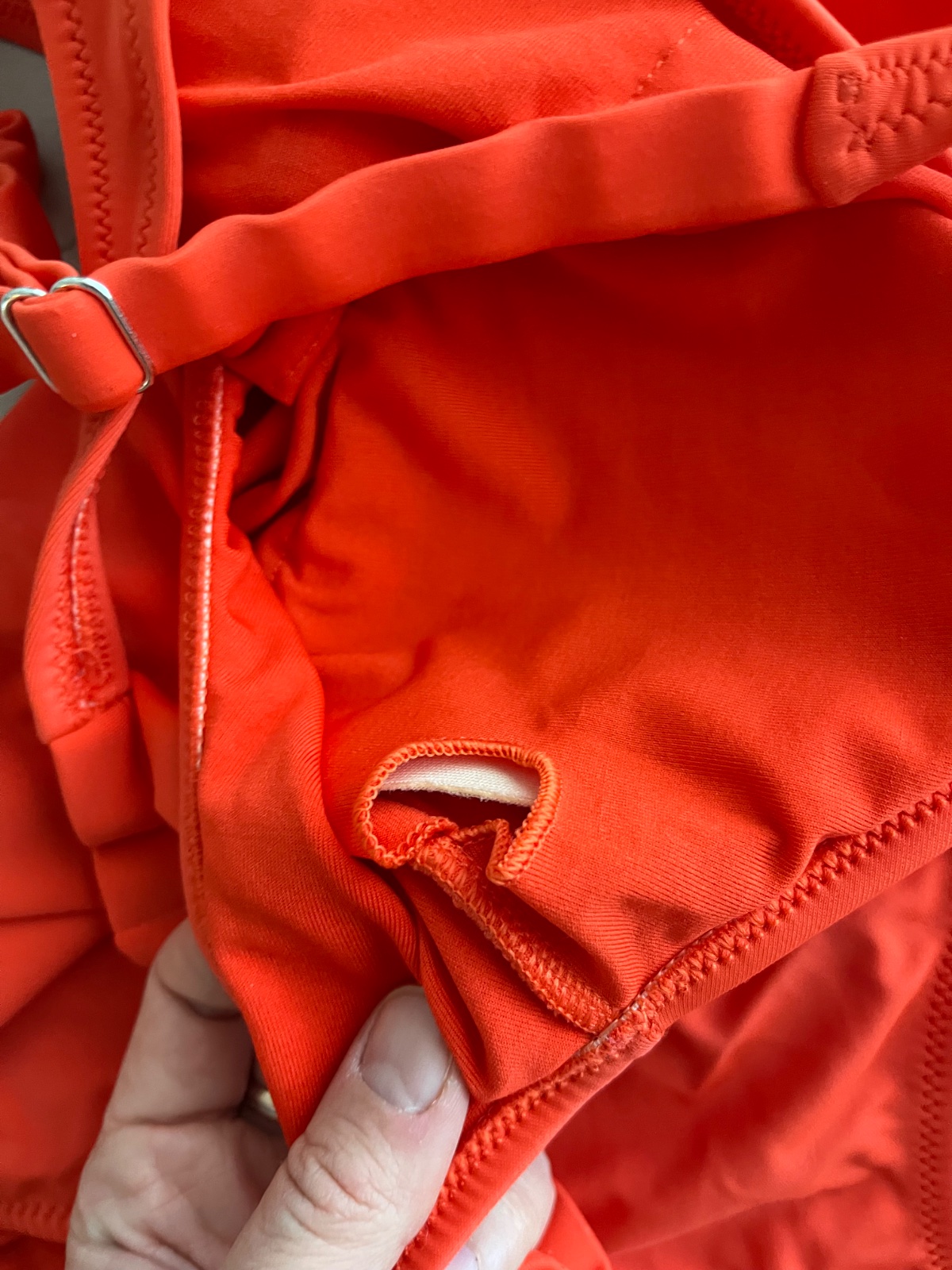 Jeden krat oblecene na kúpalisko, perfektný stav. Majú vypchávky a reguláciu ramienok. Pekná sýta oranžovo-koralova farba. Velkost uvedená 38, ale odporúčam na 36/S