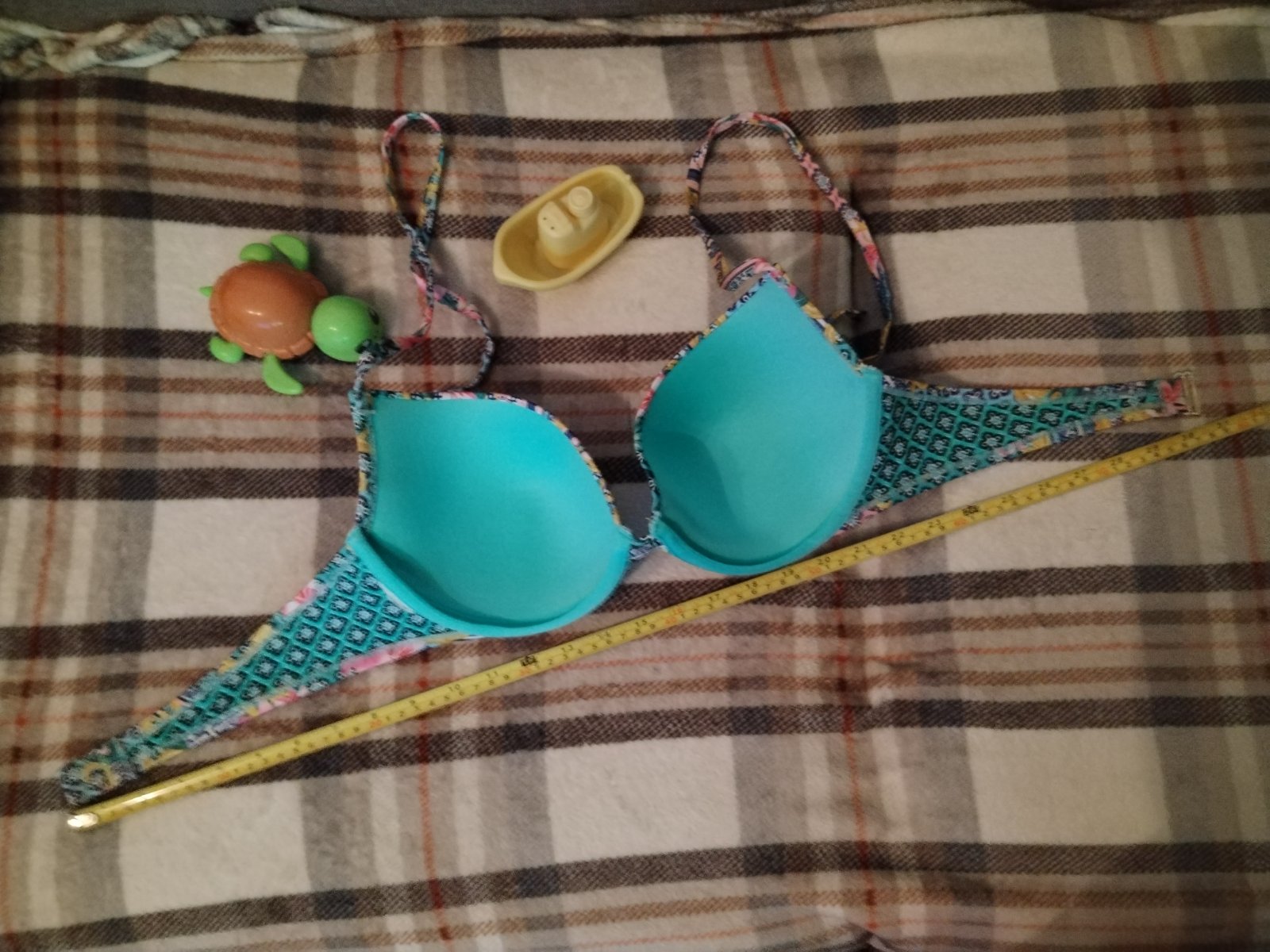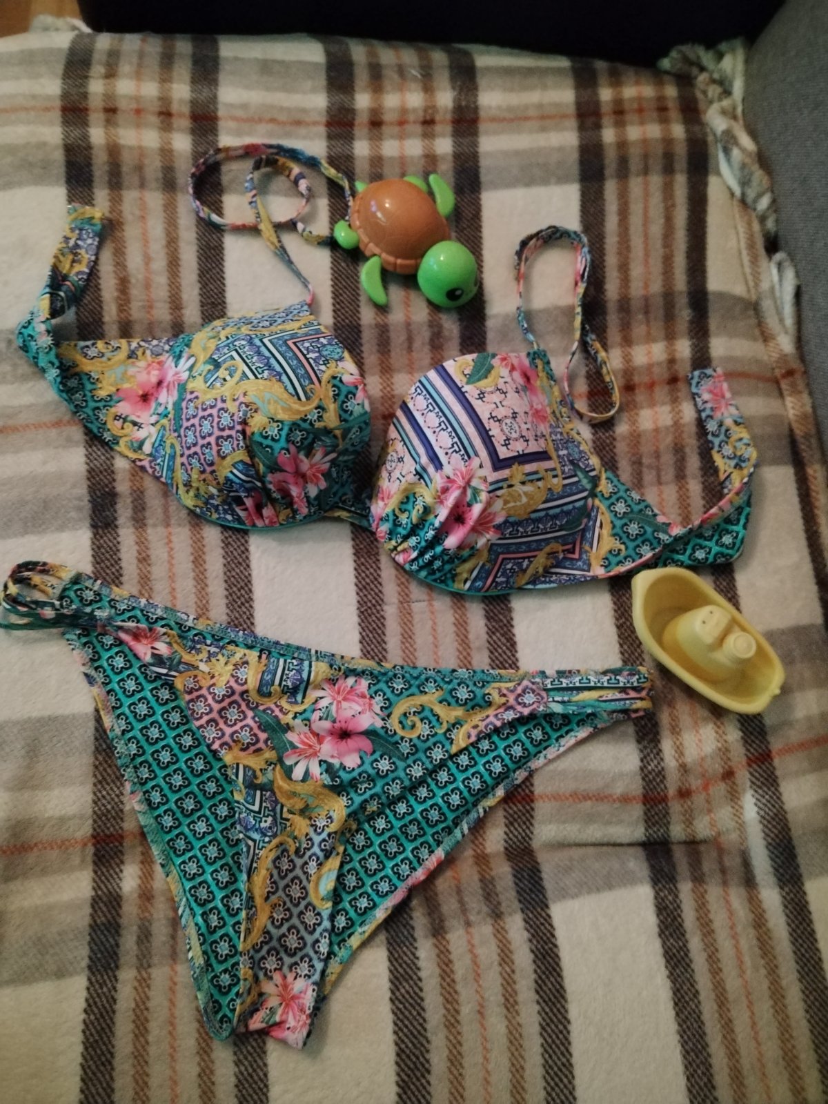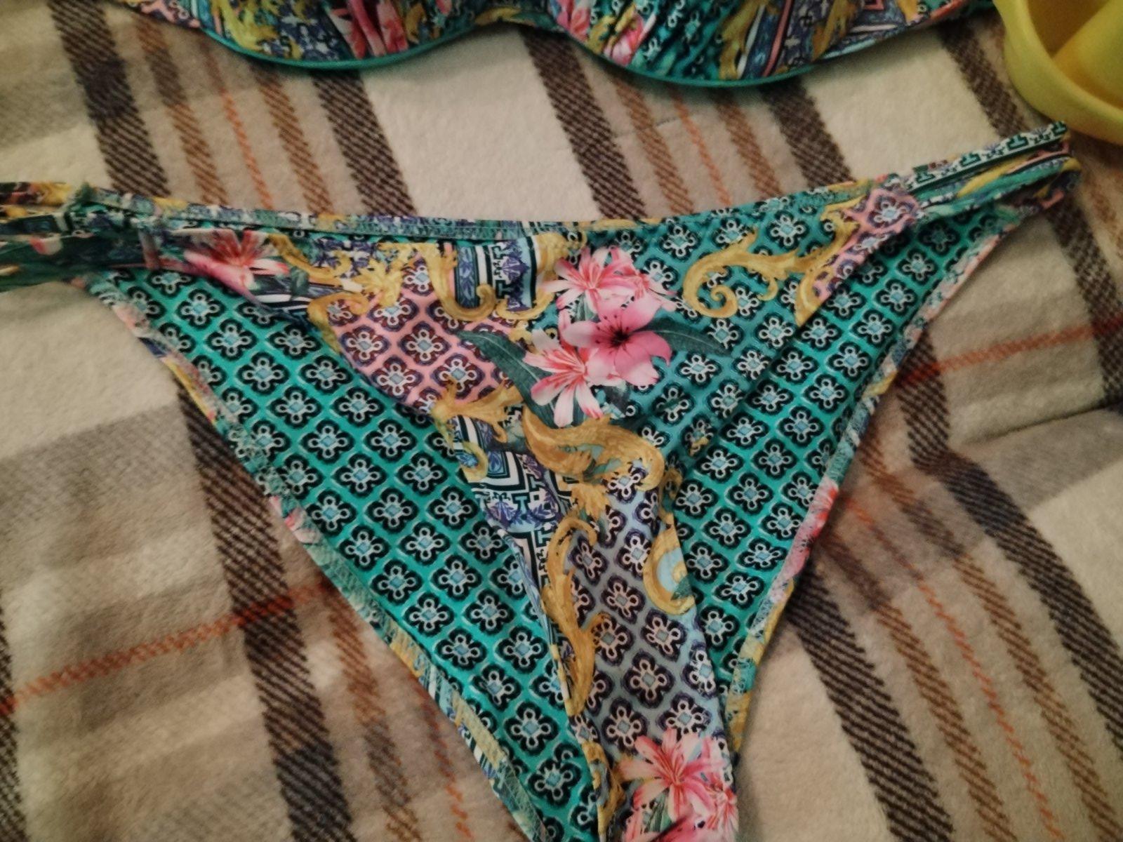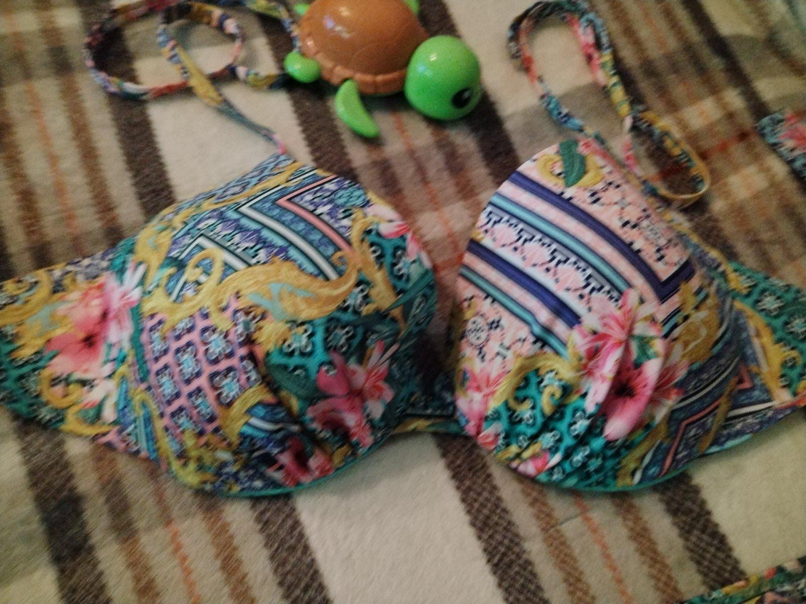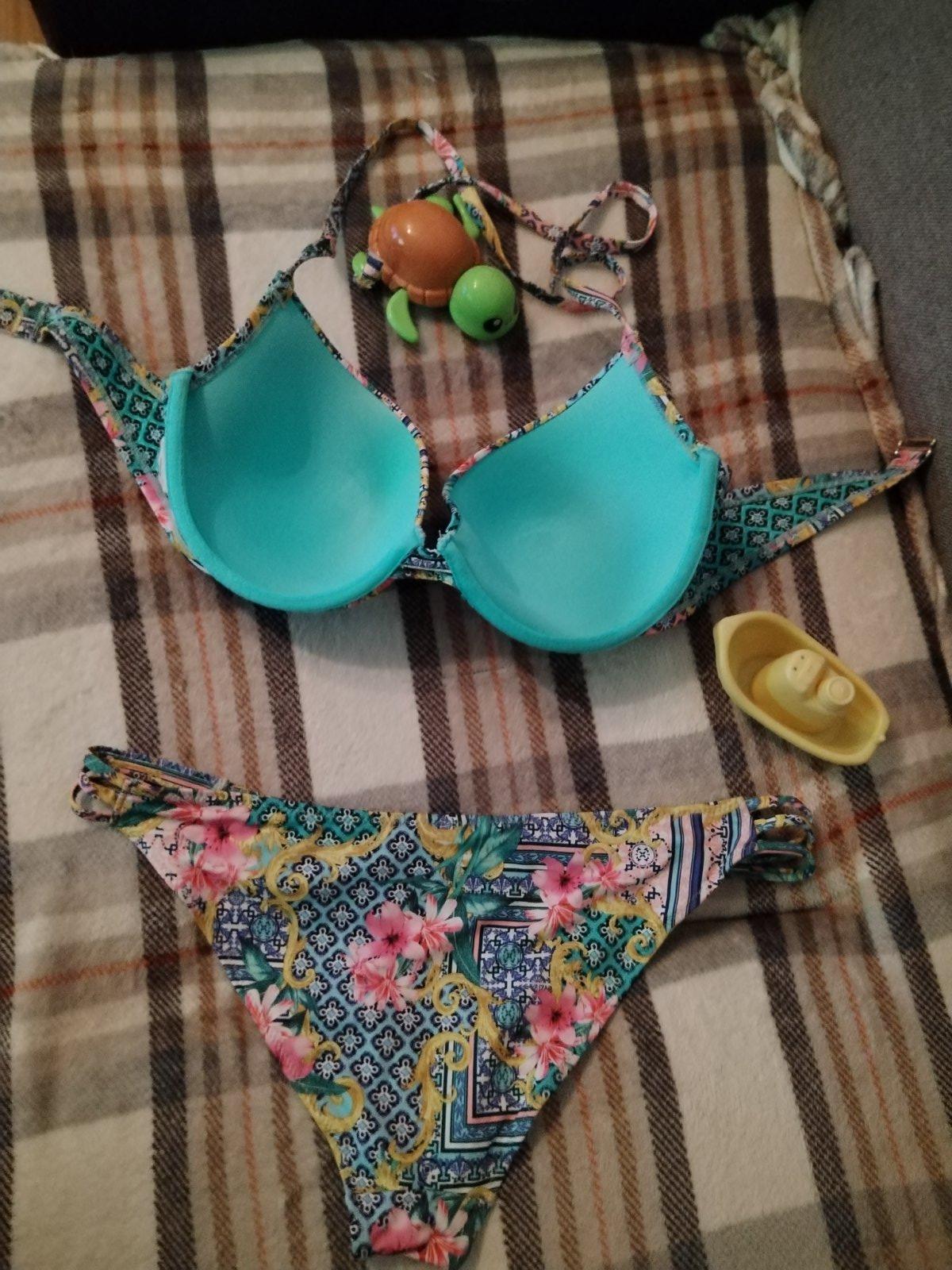 Krásne dvojdielne plavky slovenskej výroby, nohavičky darujem jedny navyše, sú vo veľkosti xl, plavky sú nenosené, len oprate., skutočná farba je ako je odfotené ramienko zblízka, nedalo sa mi lepš...