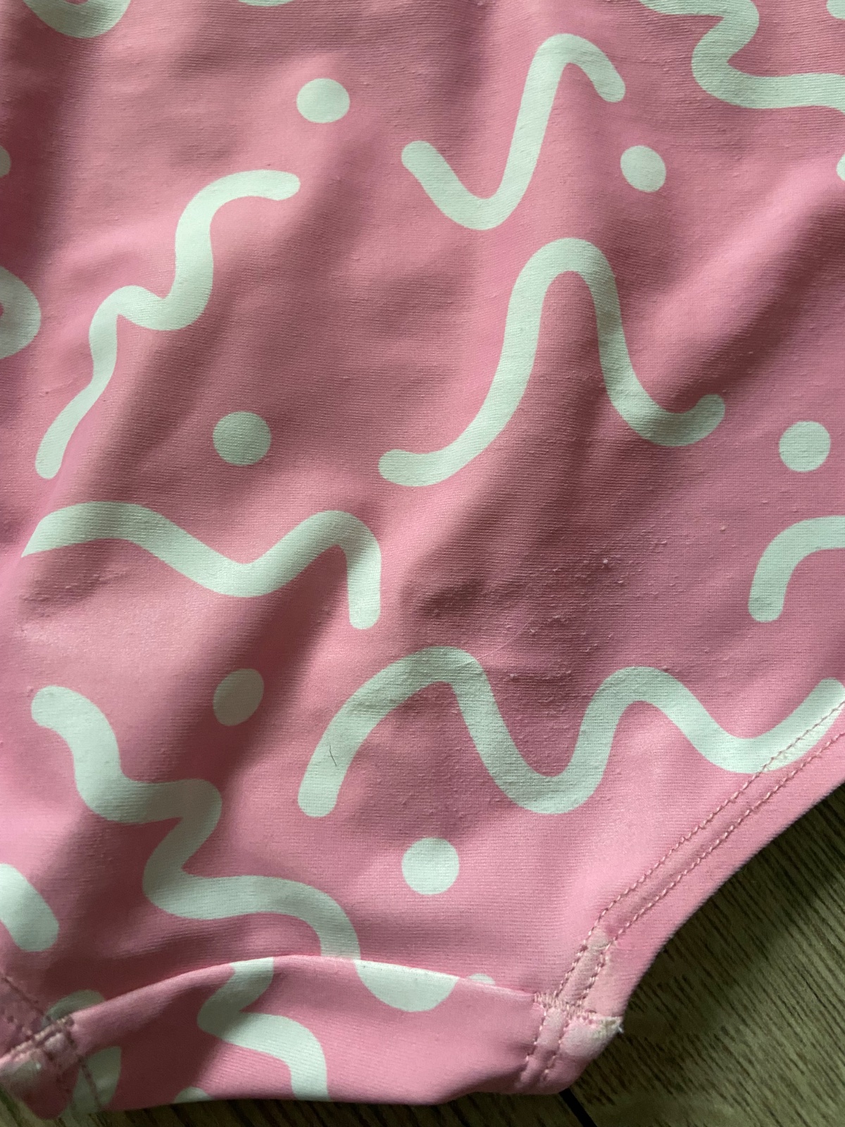 Dvojdielne plavky,spodny diel viac vyblednuty, k tomu aj klobucik rovnajeho vzoru