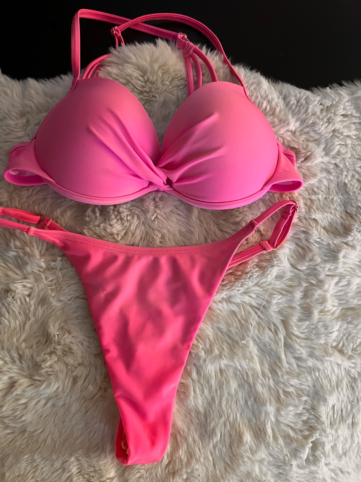 Krásna neonová kolekcia dvojdielných plaviek. Ružové so zelenožltou krajkou. Vrch sedí na prsia 75C-75D (L) a spodok je na veľkosť S. Vrch trojuholníkový tvar a spodný diel brazílky. Ja mám týchto...