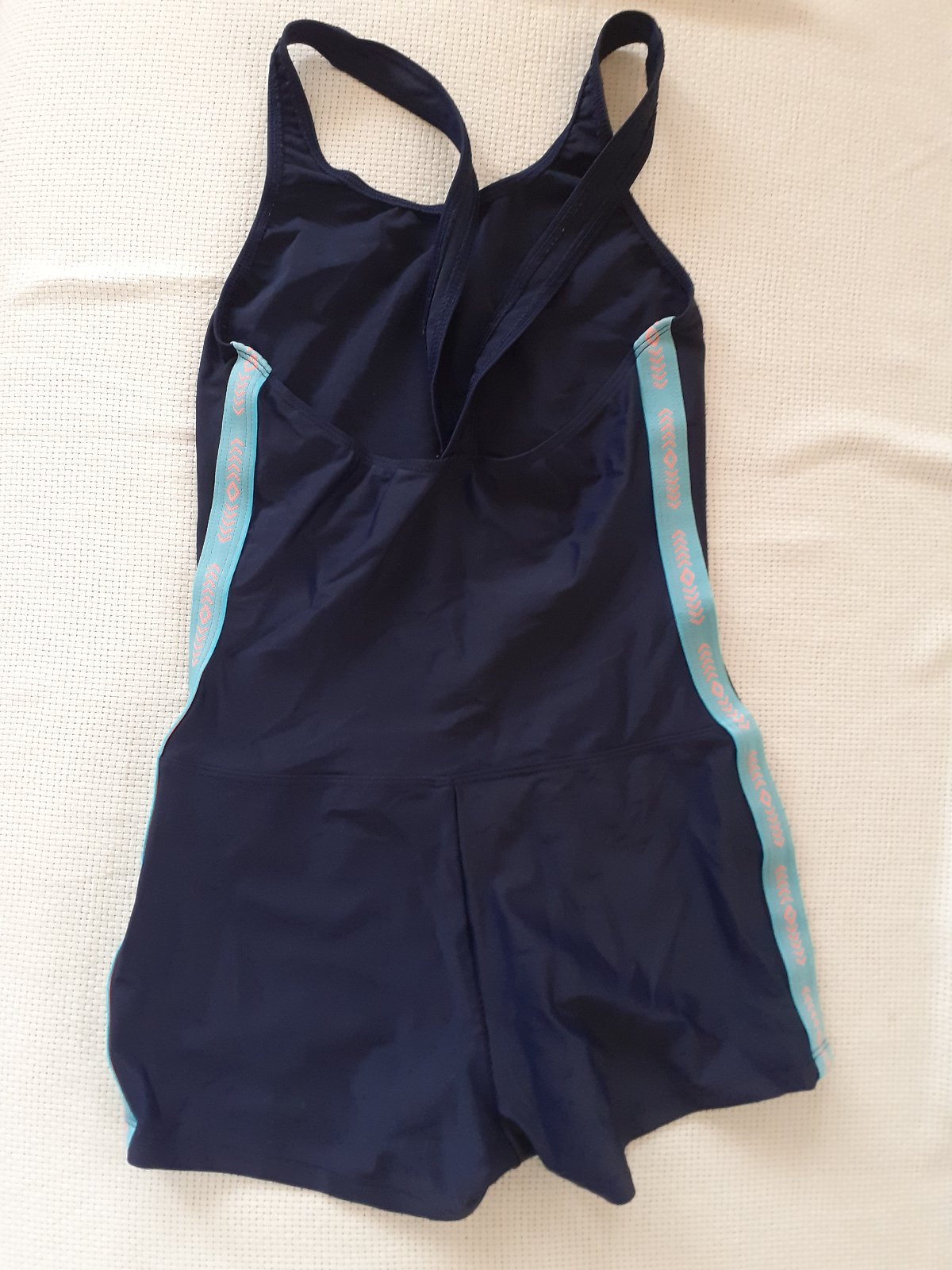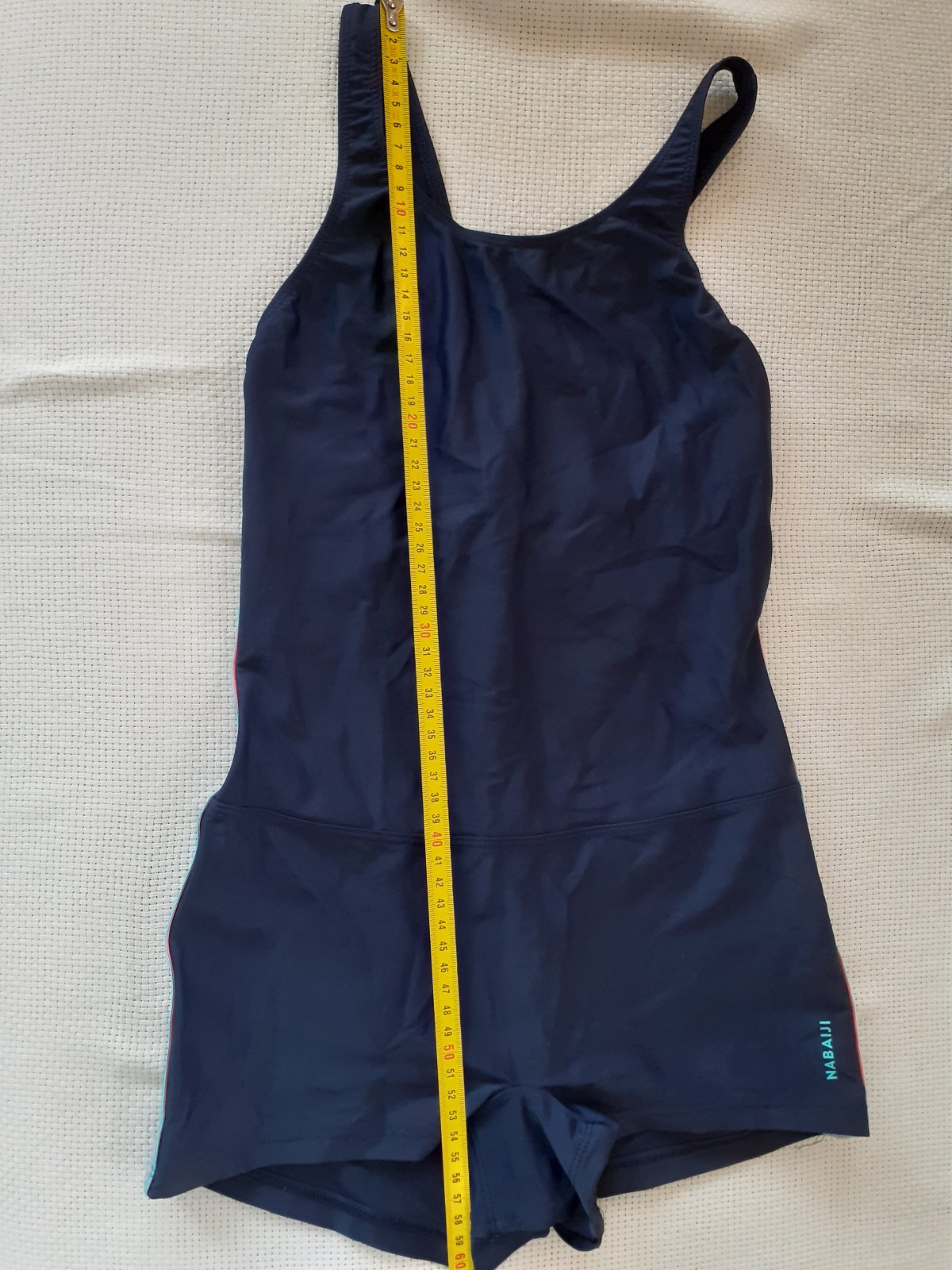 Ponúkam celé plavky tmavomodrej farby s tyrkys.pásikmi v super stave. Uvádzam č. 140 - dcérka nosila na plaveckom výcviku v 4.triede, radšej ale pozrite dĺžku nameranú na fotke.
