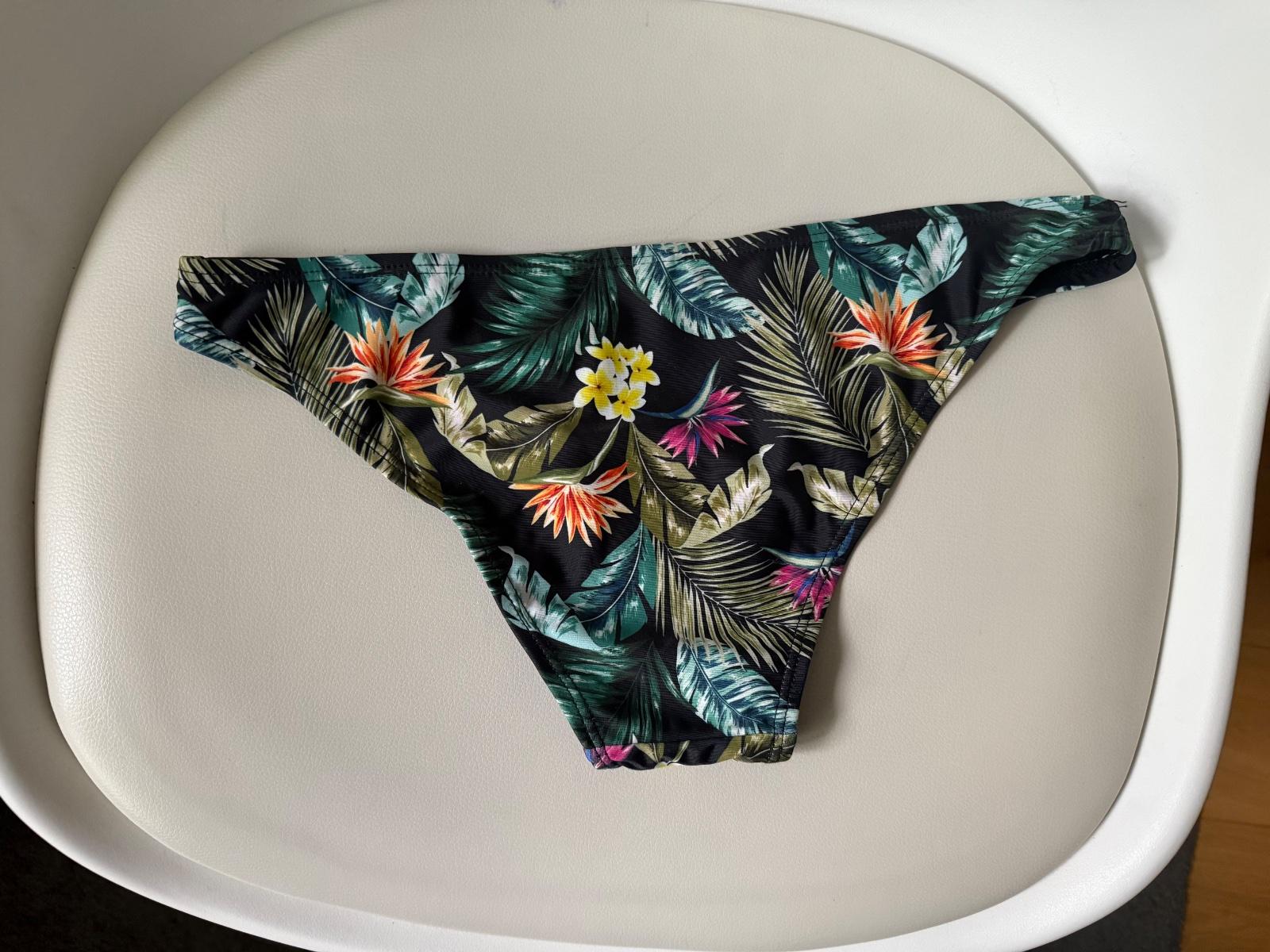 Dvojdielne plavky, veľkosť 36. Vrchný diel mierne vystuženy. Nohavičky tangá.