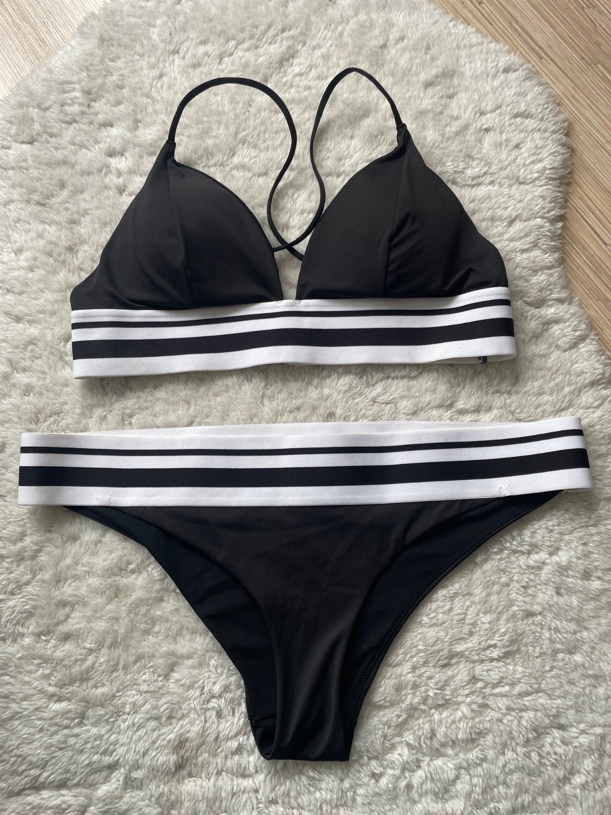 Dvojdielne plavky - trojuholnikova podprsenka s vypchavkami s 5 cm gumou, nastavitelne ramienka a nohavicky s rovnakou gumou, zasivanie na boku, nevidiet. Raz oblecene, rozmery na foto.