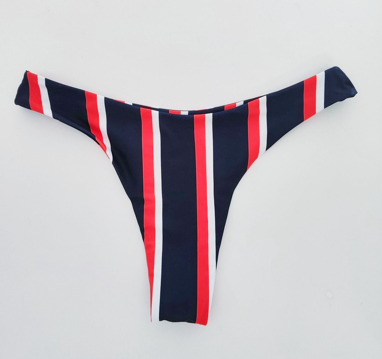 Prekrasne sexi Brazilian Bikini Set plavky v nadhernej bielo modrej namornickej pruhovanej kombinacii farieb s bikinami v sytej cervenej farbe s volanikom ,kosicky s push up vystuzami.Pridavne rami...