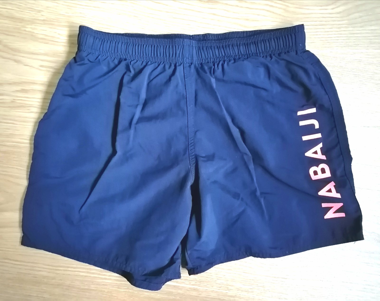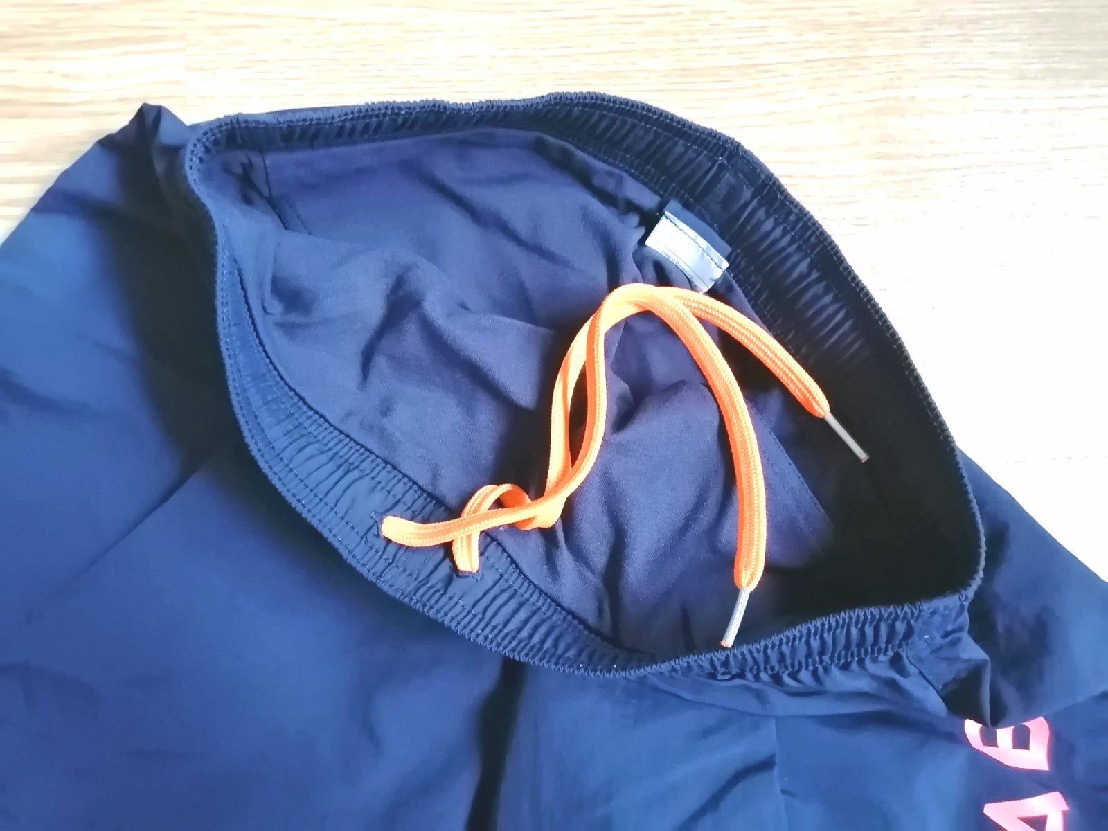 Chlapčenské šortkové plavky od Decathlon, v tmavomodrej farbe s neónovo oranžovým nápisom a šnúrkou.