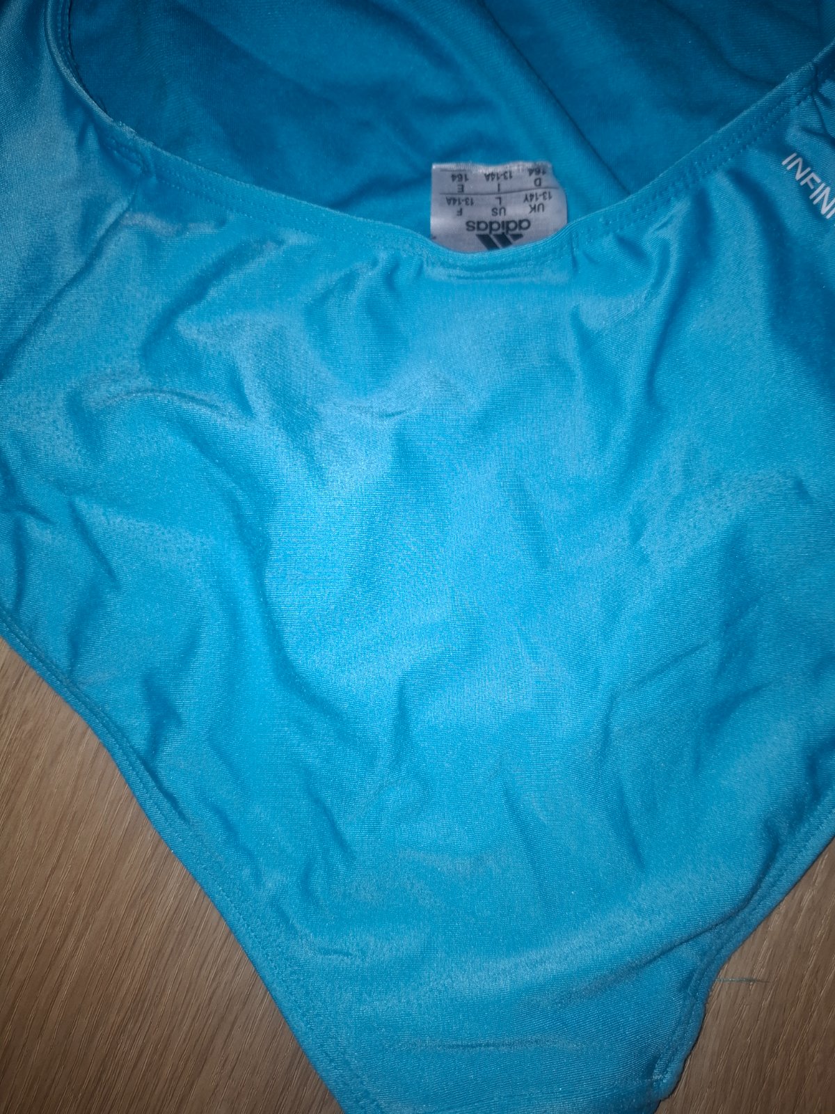 Pekné športové celé plavky používané na jednom plaveckom. Na zadku sú trochu ošuchané, ale nedá sa to odfotit. Píšu veľkosť 164, ale sú menšie, premeriam. Mám k nim aj ostatné veci na fotke.