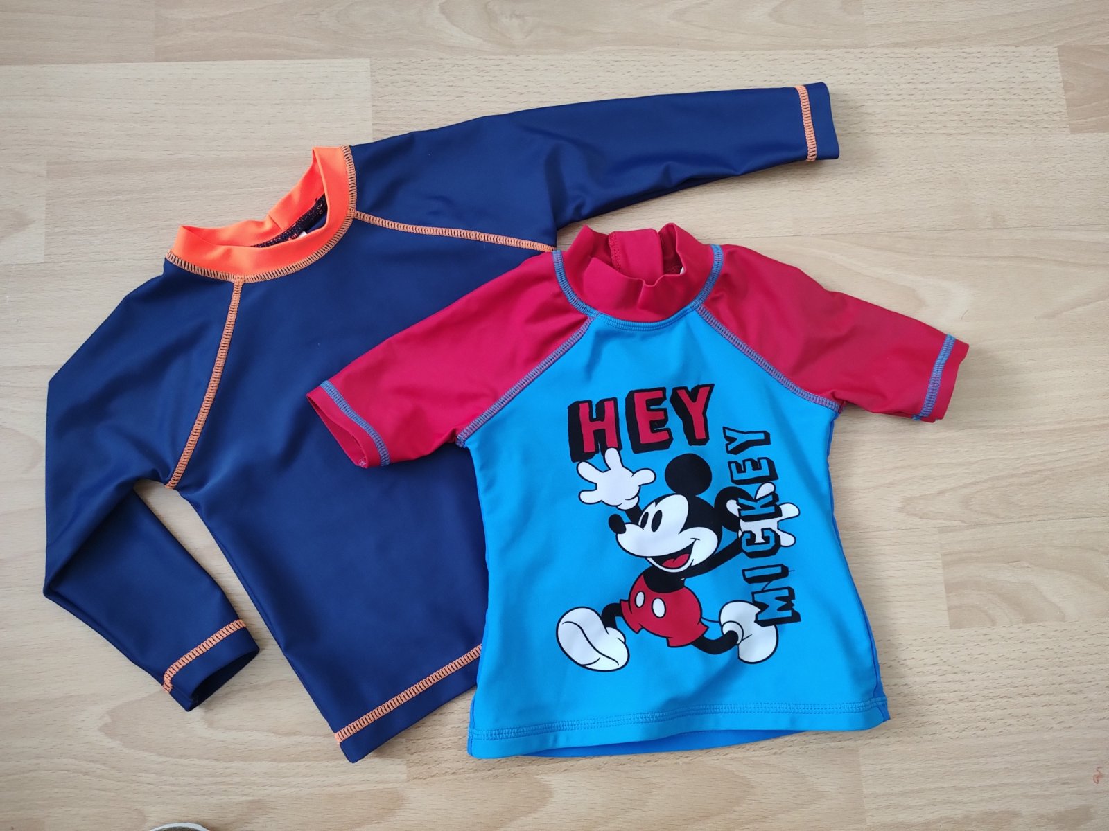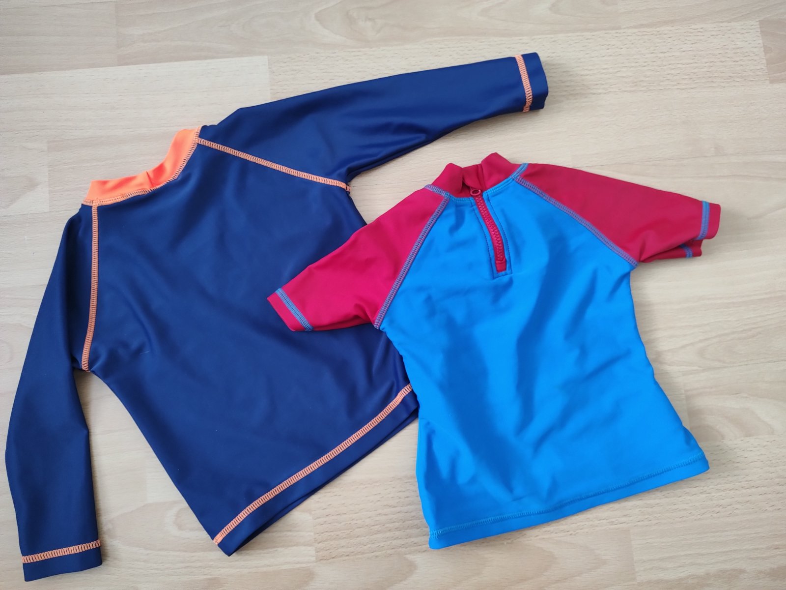 Párkrát použité ochranné tričká do vody..majú uvedenú rôzne veľkosti. No obe nosené v jedno leto. Sedí dobre na velkost 80, jedno voľnejšie druhé obtiahnuté, funkčné obe.