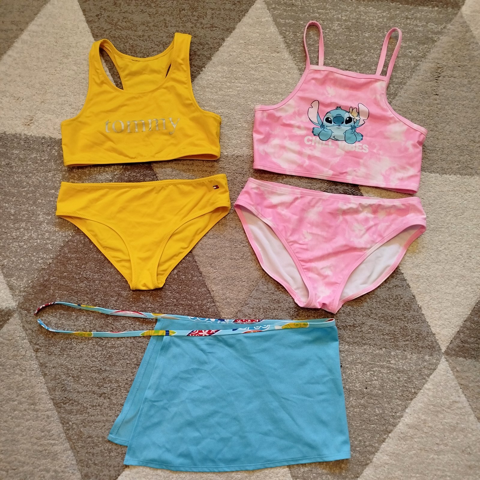 Pekné dievčenské plavky v super stave. Žlté Tommy Hilfiger originál veľkosť 146, nohavičky dĺžka 20cm a pás 31cm, vrchný diel dĺžka 24cm a šírka 29cm. Farba svetlo žltá ako na druhej foto. Ružové F&F s motívom Stitch veľkosť 152, raz oblečené, nohavičky dĺžka 22cm a pás 32cm, vrchný diel dĺžka 30cm a šírka 29cm. Suknička sa dá využiť k akýmkoľvek plavkám, pôvodne sme ju kúpili k tým žltým Tommy Hilfiger, krásne ladí. Cena a predaj LEN SPOLU + pošta.