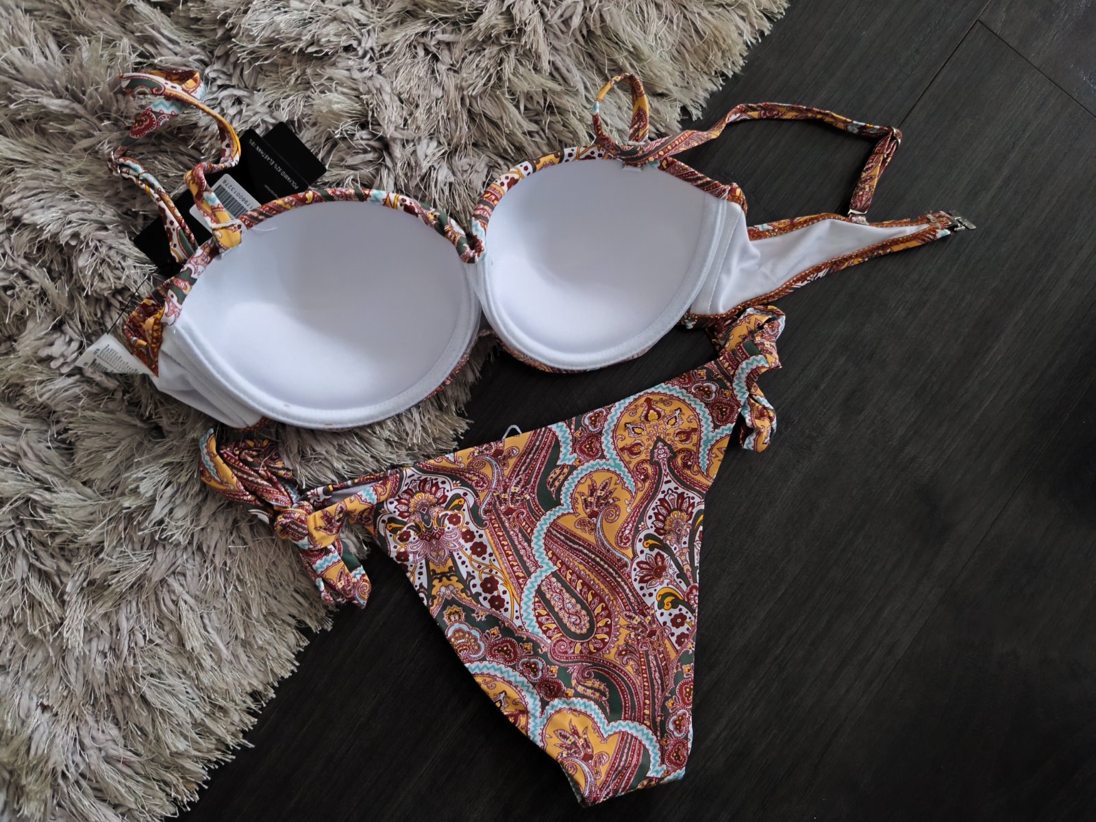 Vystužená push up podprsenka s nastaviteľnými a odnímateľnými ramienkami. Nohavičky klasického strihu s viazaním.