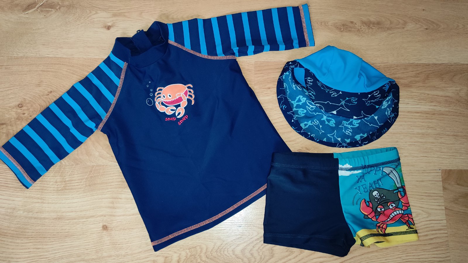 Ponúkam na predaj pekne veci pre chlapca k vode. UV ciapka so závesom cez krk, kuracie tričko a plavky. Nosené máličko, bez akýchkoľvek poškodení, zatrhnuti, nesprane. Cena 8 eur.