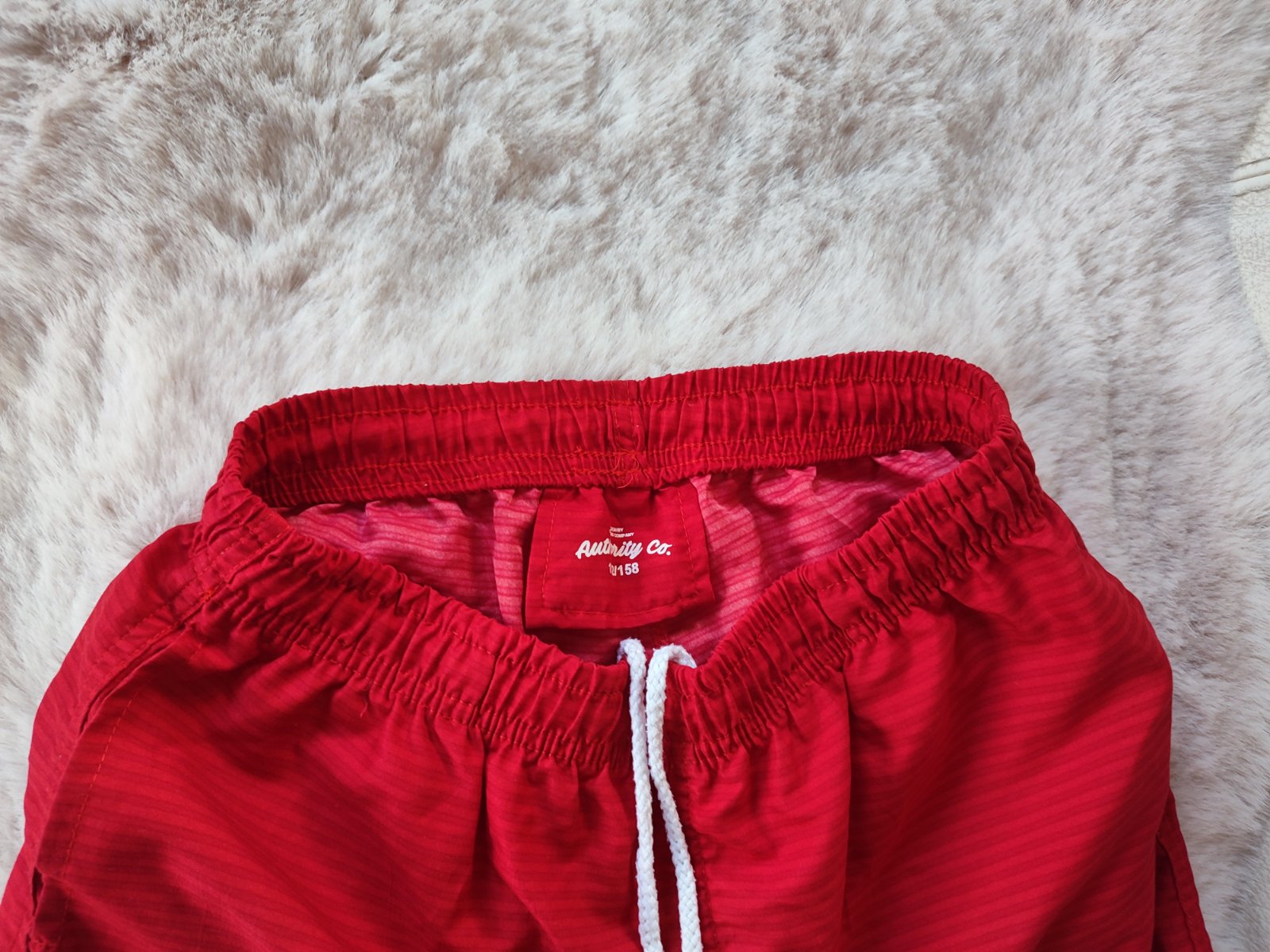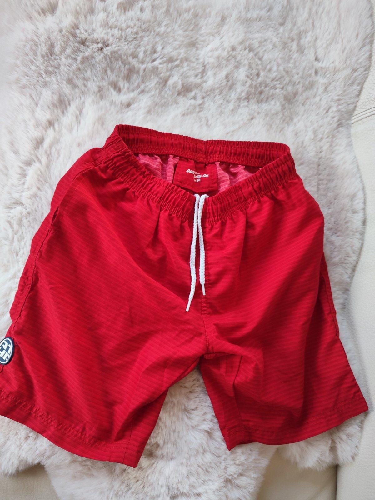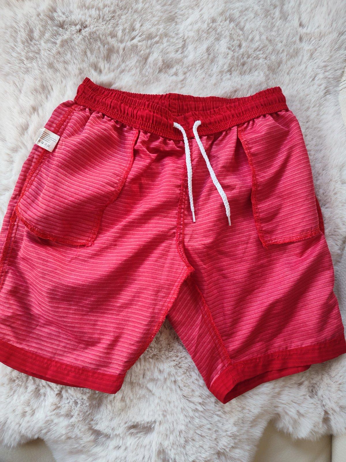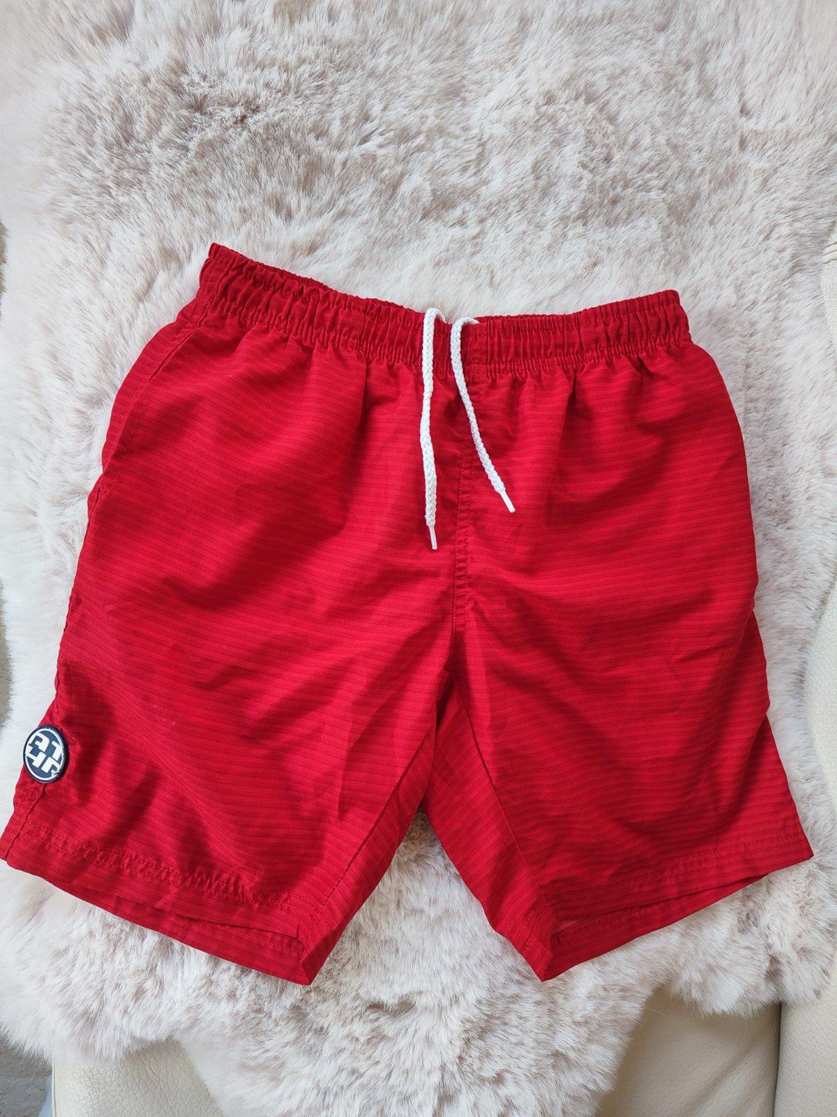 Takmer nenosené šortky na kúpanie. Kupované nové v Tchibo. Farba: tmavomodrá-červená. Veľkosť 158/164. V páse guma + sťahovacia šnúrka. Vrecká, vnútri podšívka zo sieťoviny. Bez akýchkoľvek poškode...