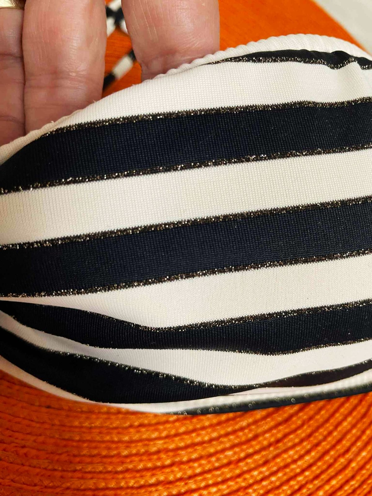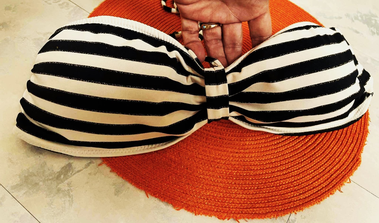 zaujímavý variabilný vršok k plavkám, dnu vkladateľná jemná výstuž,pri pásikoch je jemný lurexový prúžok,super k opálenej pleti,kombinácia čiernej s bielou,,na vrchu podprsenky perfektná gumička,ktorá pevne drží okraje a drží prsia