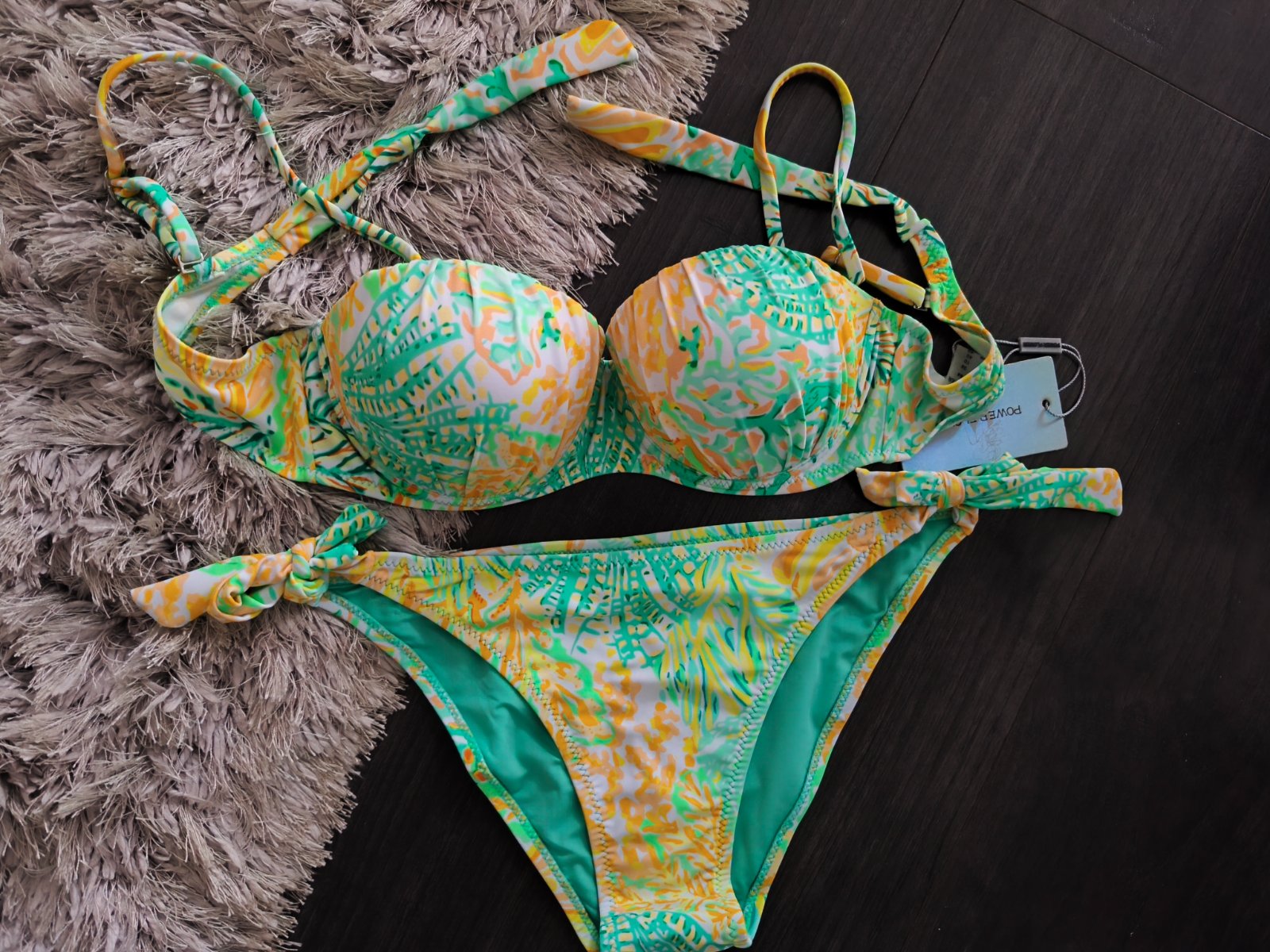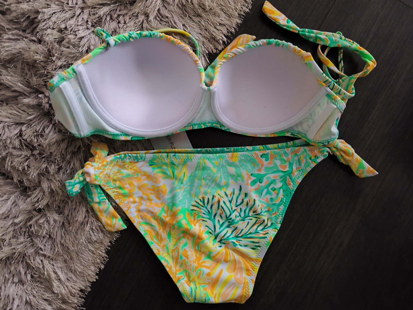 Vystužená podprsenka bez push up, sedí na plnšie prsia. Odnímateľné a nastaviteľné ramienka. Nohavičky s viazaním, veľkosti sedia. Tovar s visačkou.