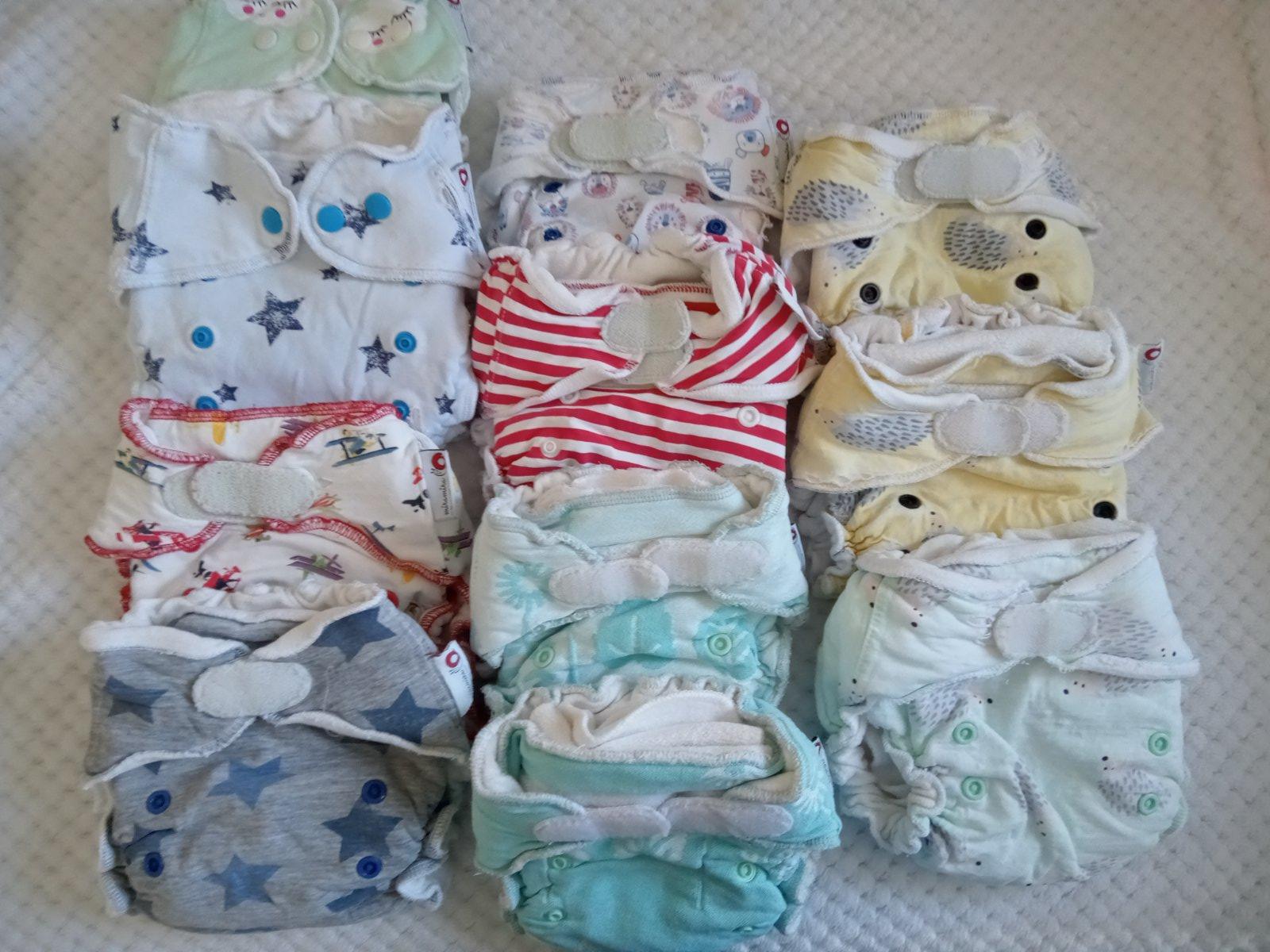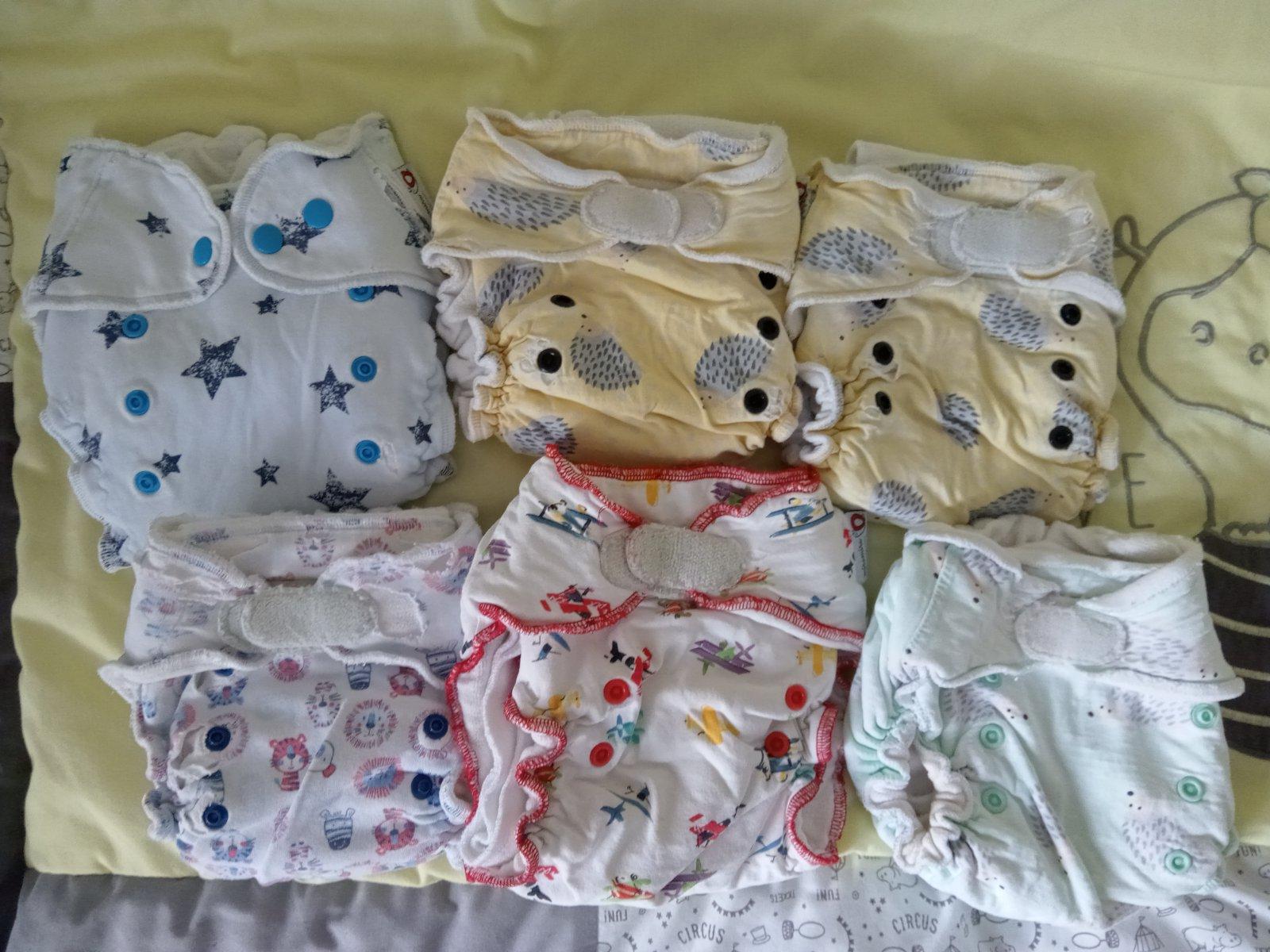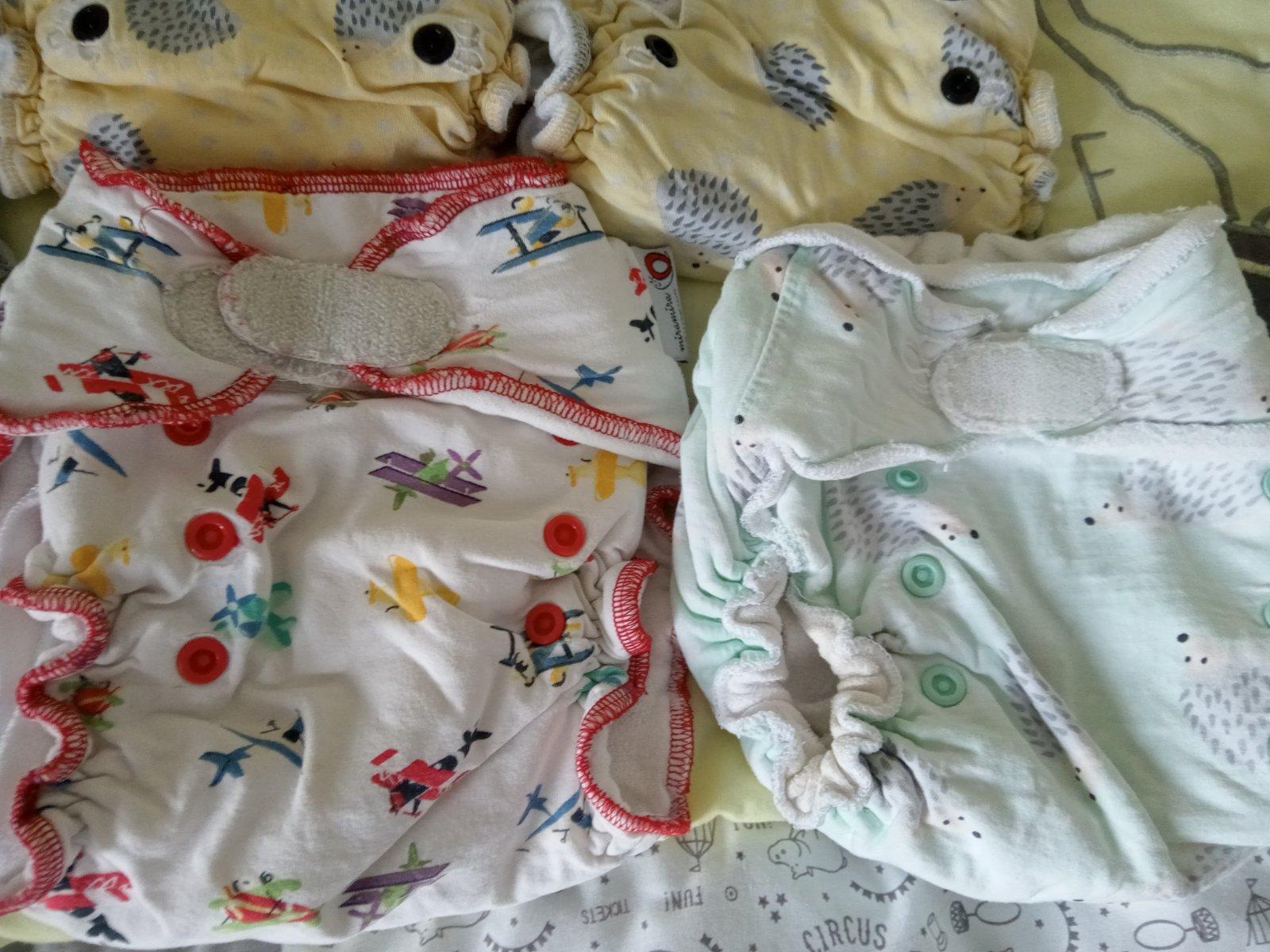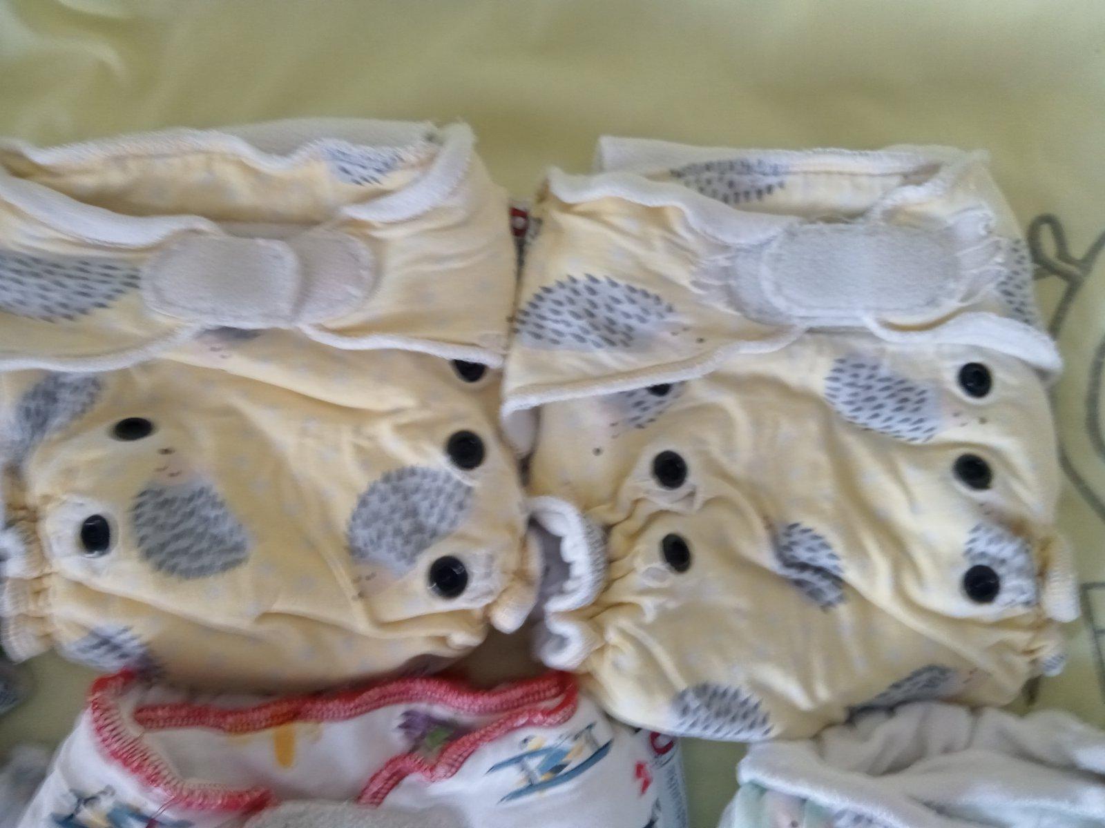 Plienky sú po 2 deťoch. Niektoré sú bazárové. 2 plienky vľavo hore sú na patenty, ostatné sú na suché zipsy, ktoré držia. Niektoré už slabšie. 6 plienočiek na žltom pozadí už majú na niektorých miestach natrhnutý bavlnený úplet, ale pri používaní to nevadí. Hviezdičková má povolenú gumičku. Každá plienka ma aj dlhú bambusovú vkladačku. Všetky nedostatky sú zohľadnené v cene. Cena je 15€ za všetky.