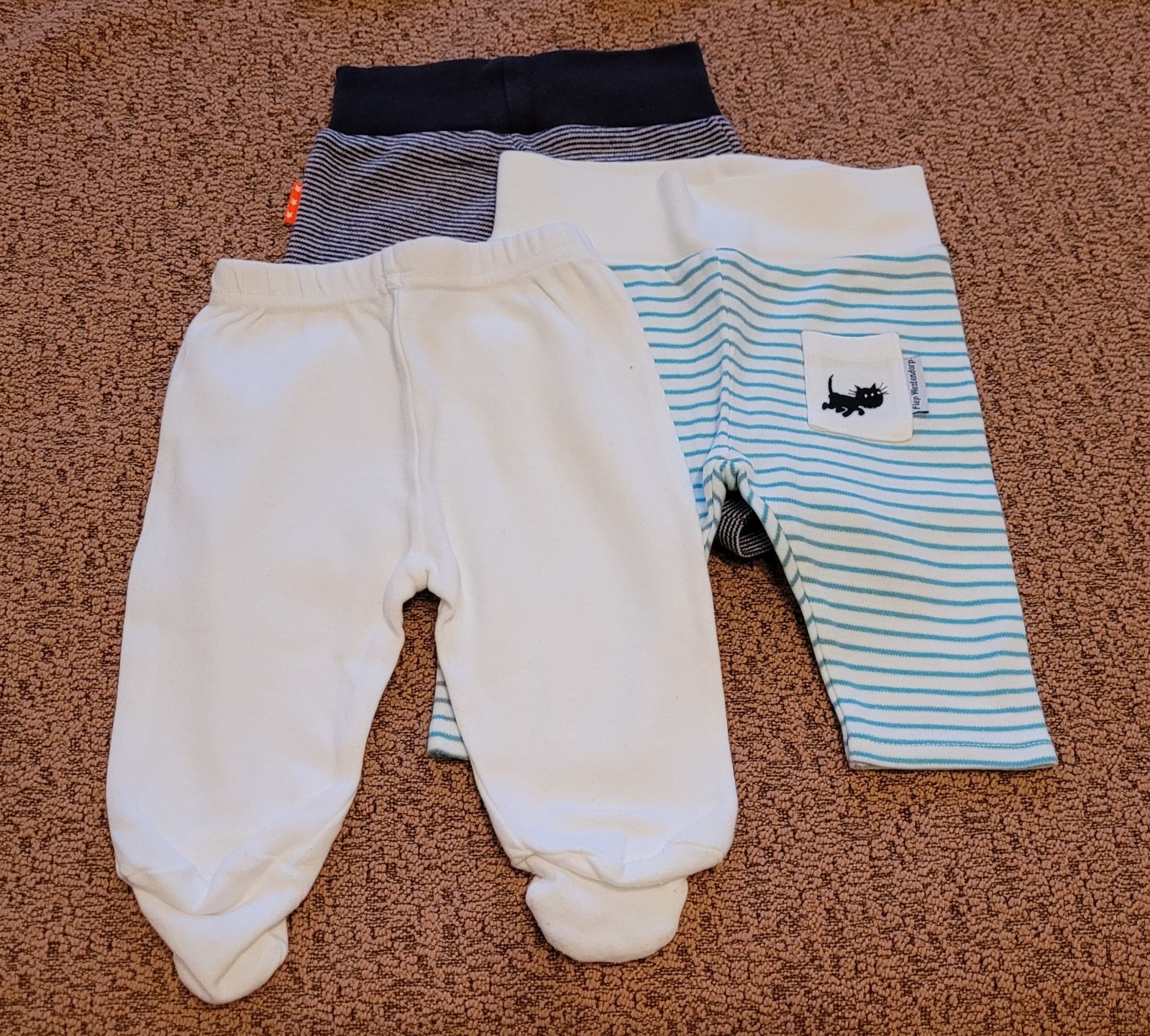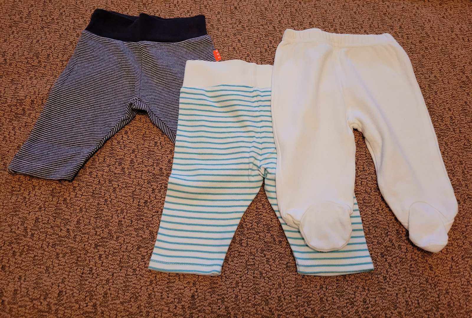 Polodupačky a modro-biele tepláčiky veľ. 50-56. Tepláčiky so zelenými pásikmi veľ. 62.