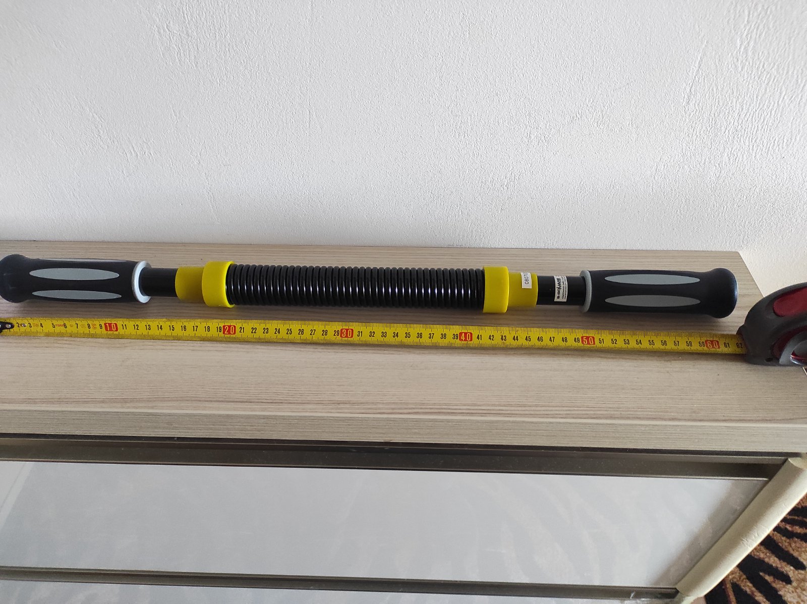 Fitness pomôcka na posilnenie svalov hornej časti tela. Silou je potrebné tyč ohnúť - nie je to ľahké, nakoľko tyč je v strede zložená zo silnej odporovej pružiny. Posledný obrázok na ilustráciu cvičenia. Náradie je vhodné aj pre ženy. Dĺžka tyče 60 cm. Tyč je vo výbornom stave, ako to už býva, bola som lenivá ju aj používať, takže je ako nová.
