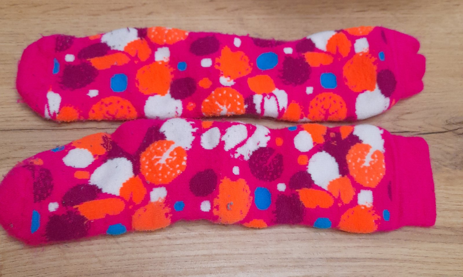 Predám pekné neonovo ružové hrubé ponožky do lyžiarok oranžové guľky svietia v tme, veľkosť 27-30, málo nosené. Jemné žmolky. Nie sú to podkolienky.