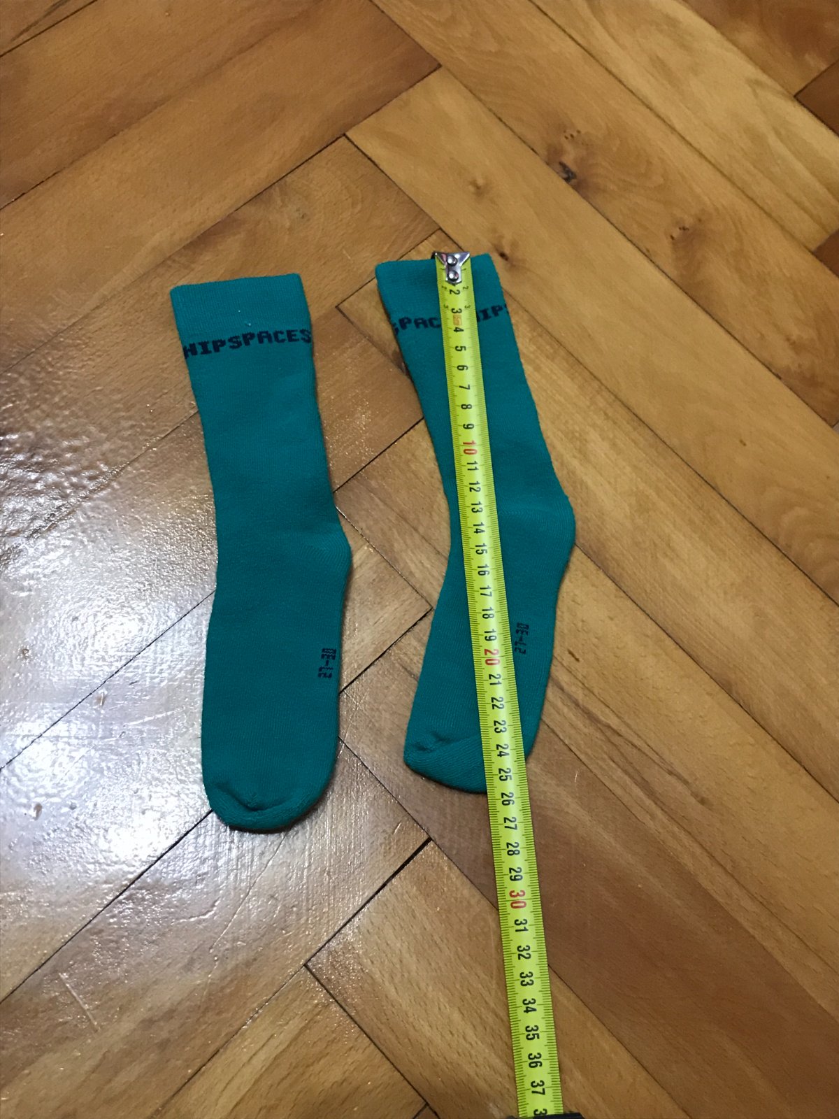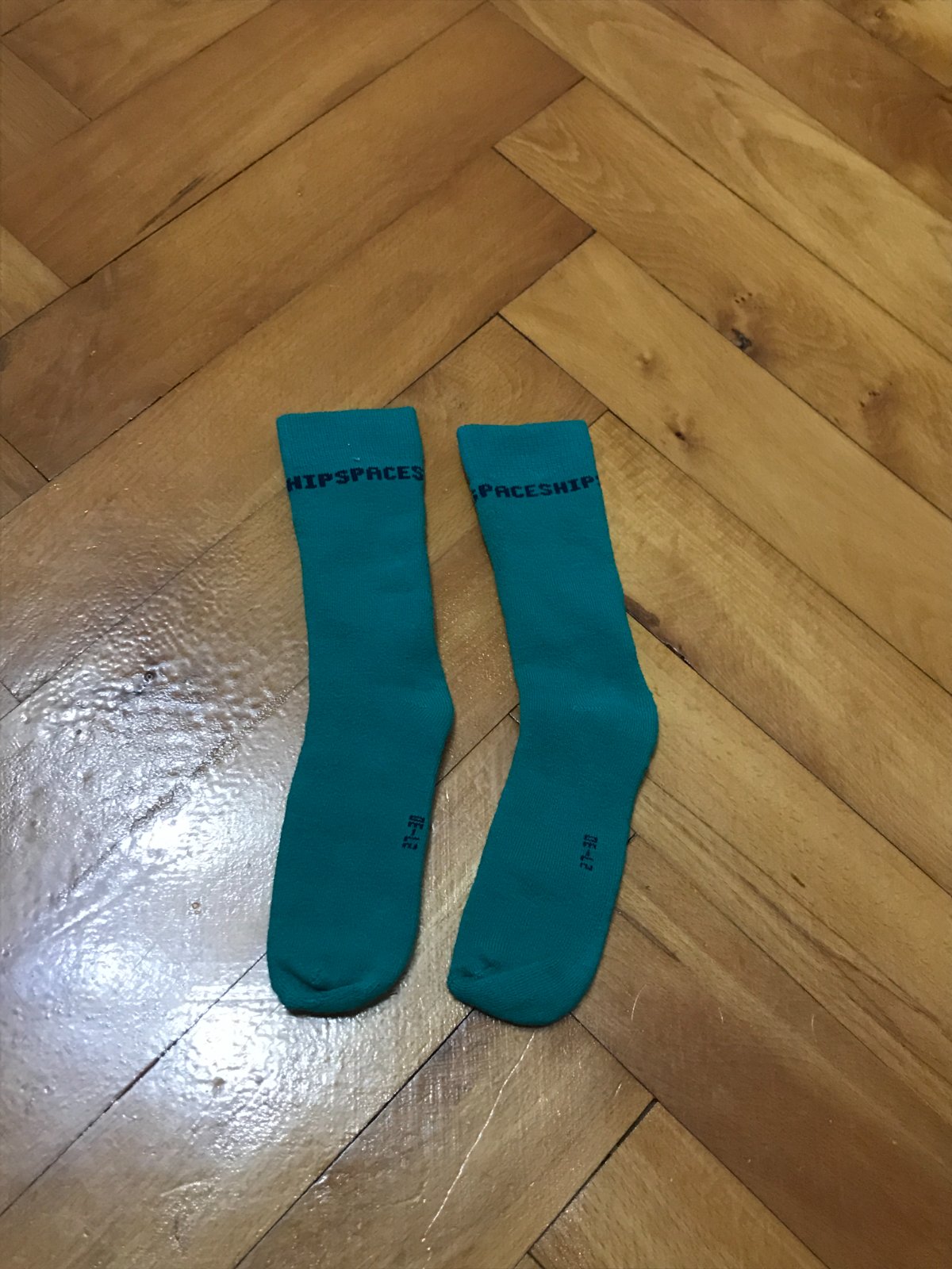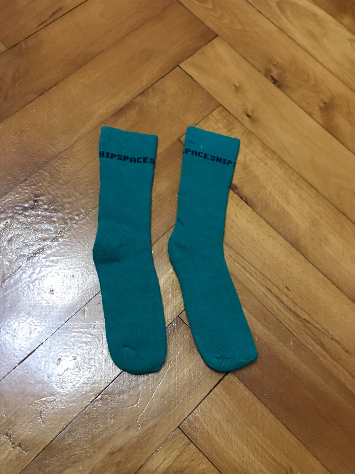nápis: čierny nápis "SPACESHIP" na hornej časti ponožiek