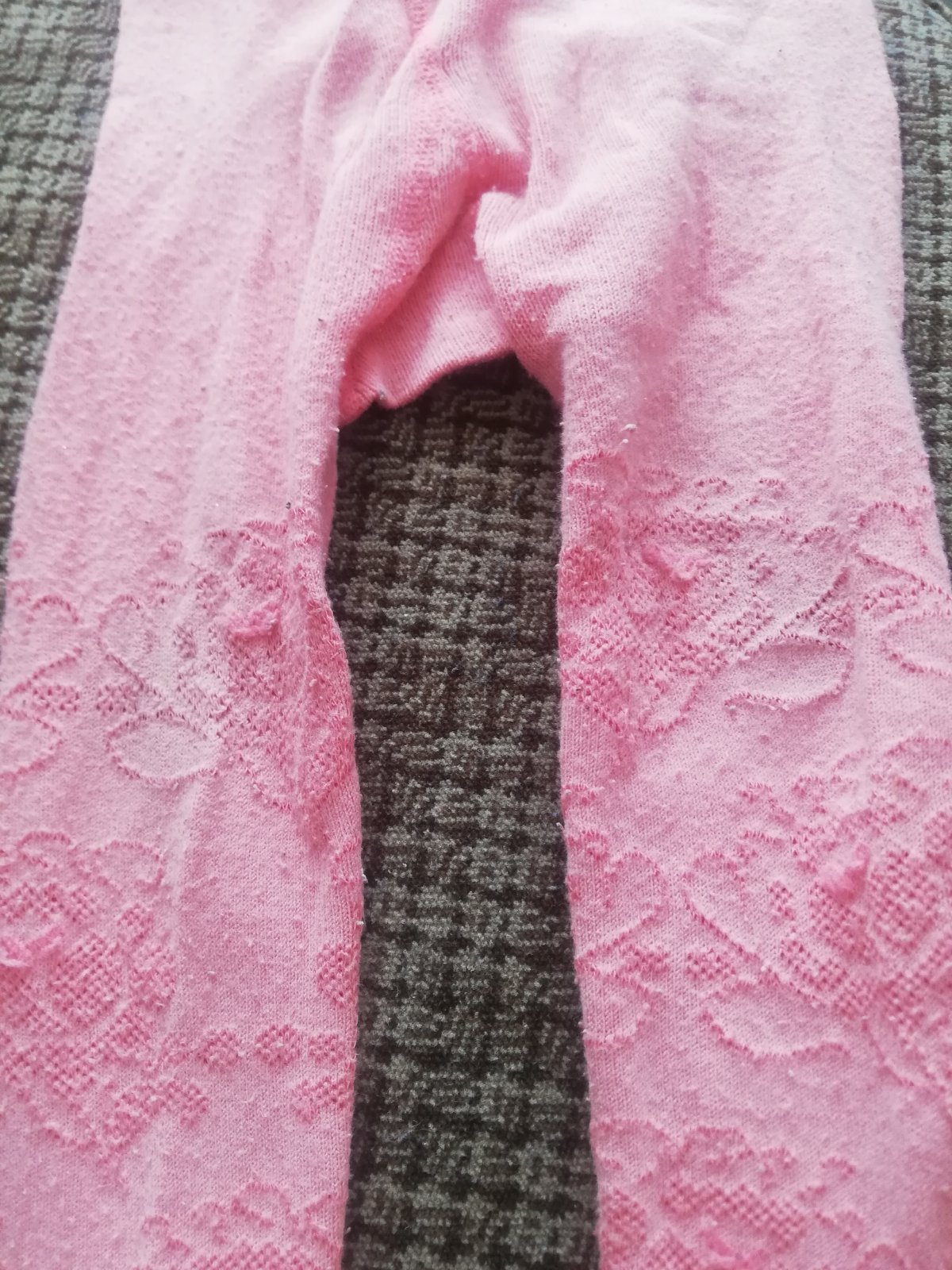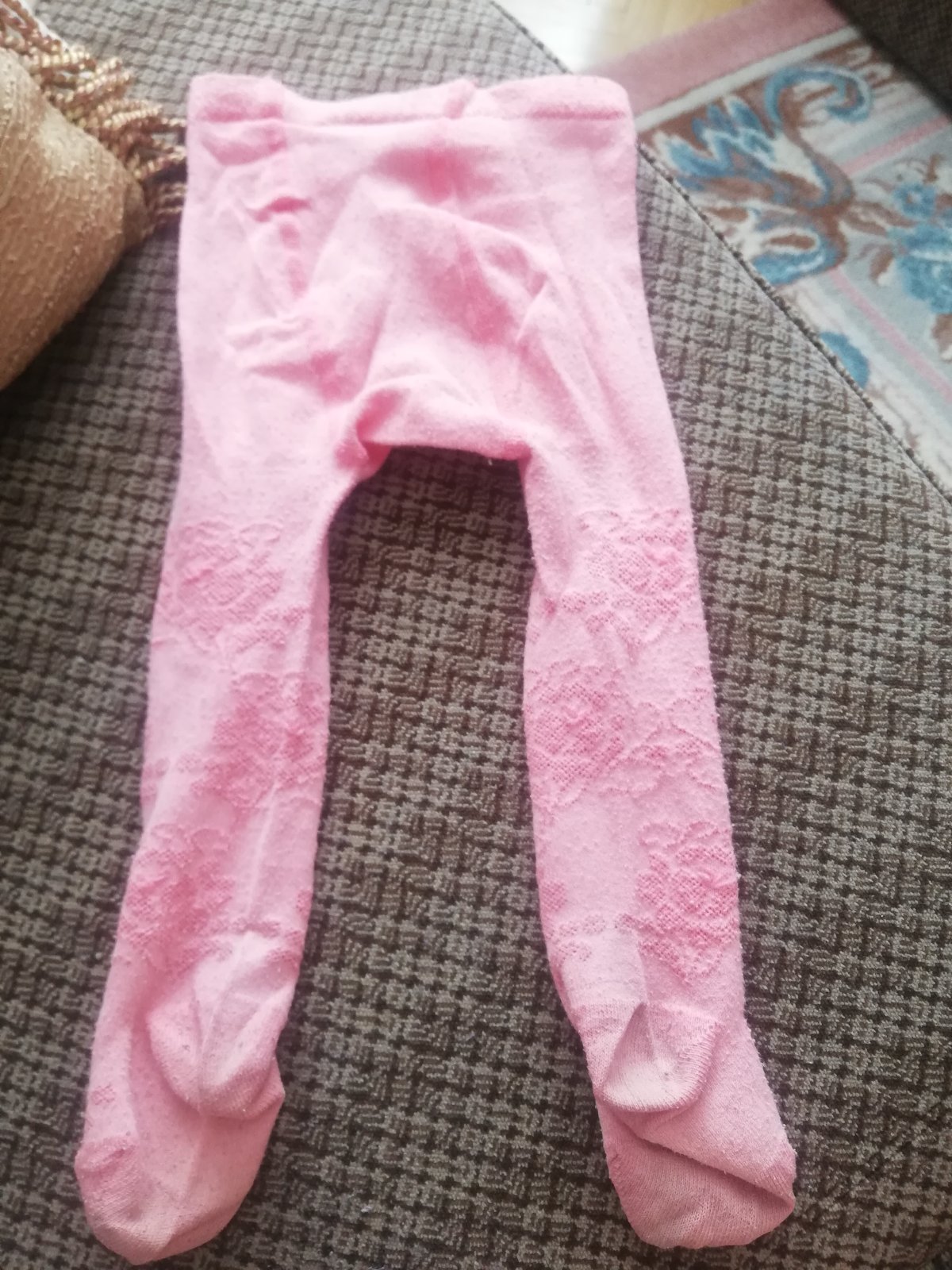 Predam pekne puncosky. Maju bezne znamky nosenia, jemne zmolky z prania, a na kolienkach a chodidlach uz nie su celkom ako nove, ale daju sa v pohode pouzit, nie su nikde roztrhane. Celkova dlzka v klude je 41cm.