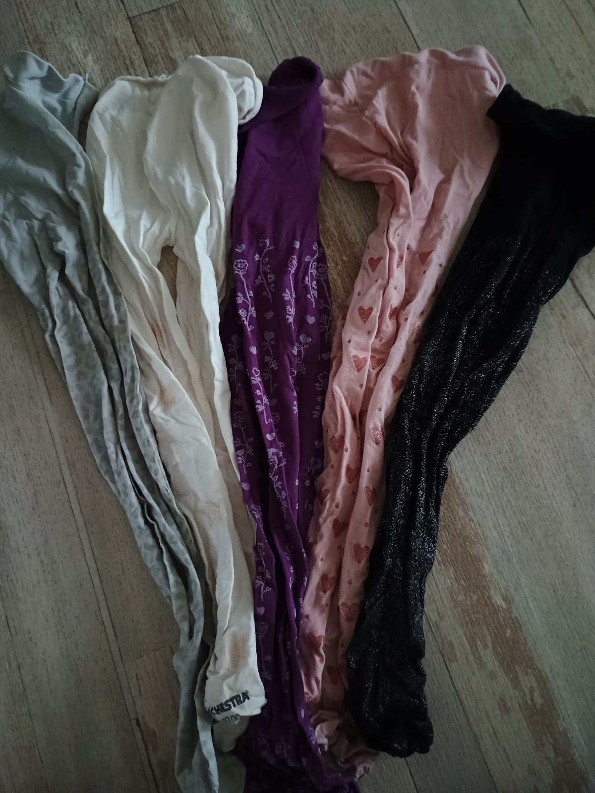 Nosili sme pri veľkosti 110_116 čierne trblietavé majú zašitú dierku , ružové so srdiečkami obľúbené, fialové minimálne nosené, rovnako aj biele aj sivé párkrát vzaté. Nosenie vidieť na foto