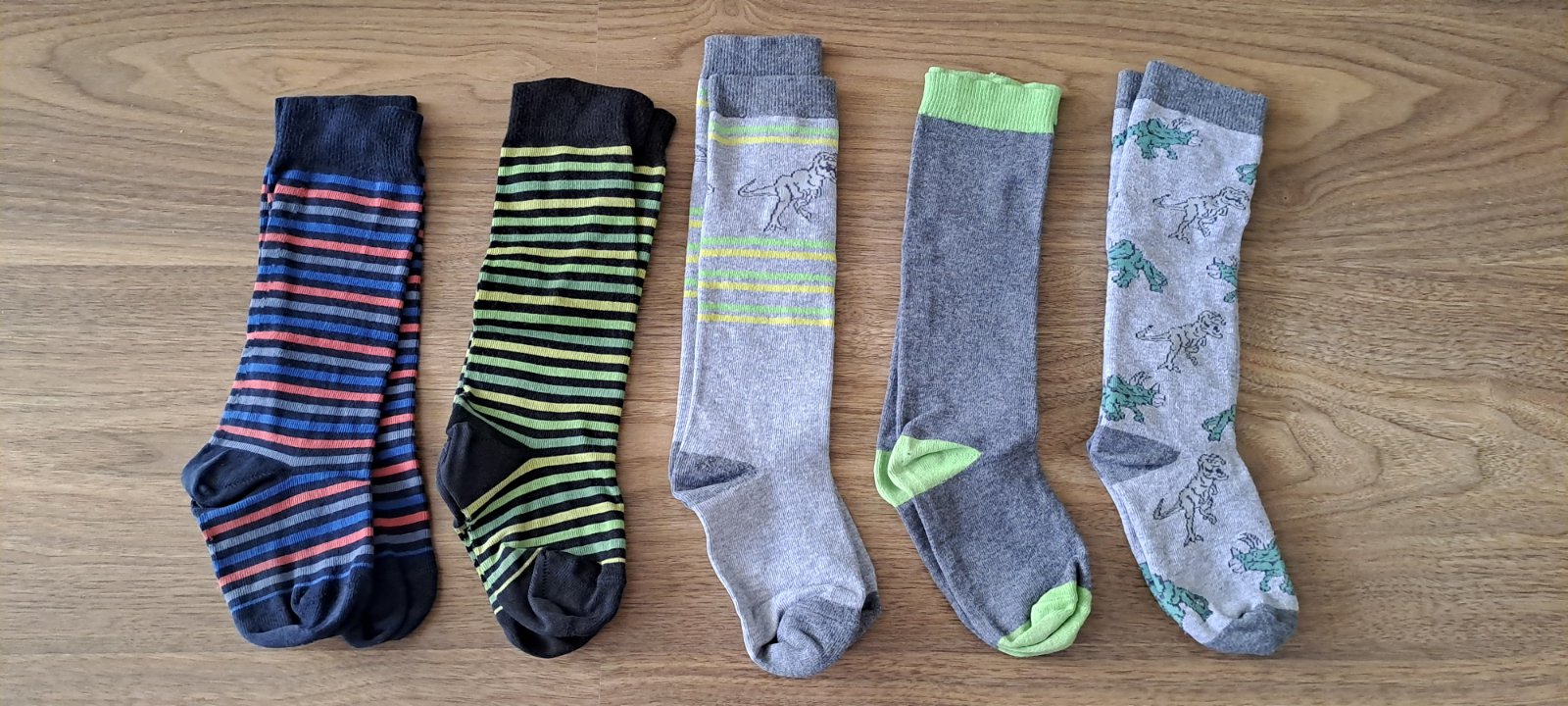 Ponúkam na predaj podkolienky/dlhé ponožky pre chlapcov (5 ks). Motív dinosaurov (3 ks/set) a pásikavé (2 ks), veľ. 98/104 (3-4 roky). Nosené, ale bez poškodenia. Dobre sedia na nohe. Príjemný materiál. Cena 2€/5 ks.