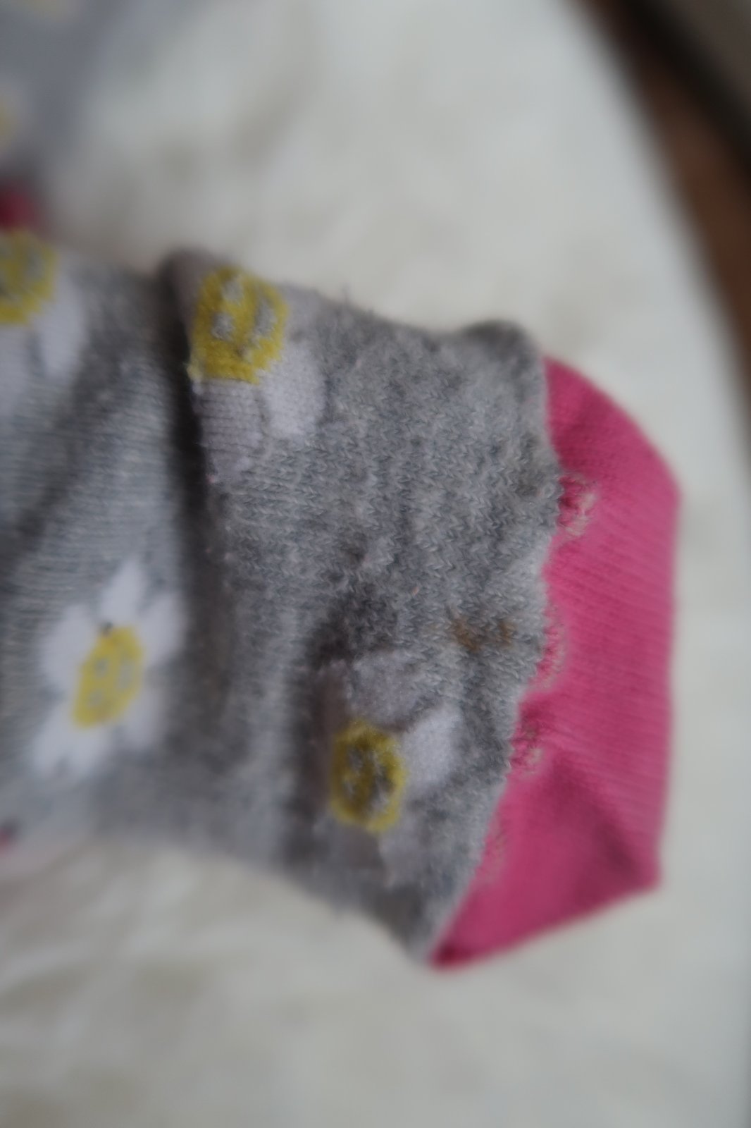 Valašské ponožky- vyrobeno v ČR. Pěkné motivy. Žmolky a na jedné ponožce flíček viz. foto. Velikost psaná 22-24, ale nám už při nožce 23 byly malé.