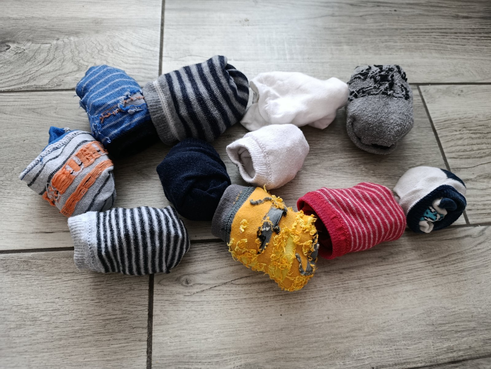 V peknom zachovalom stave Šedo modré sú podkolienky , alebo vyššie ponožky. Žlte dedoles, malé zatiahnutie, skôr na doma, tiež aj červené. Ostatné nosené do škôlky, ďalej nositeľné.