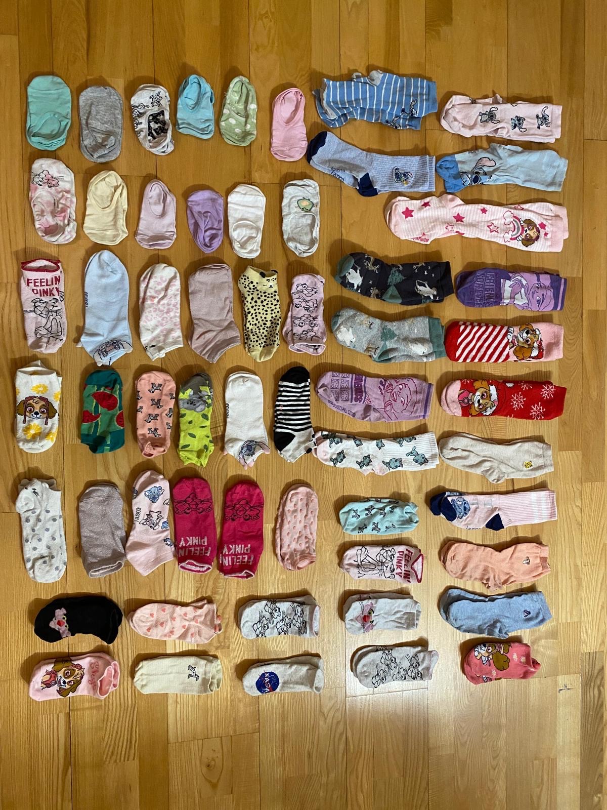 Ponožky, ťapky a členkove ponožky. Niektoré sme ani nestihli použiť. 57 párov. Velkost 30-35