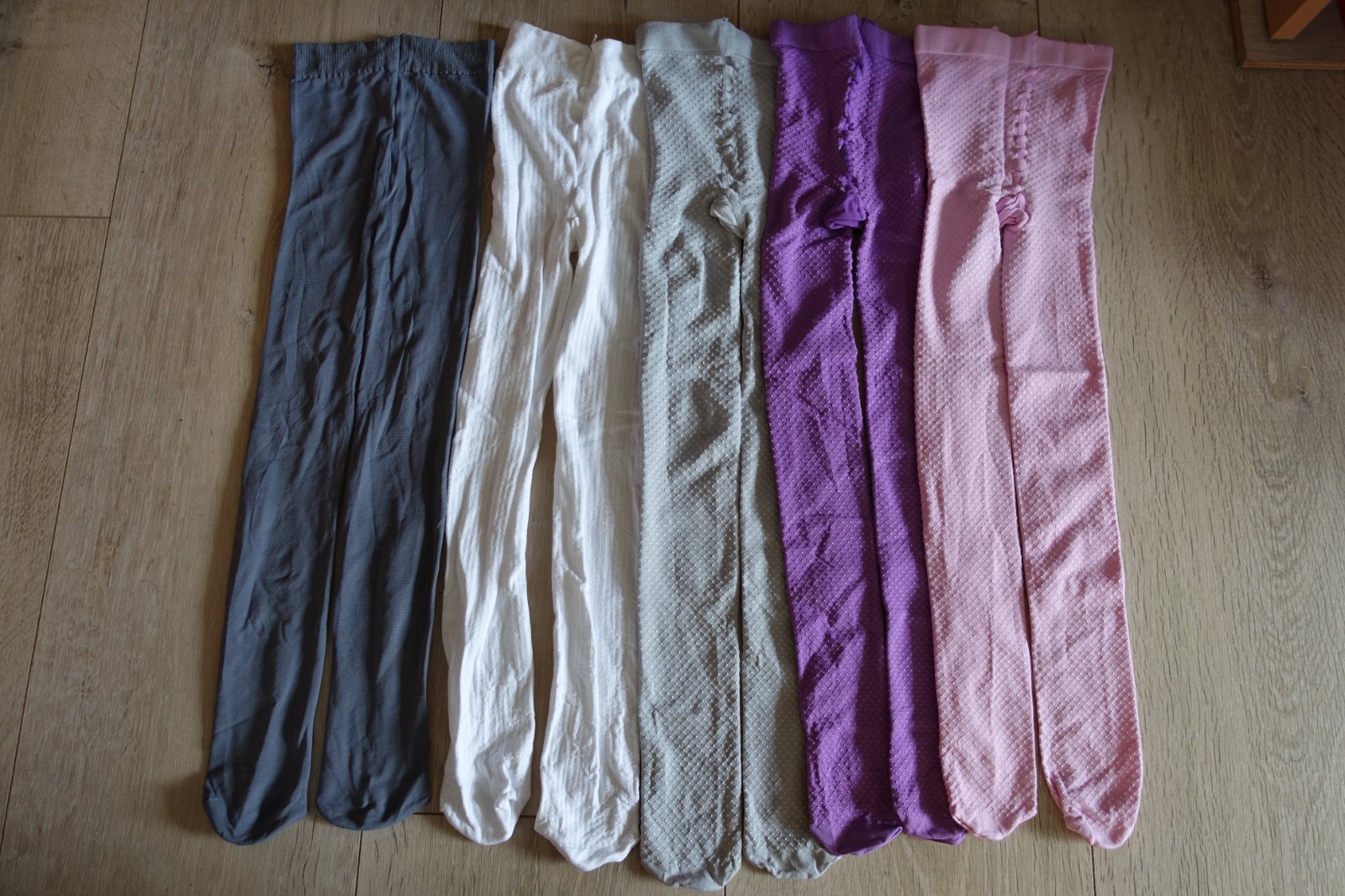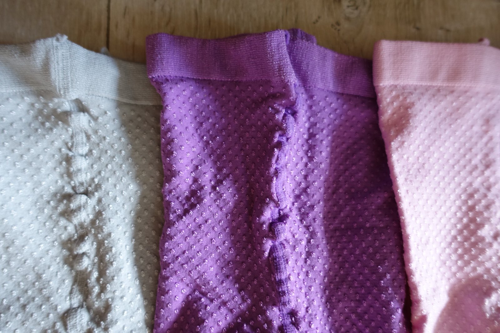 - 3 ks silónky fialová, ružová a svetlo šedá - sú stredne hrubé, vhodné na prechod s lesknúcimi sa guličkami. Veľmi krásne, kvalitné, kupujeme ich už na roky. Veľmi kvalitné, neroztrhnú sa, hrubšie pri prštekoch, medzi nôžkami sú posilené pridaným švom, sú pohodlné. Odporúčam. Dĺžka 67 cm a šírka pásu 17,5 cm. Cena za 1 ks 3,50 e.