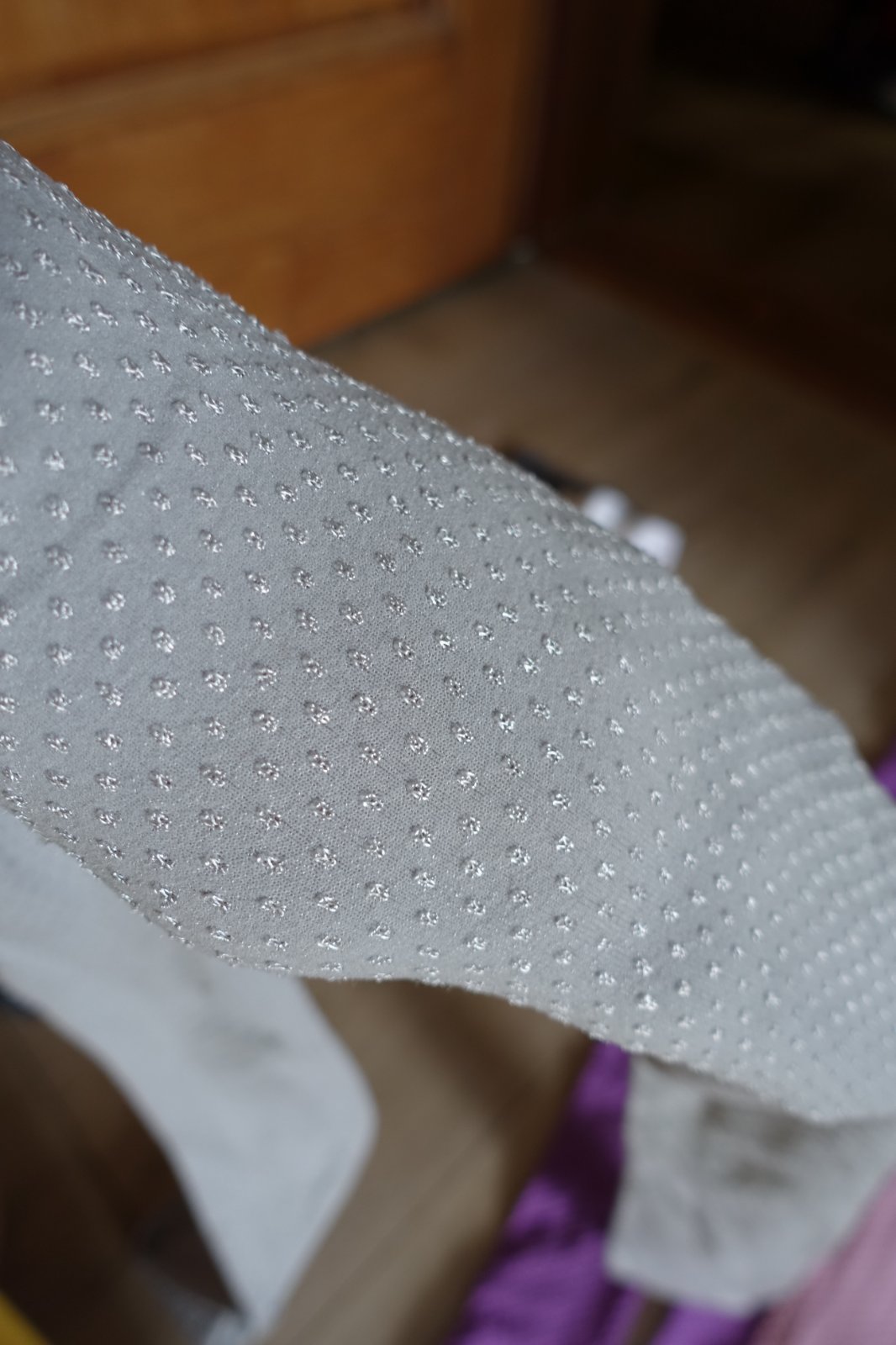 - biele stredne hrubá silónka, majú jemné pásiky, ktoré sa na slniečku lesknú - dĺžka 67 cm a šírka pásu v kľude 16 cm. Cena 2,50 e,