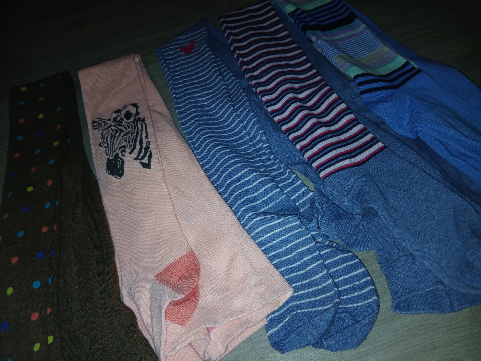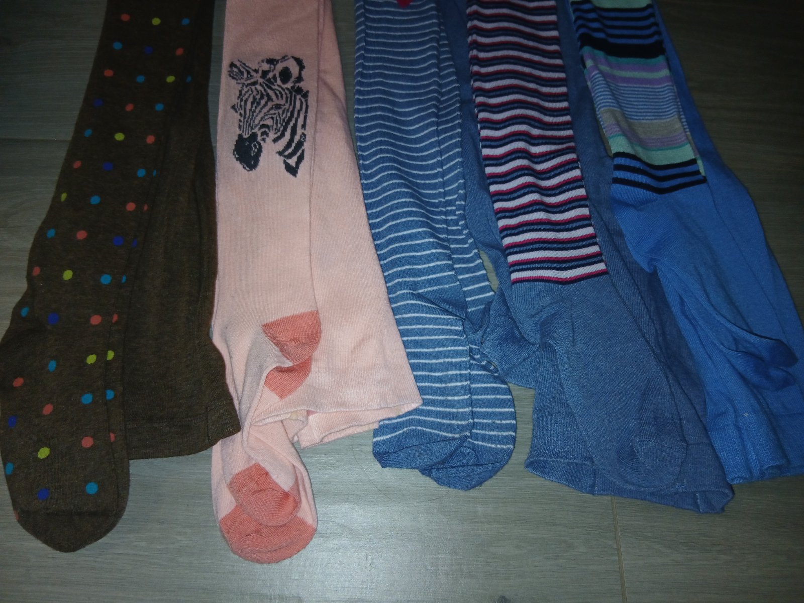 Vsetky len skladovane,nenosene,len vyskusane,ziadne znamky nosenia,len pasik so srdieckom medzi nohami pri skusani pustil svik,zasite,nevidno,pasik ruzovo modry pustil svik na pase pri skusani,nam boli malekupovane v roznych obchodoch,zlozenie uvadza bambus, bavlna,elastan,dlzky od 103cm v klude vyssie,nemeriam,cena spolu symbolicka