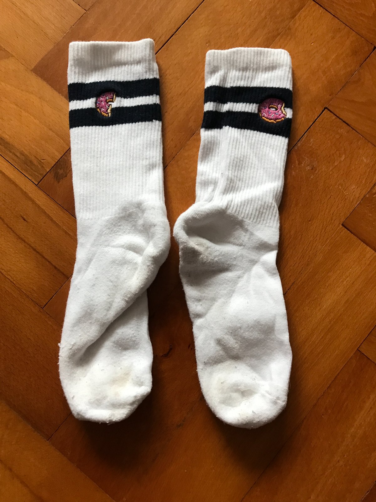vyšité farebné logo donutku na každej ponožke – originálny a hravý detail